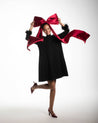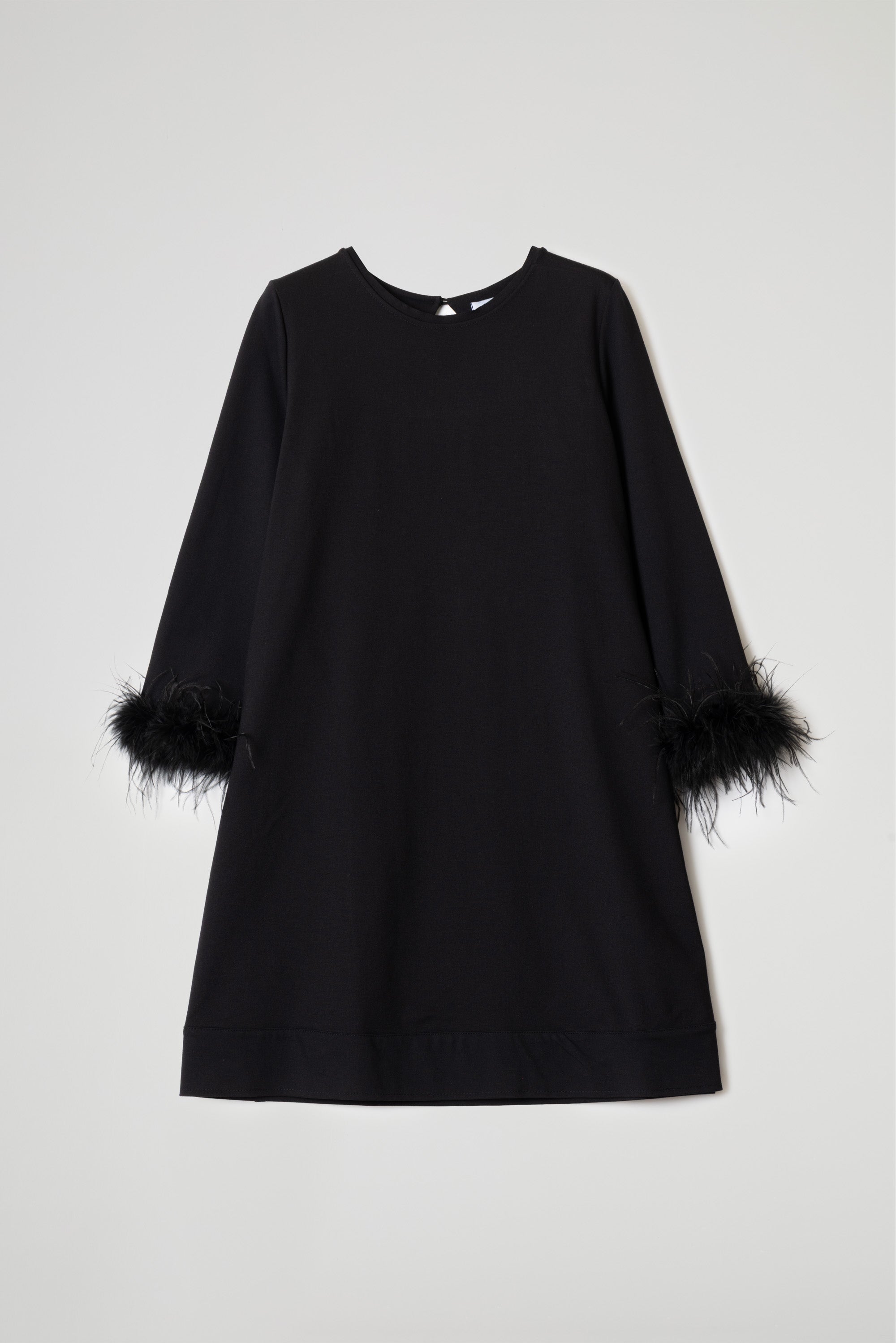 Abito midi, girocollo semplice sul davanti, apertura a goccia sul retro chiusa con piccolo bottone tono su tono, maniche a tre quarti impreziosite da piume nere , tasche a filo, linea leggermente svasata verso il fondo con orlo rifinito alto. Linea ampia