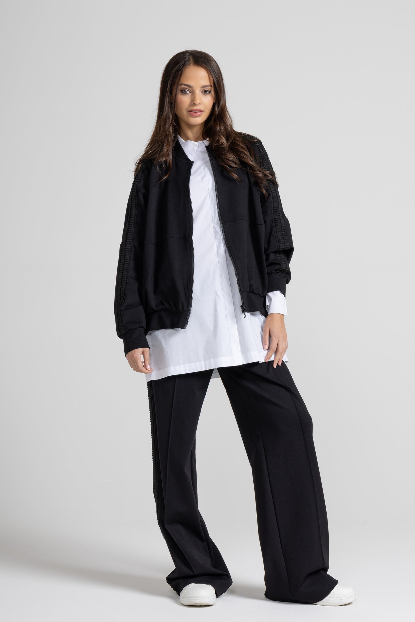 BOMBER IN PUNTO MILANO DI VISCOSA, DETTAGLIO TAGLIO CENTRALE RIBATTUTO, MANICA LUNGA, POLSO E FONDO RIBATTUTI ALTI, DETTAGLIO PASSAMANERIA SU LUNGHEZZA MANICA.