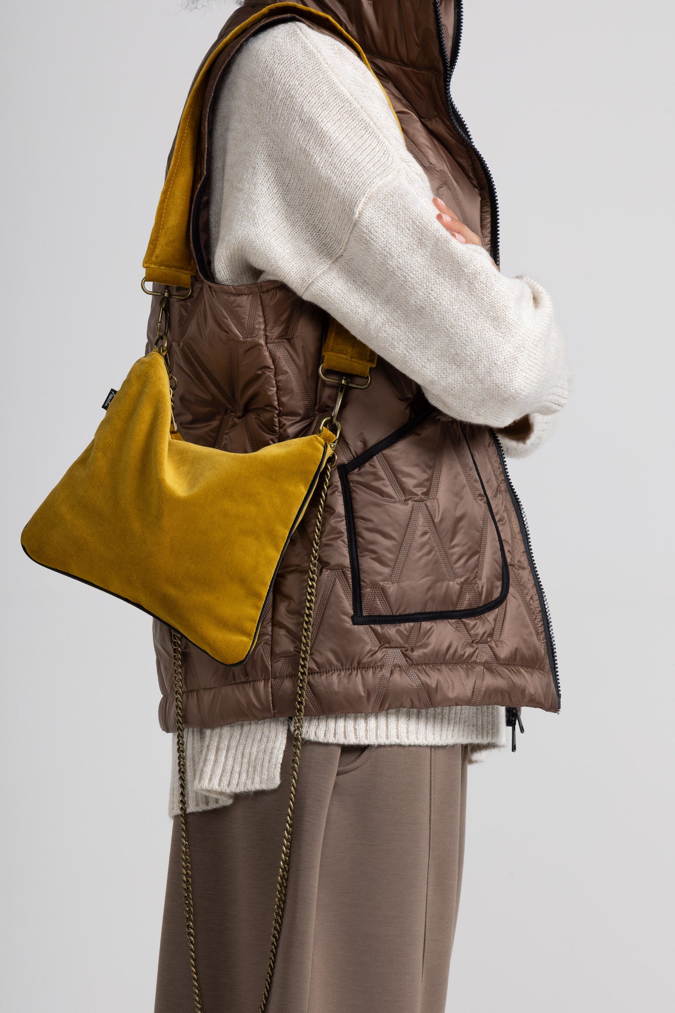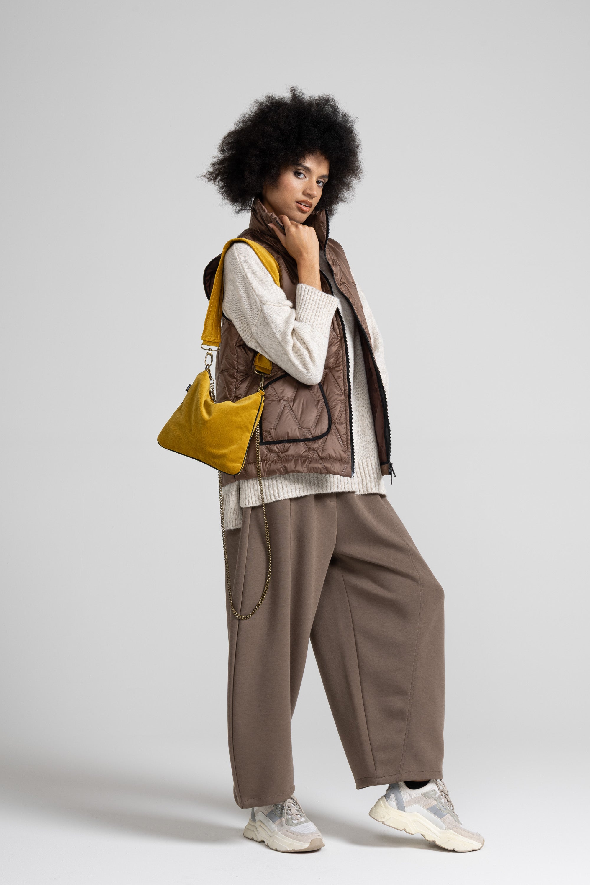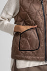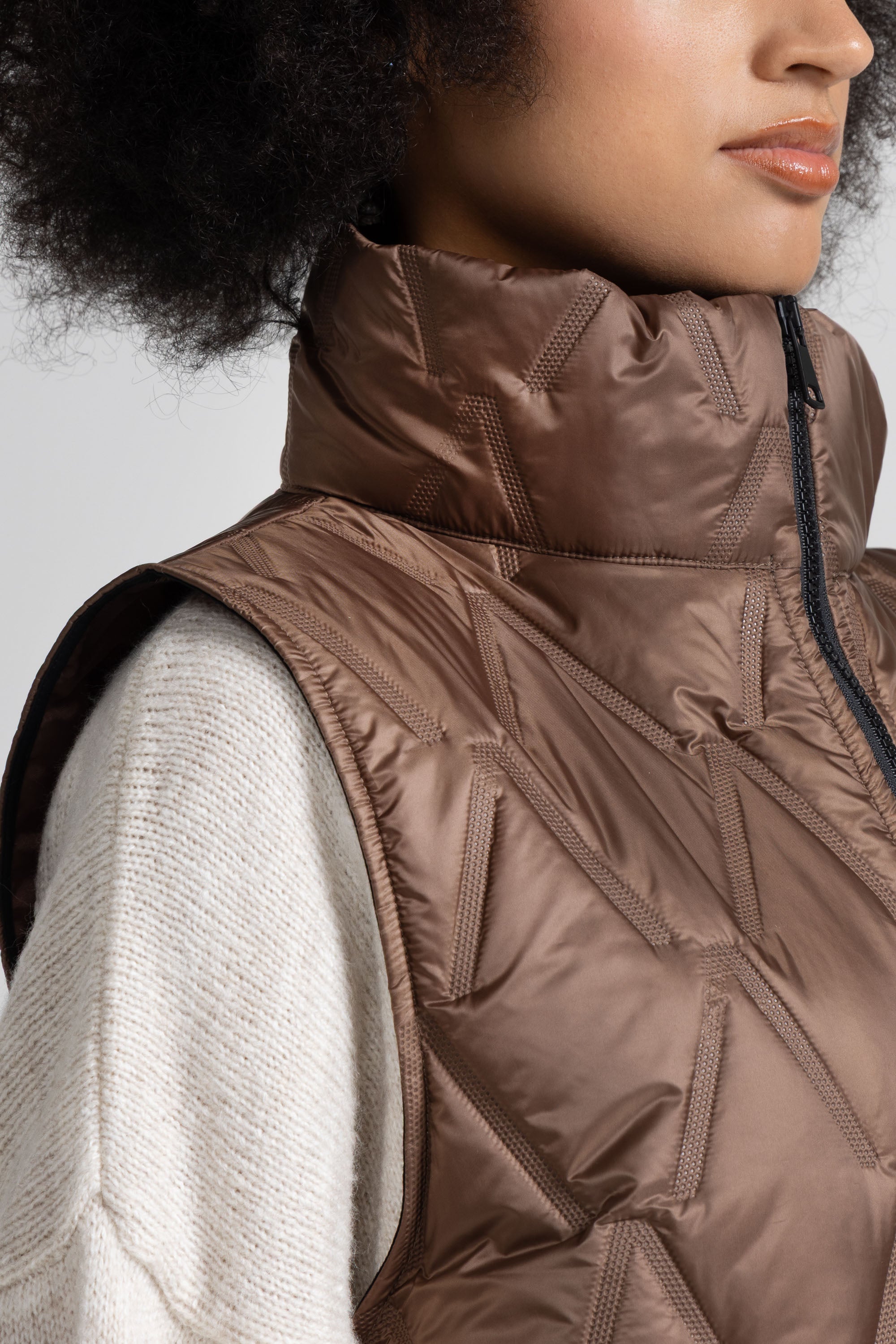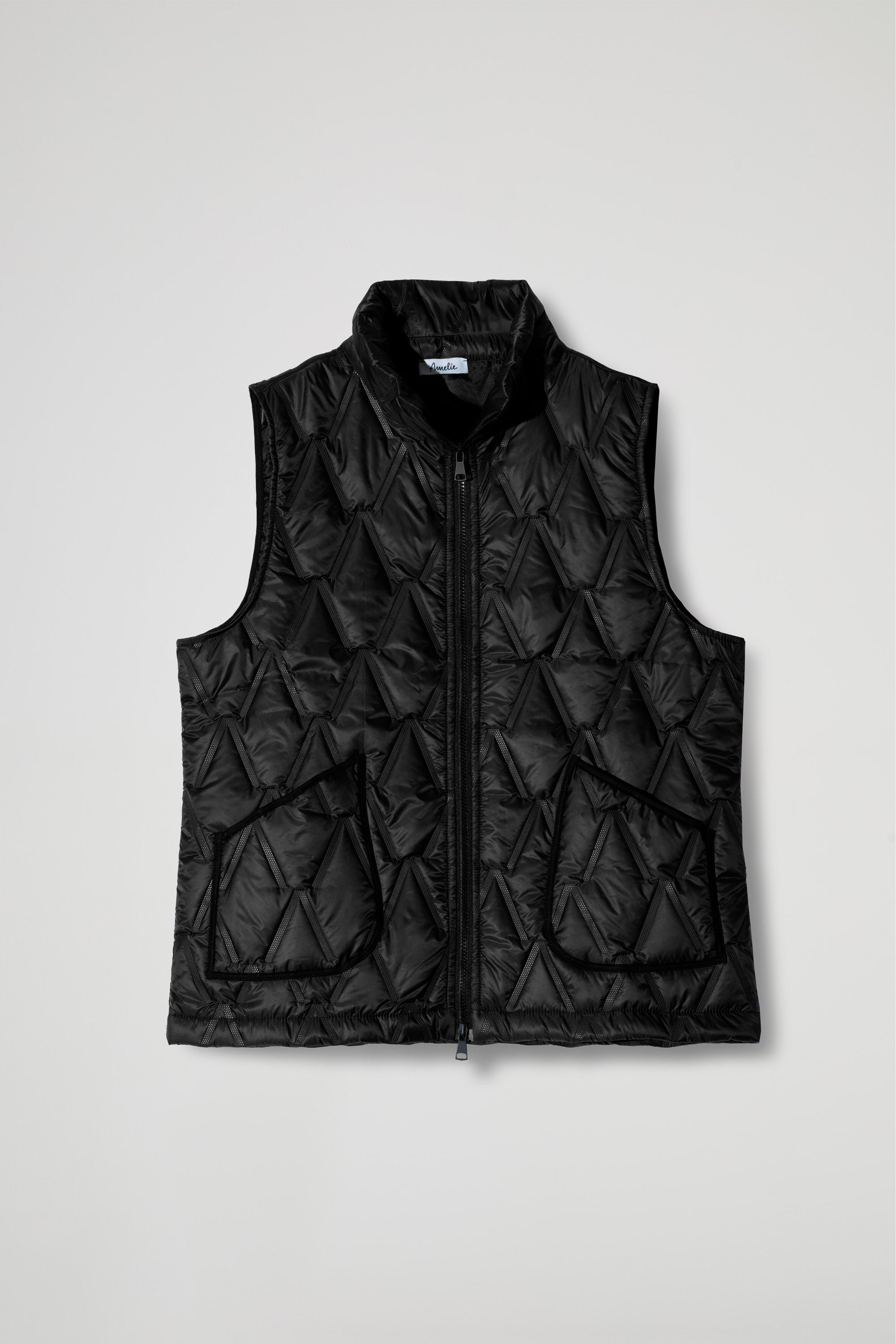 Gilet trapuntato dalla linea dritta e morbida, ideale per un look casual o sportivo, ma con un tocco raffinato grazie alla lucentezza del materiale.