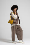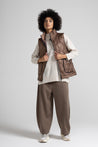 Collo alto e avvolgente, chiusura centrale con zip a doppio cursore a contrasto colore, due tasche applicate sul davanti con bordatura a contrasto, disegno romboidale su tutto il capo, orlo inferiore ribattuto alto.