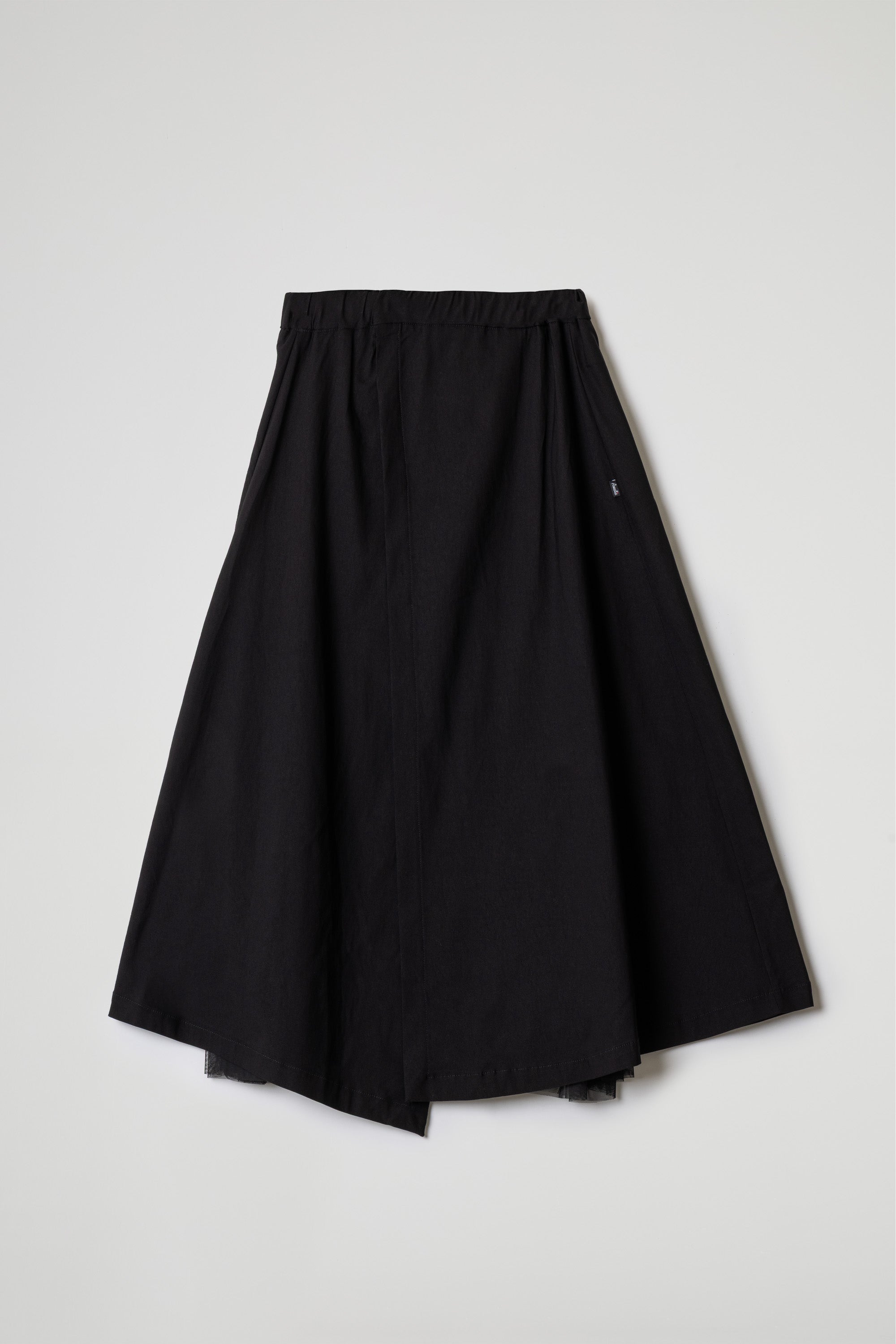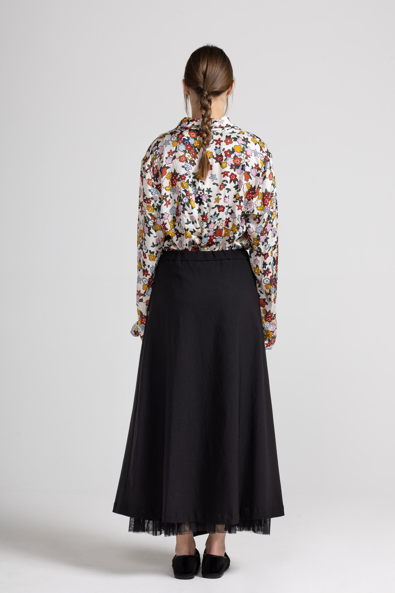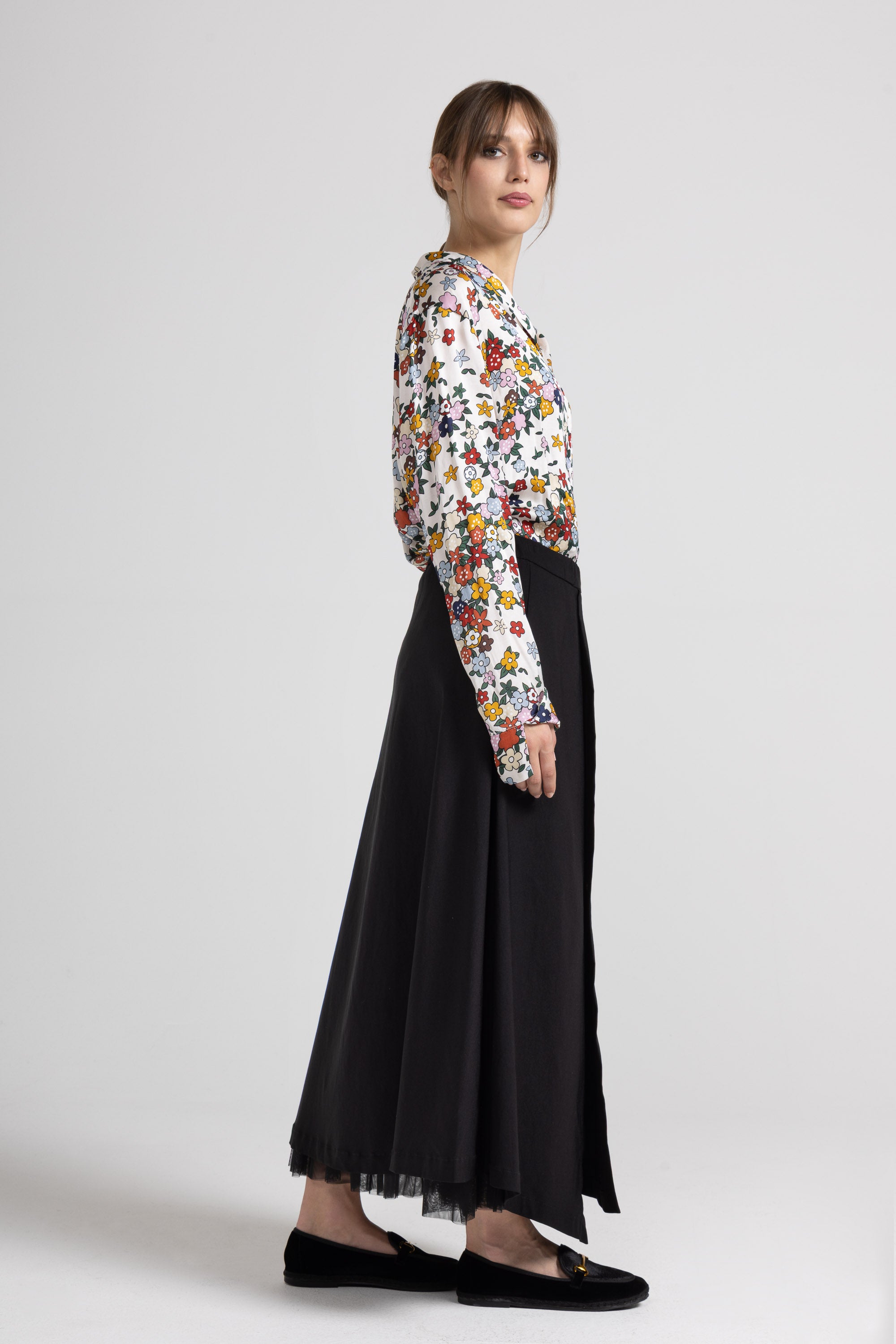 Gonna lunga a portafoglio in tessuto bengalina di viscosa elasticizzato, elastico in vita, sottogonna con dettaglio tulle sul fondo.