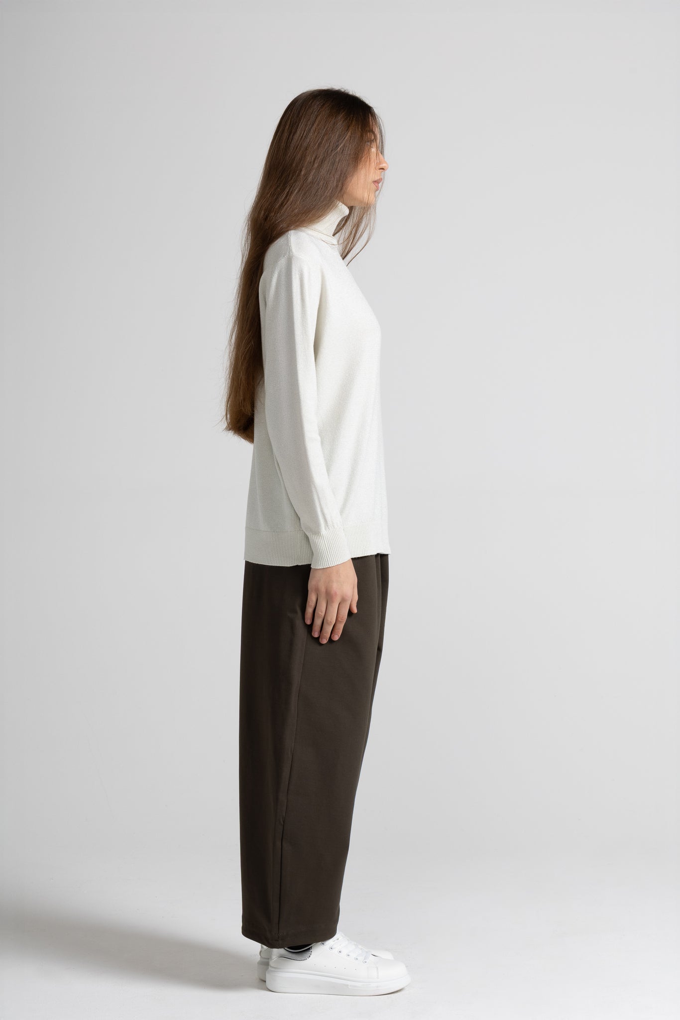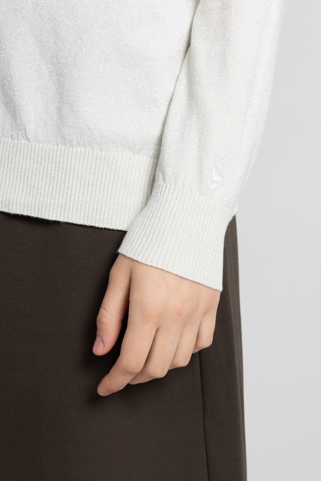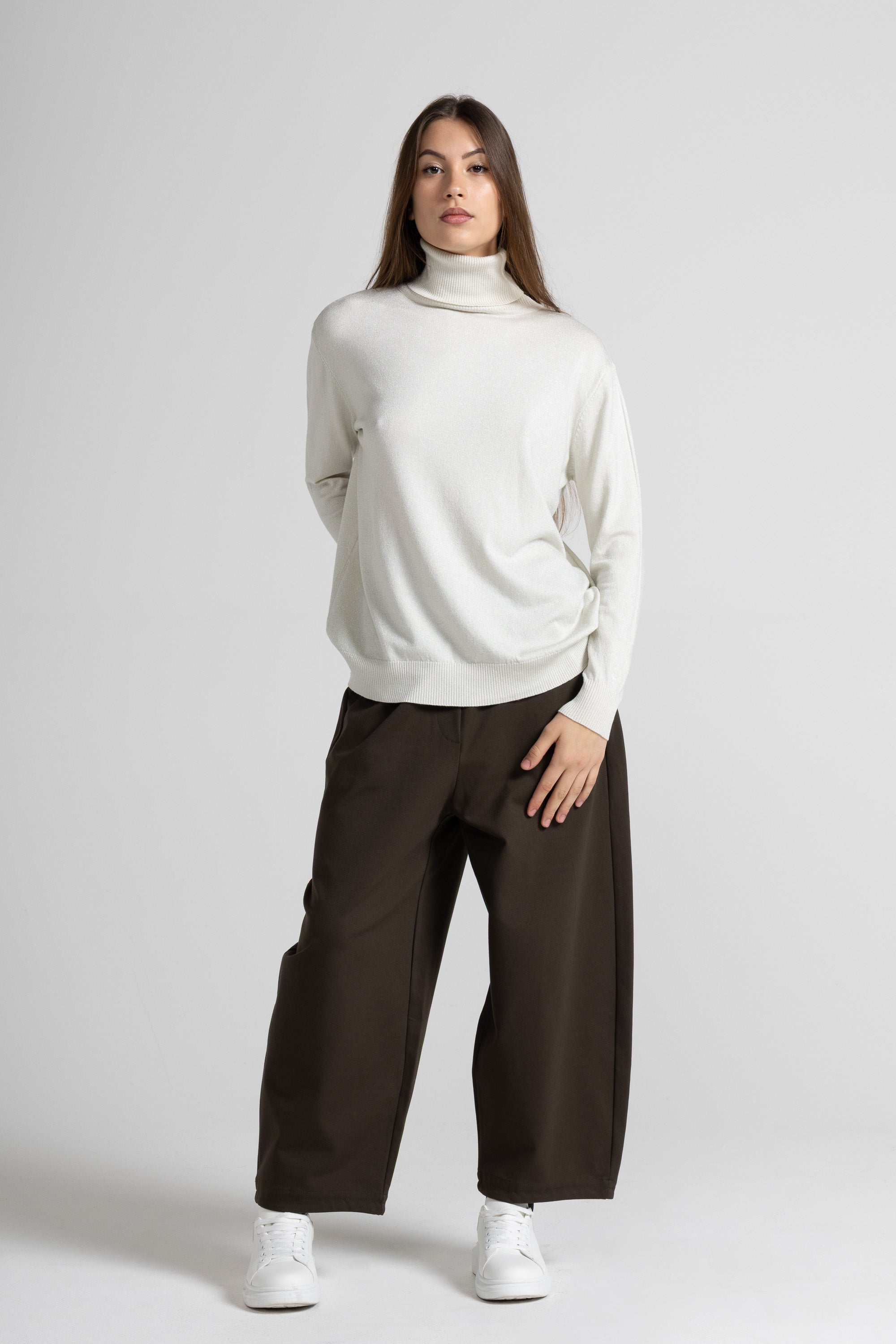 Maglione dolce vita dalla texture leggermente brillante che valorizza ogni outfit, dal più casual al più sofisticato; la sua leggerezza lo rende comodo da indossare, mentre i riflessi metallici aggiungono un dettaglio distintivo senza eccessi.