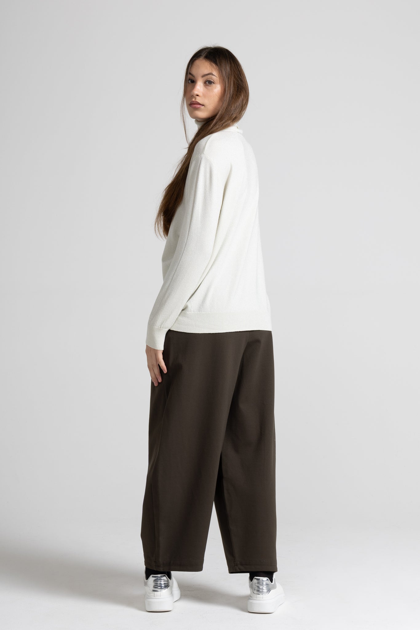 Maglia dolce vita over, collo con dettaglio a costine, spalla scesa, manica lunga con orlo rifinito alto a costine elasticizzate, fondo stondato con orlo alto a costine elasticizzate. Linea ampia.
