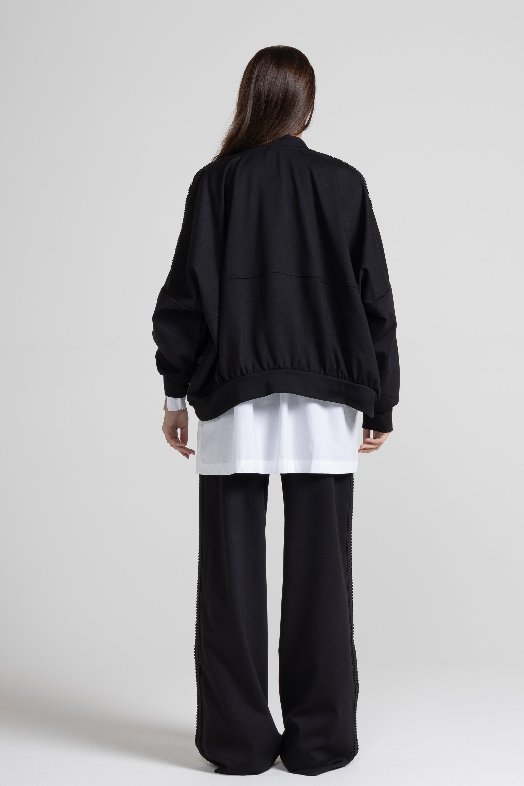 PANTALONE PALAZZO IN PUNTO MILANO DI VISCOSA, ELASTICO E COULISSE REGOLABILE IN VITA, DETTAGLIO PASSAMANERIA SULLA LUNGHEZZA DELLA GAMBA.