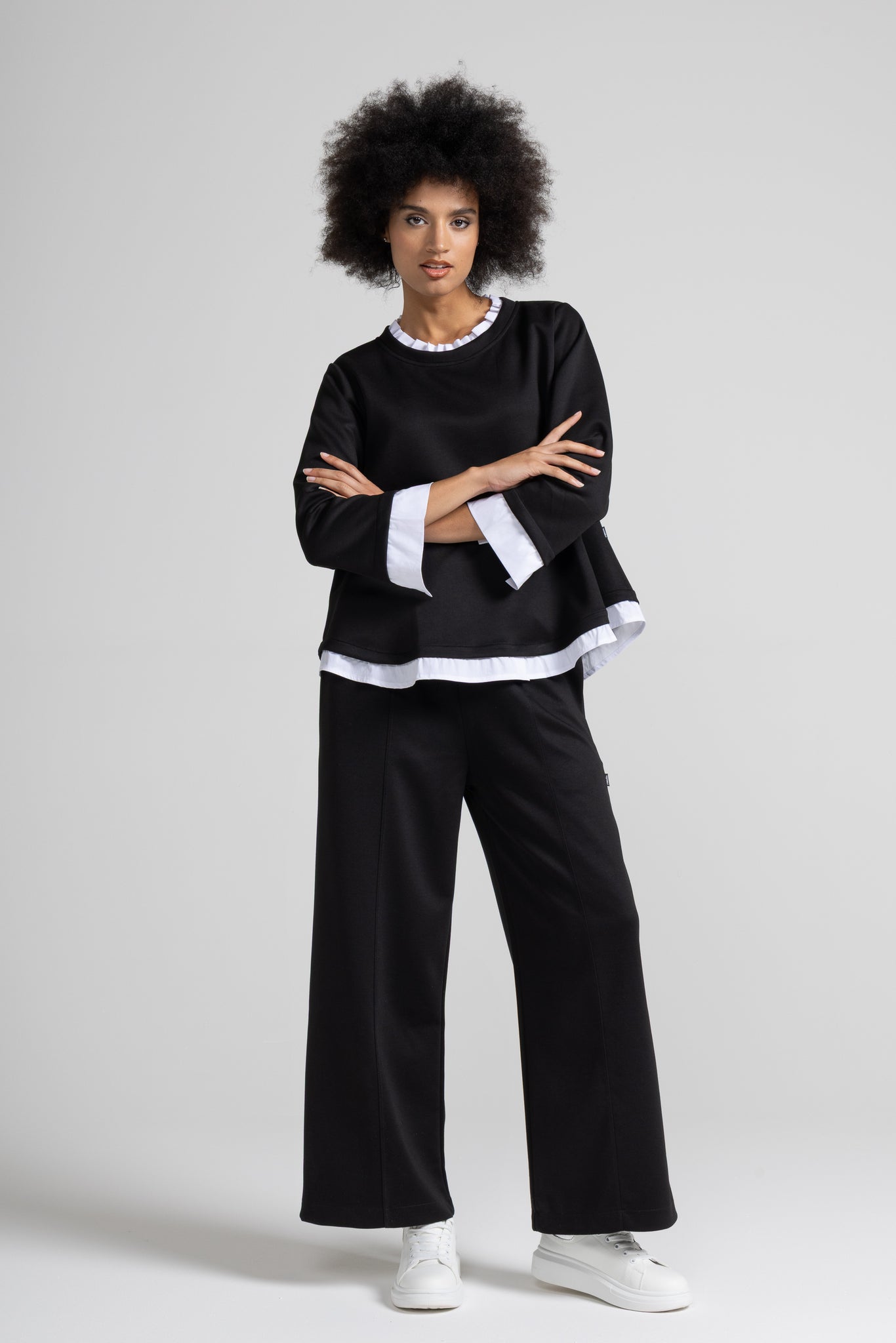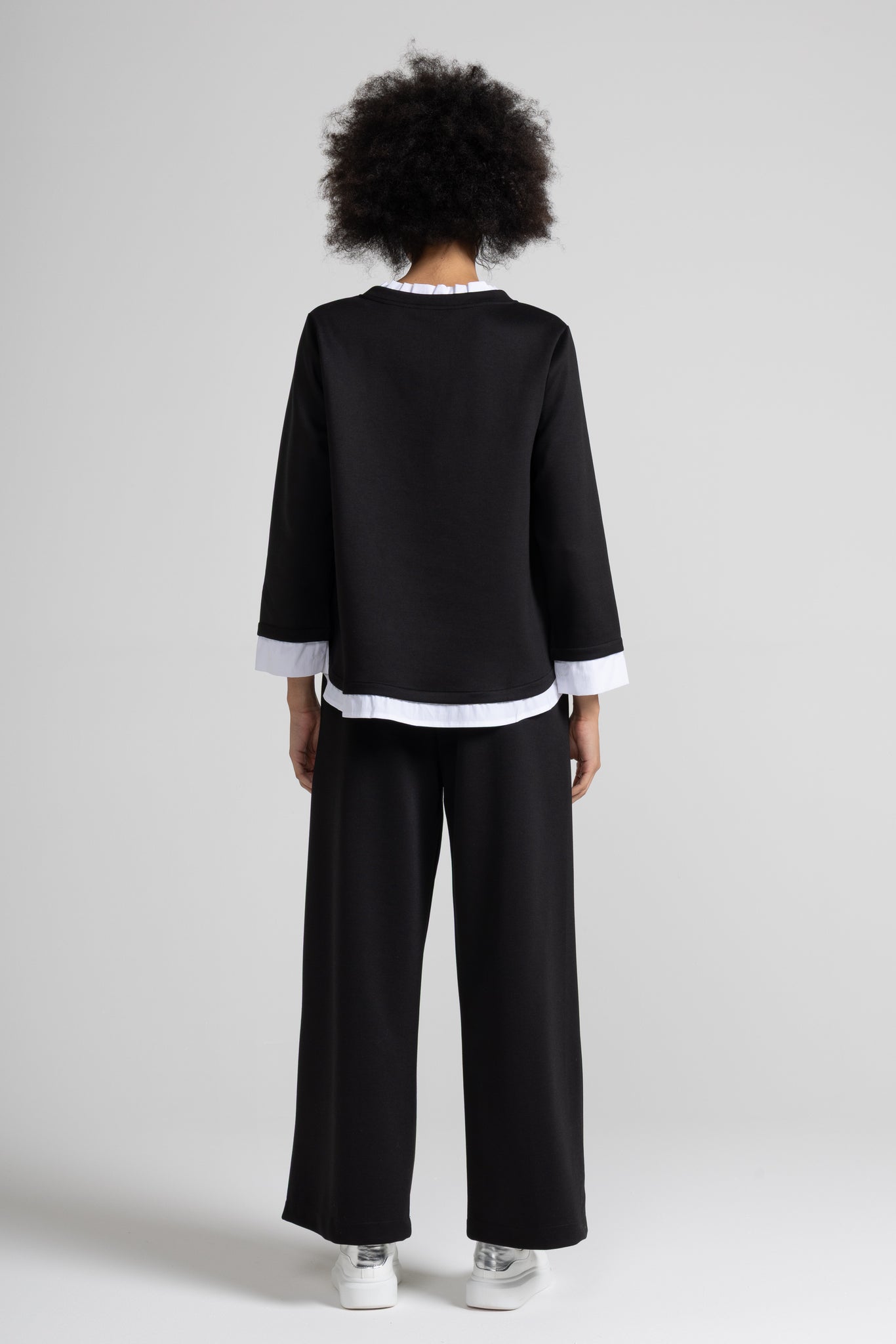 Top  dal design raffinato e contemporaneo. Il modello unisce la comodità di una maglia in cotone elasticizzato alla ricercatezza di inserti effetto camicia in popeline, visibili al collo e al fondo manica.