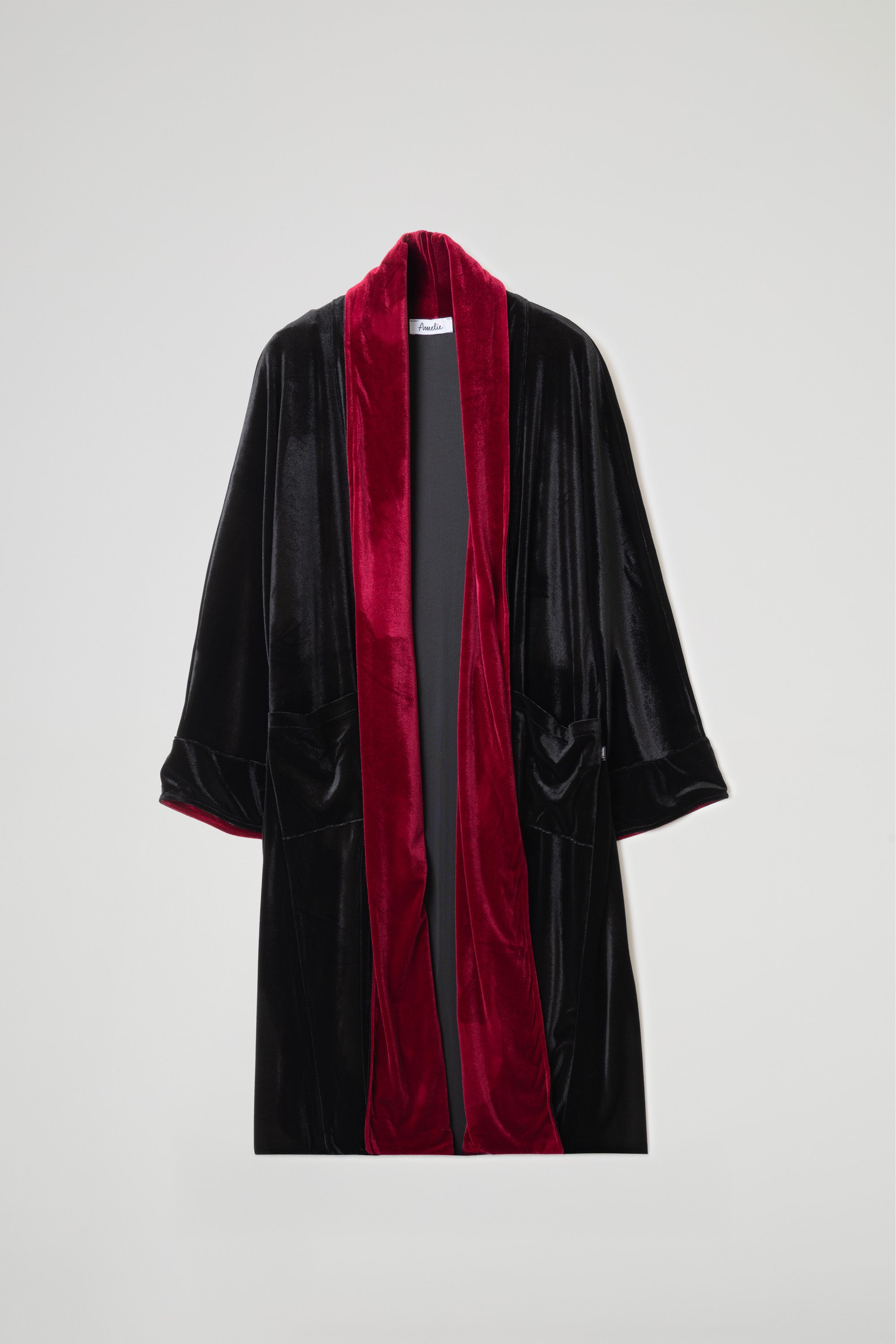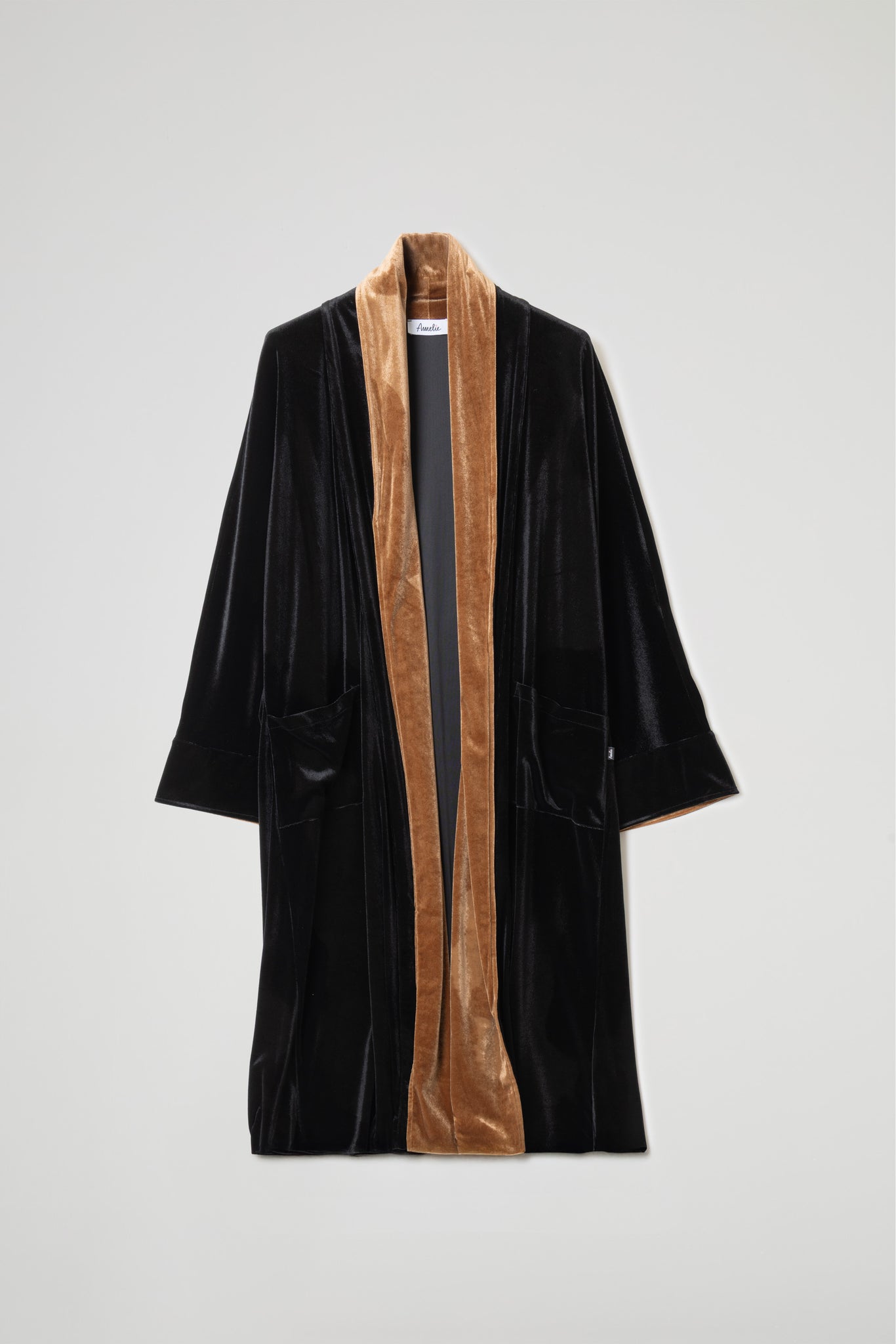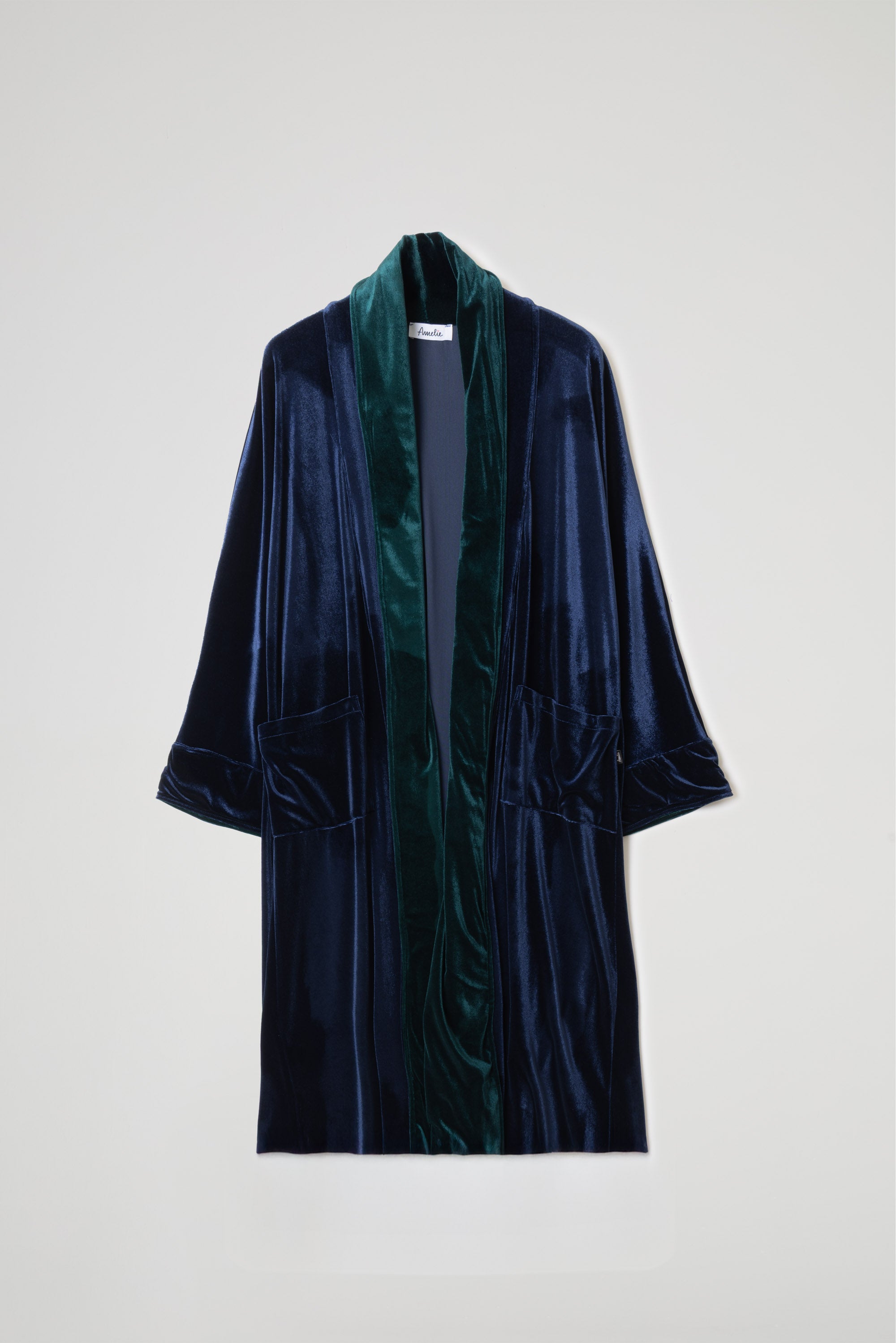 SPOLVERINO LUNGO IN VELLUTO ELASTCIZZATO, MANICA ¾, TASCA A TOPPA, COLLO SCIALLATO DETTAGLIO BICOLOR, POLSO RIBATTUTO ALTO CON DETTAGLIO BICOLOR. LINEA A TRAPEZIO.