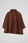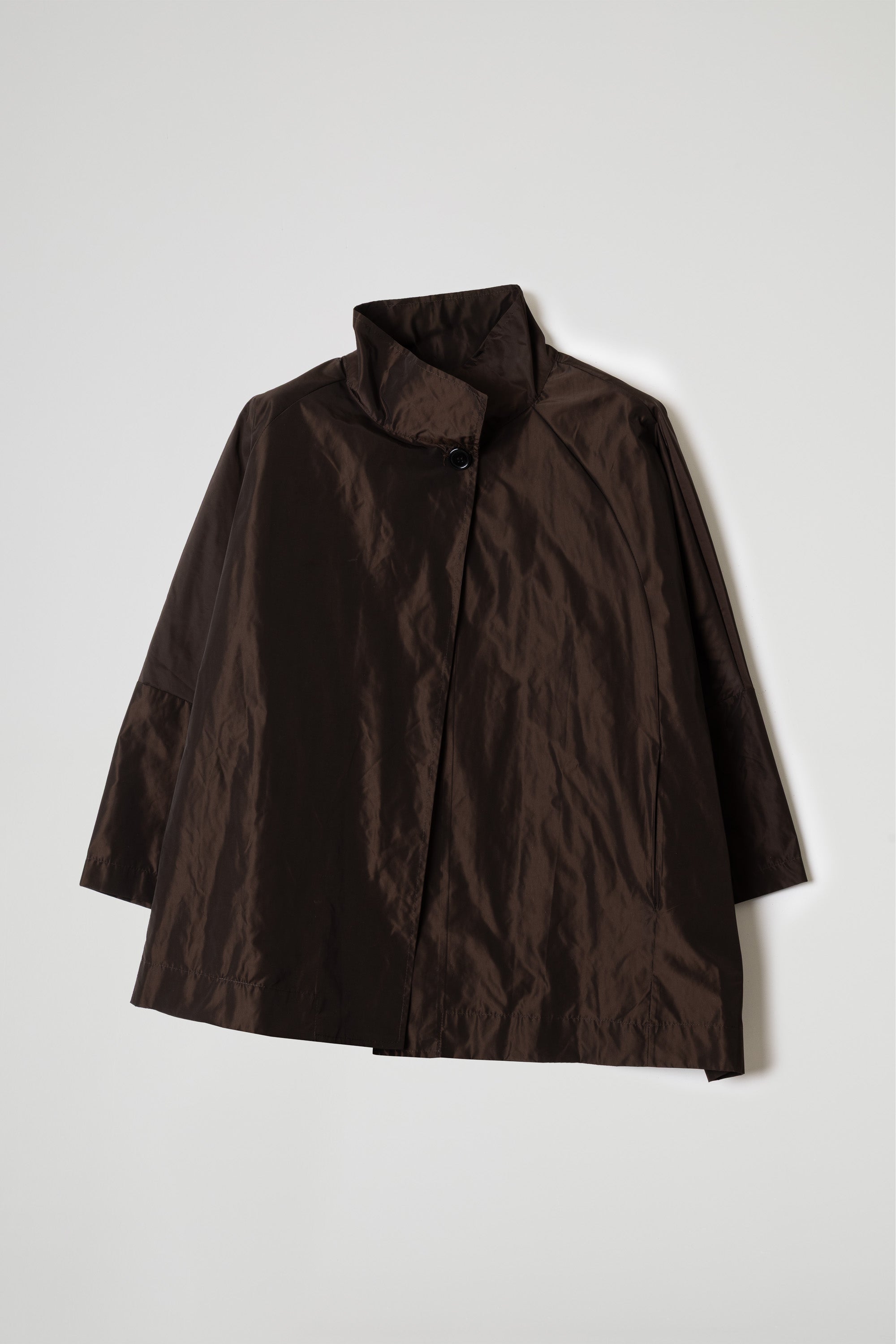 MANTELLA LUNGHEZZA 3/4 IN TESSUTO TAFFETA’ EFFETTO NACRE’, MEZZO COLLO IN PIEDI, CHIUSURA BOTTONE, MANICA LUNGA, POLSO RIBATTUTTO ALTO, MANICA TAGLIO RAGLAN. LINEA OVER.