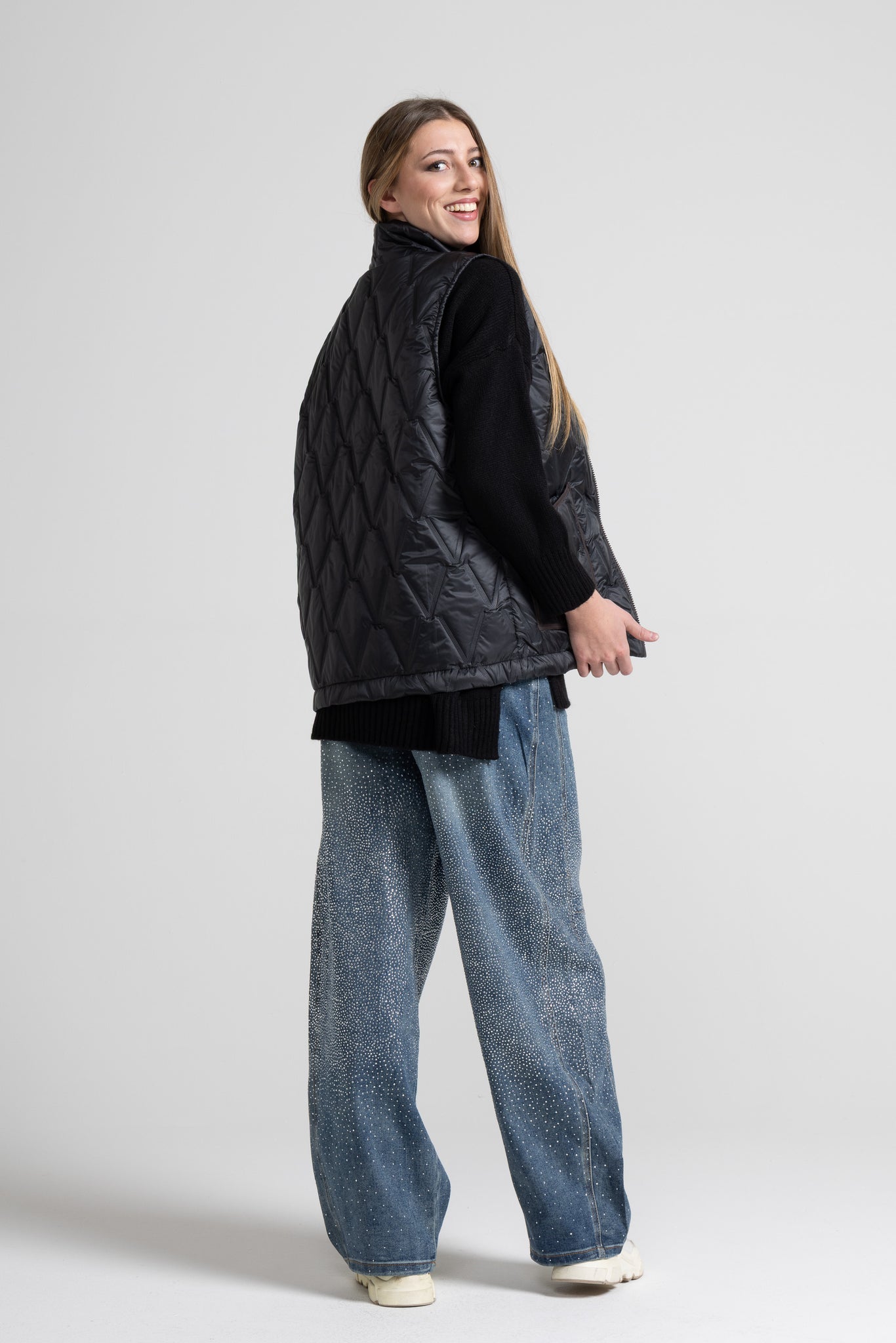 Gilet trapuntato dalla linea dritta e morbida, ideale per un look casual o sportivo, ma con un tocco raffinato grazie alla lucentezza del materiale.