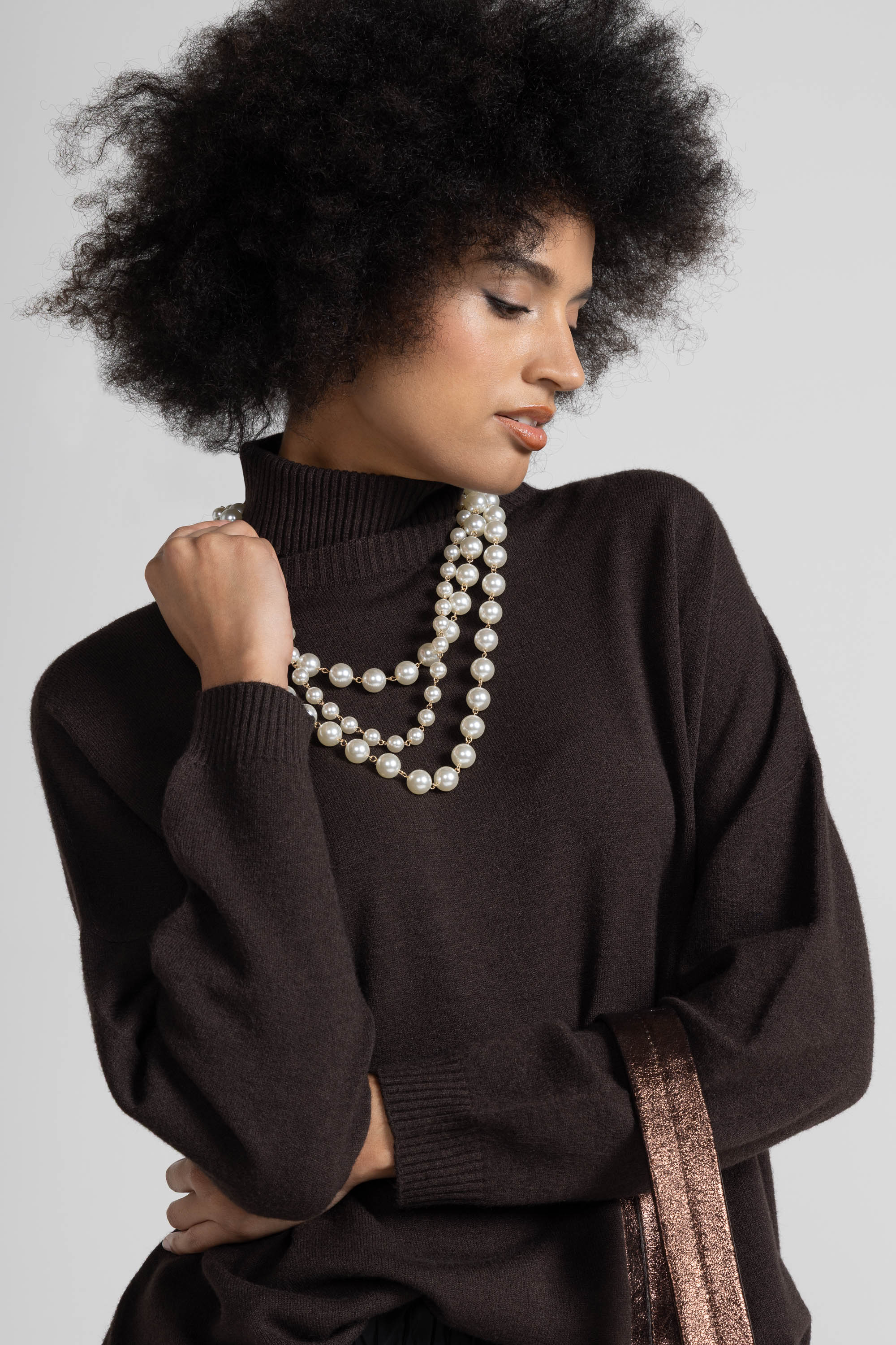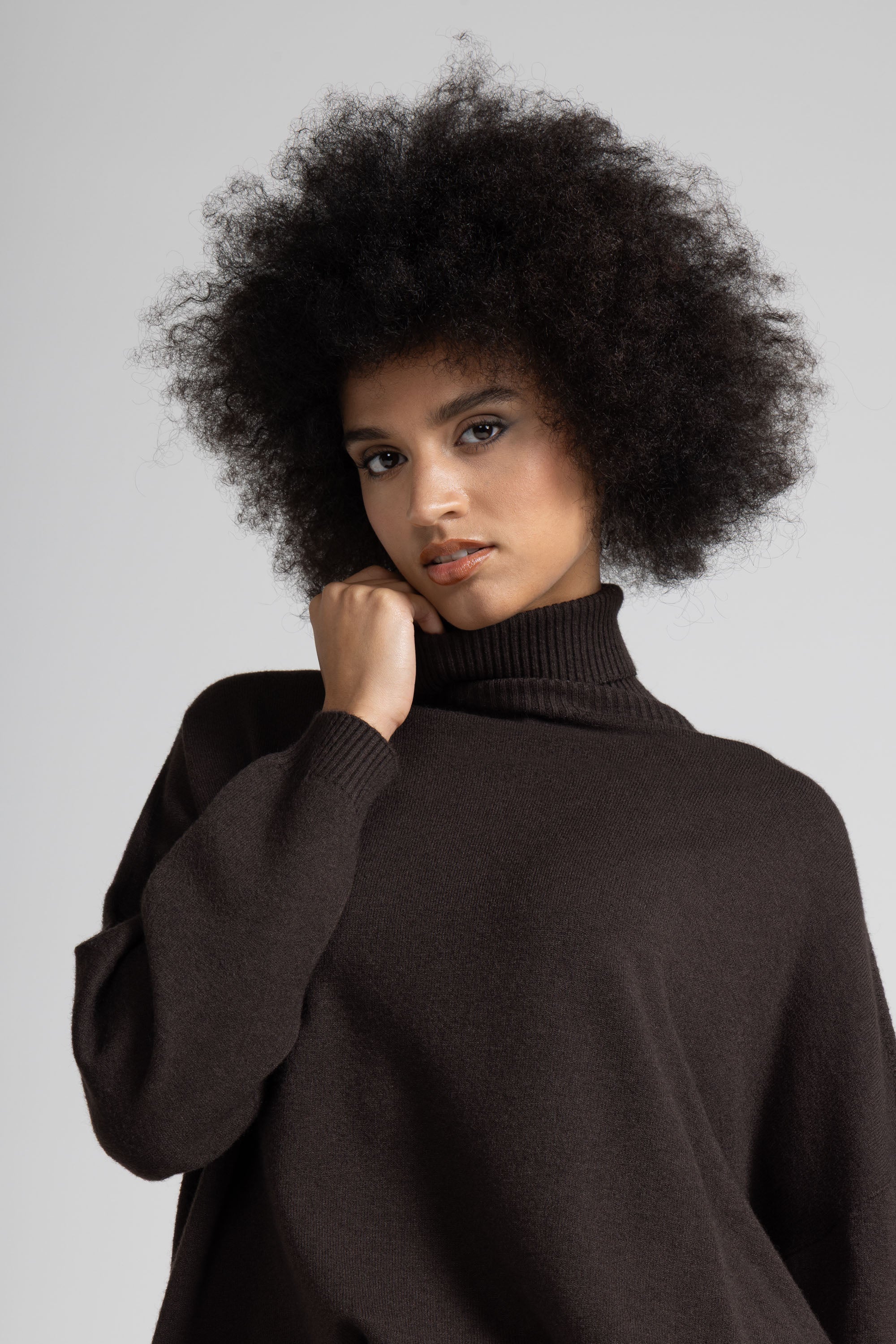 Collo alto e avvolgente a coste elasticizzate, spalle scese, maniche lunghe con polsini alti a  costine elasticizzate, lavorazione a bordo alto a costine compatte sul fondo. Linea ampia