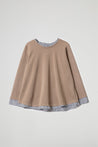 TOP A TRAPEZIO IN FLUIDO DI VISCOSA, SCOLLO ROTONDO CON DETTAGLIO COLLETTO CONDETTAGLIO INSERTO ROUCHES IN POPELINE, MANICA LUNGA, DETTAGLIO INSERTO IN POPELINE SU MANICA E FONDO.