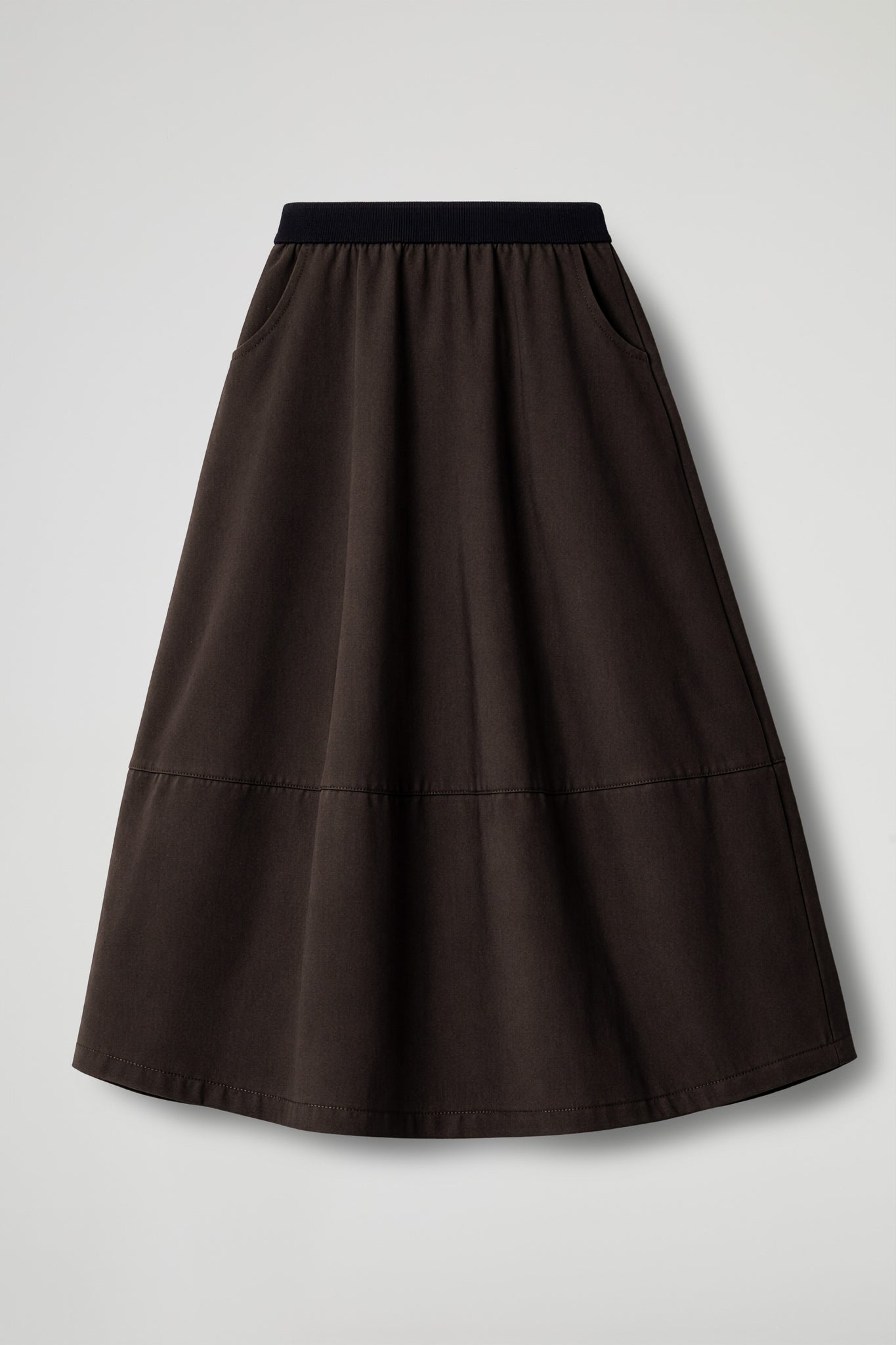 Gonna in tessuto di viscosa, fascia elastica in vita in tessuto a costine tono su tono, tasche a filetto con apertura stondata sui fianchi, impuntura centrale sul retro e orizzontale sul davanti, orlo a petalo sul fondo .Linea ampia