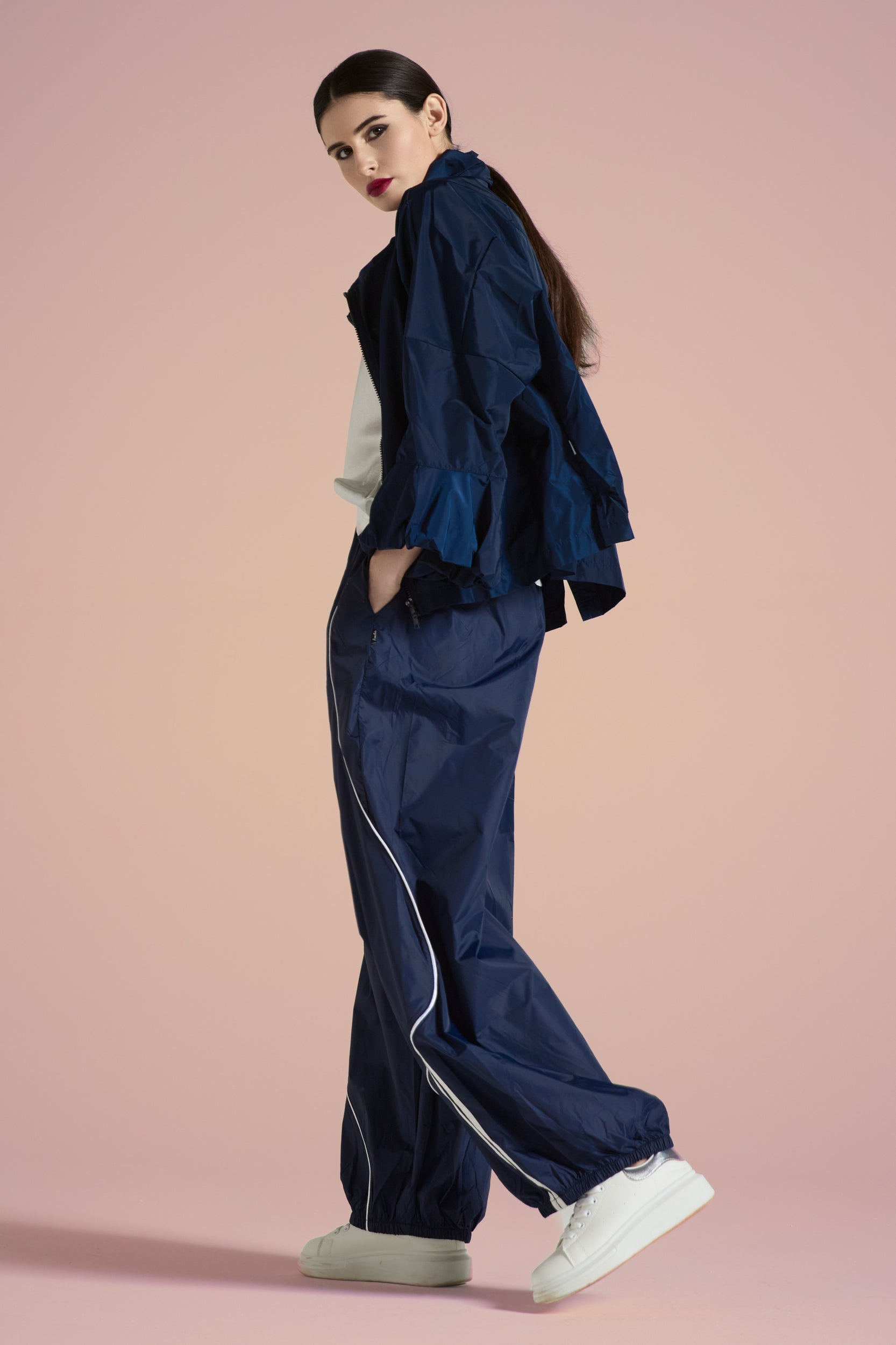 Pantalone in tessuto tecnico, elastico in vita, tasche a filo, dettaglio piping a contrasto colore, gamba ampia e leggermente a palloncino, elastico sul fondo. Linea ampia.