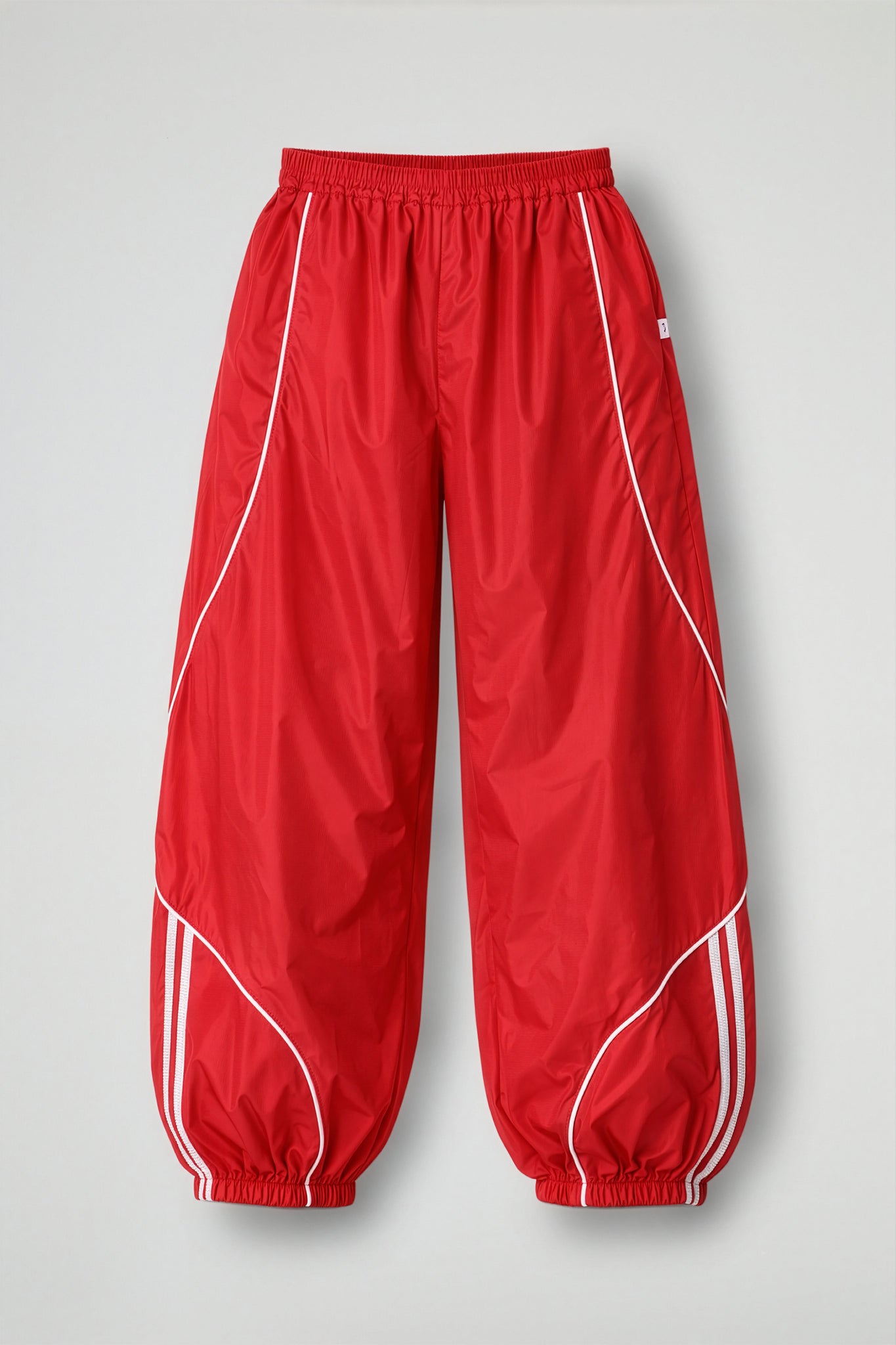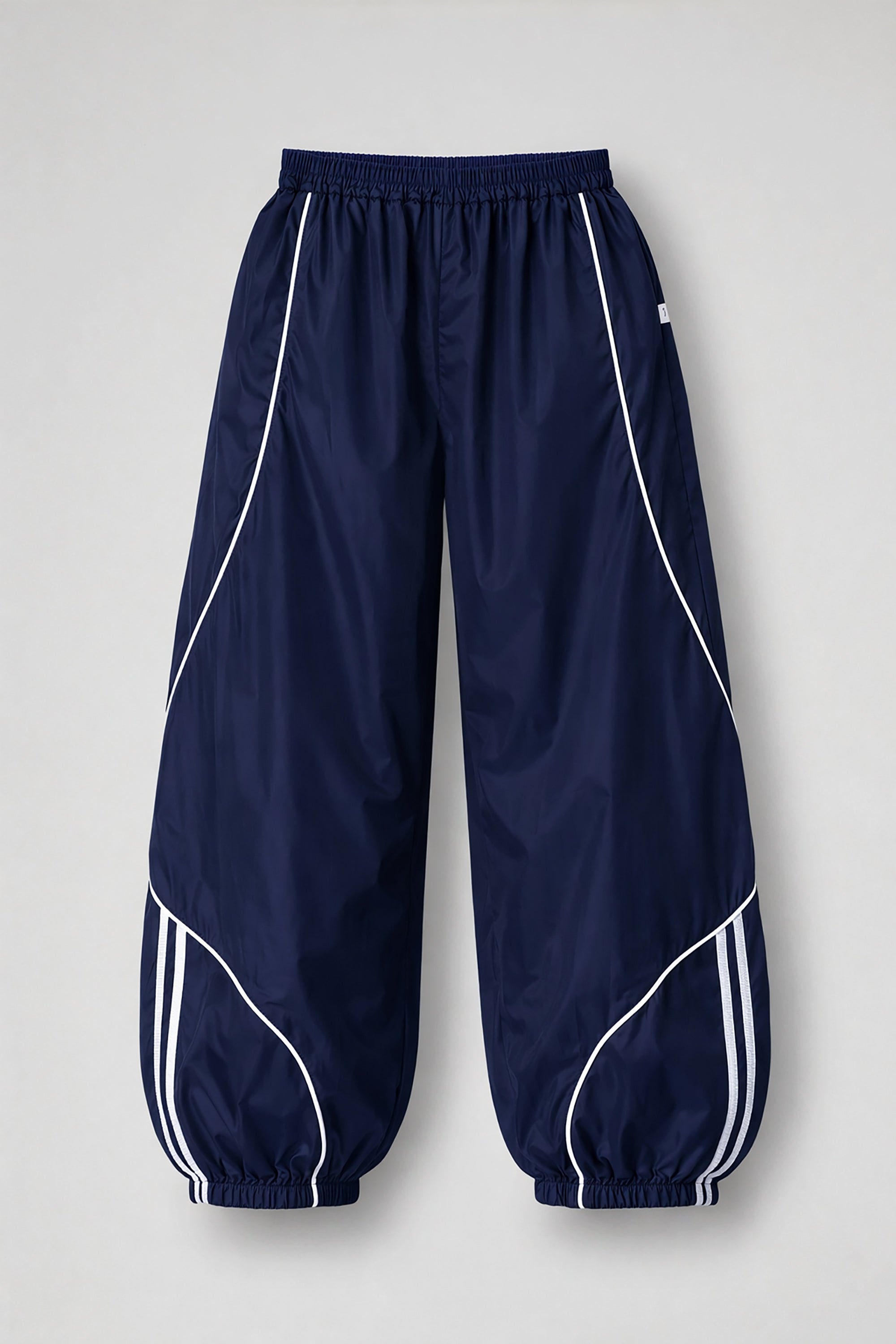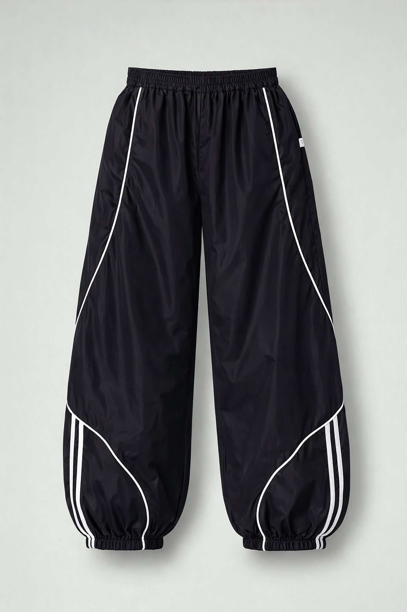 Pantalone in tessuto tecnico leggero dal look sportivo e contemporaneo. La vita elasticizzata assicura comfort e vestibilità facile, mentre la gamba ampia crea un volume morbido; Il design è valorizzato da profili a contrasto (piping) che seguono le linee del capo e da inserti sul fondo con righe laterali. Fondo gamba con elastico per un effetto leggermente “a palloncino” e una tenuta comoda alla caviglia.