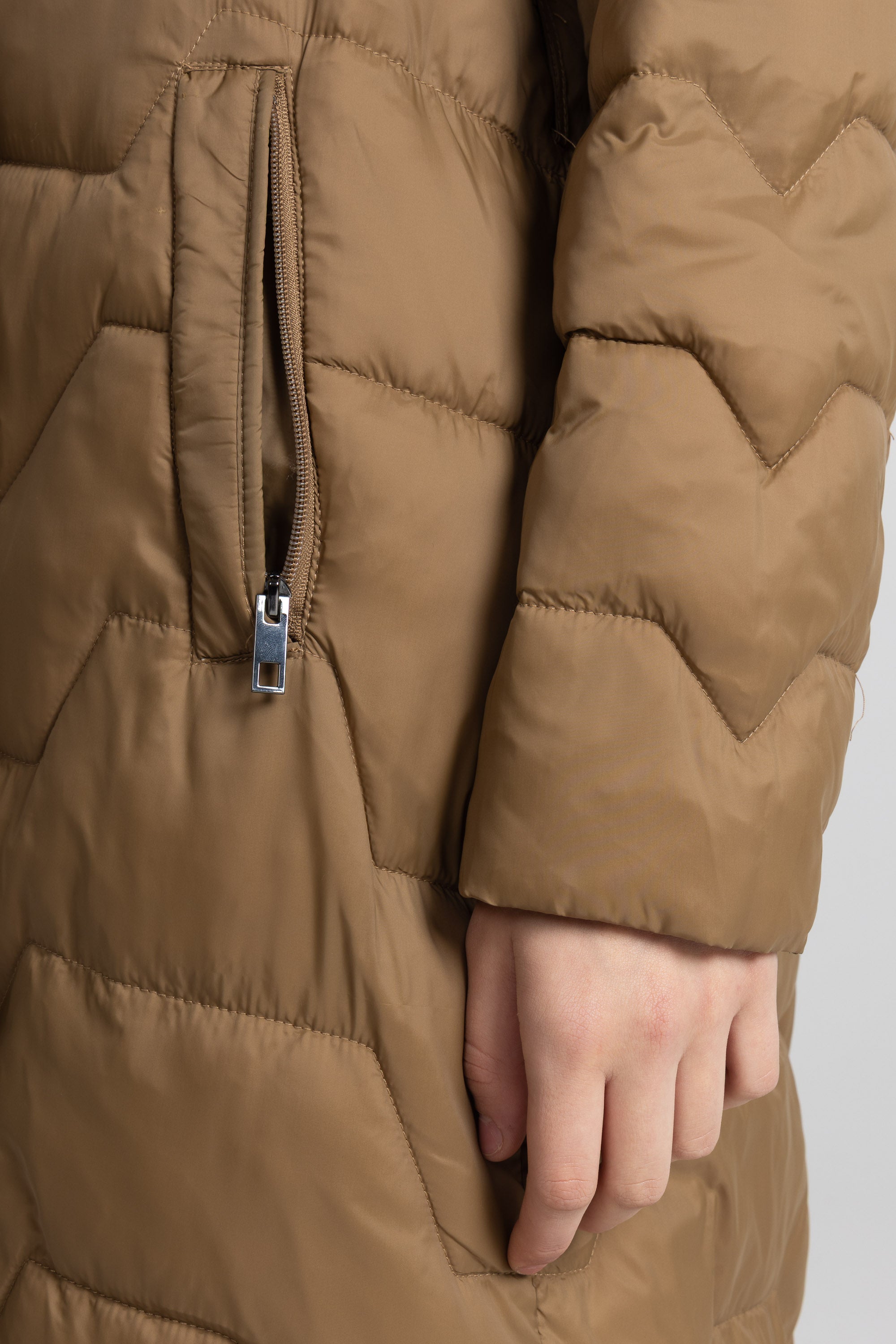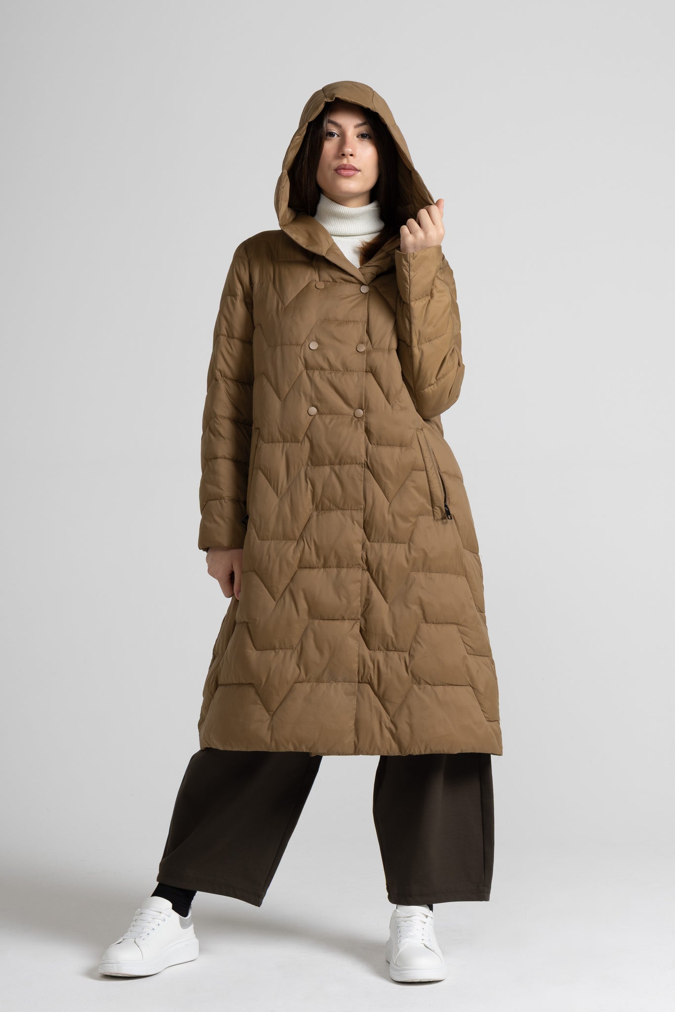 Piumino lungo dal design trapuntato a motivo geometrico che valorizza la silhouette, unendo funzionalità, stile e leggerezza, ideale per affrontare le giornate più fredde con un tocco di eleganza.
