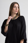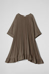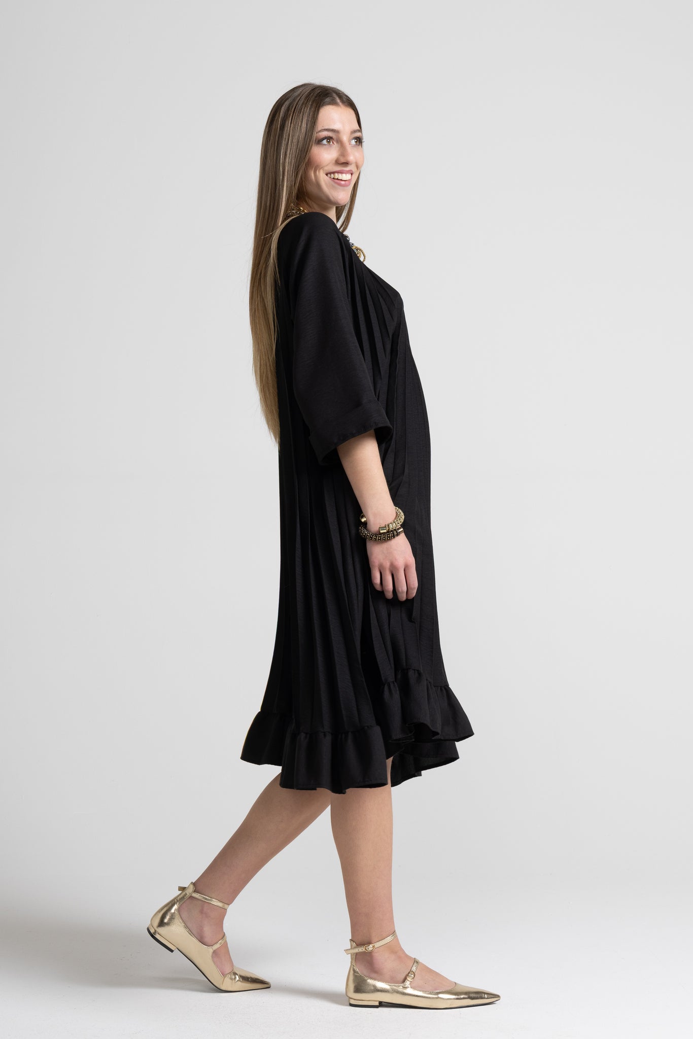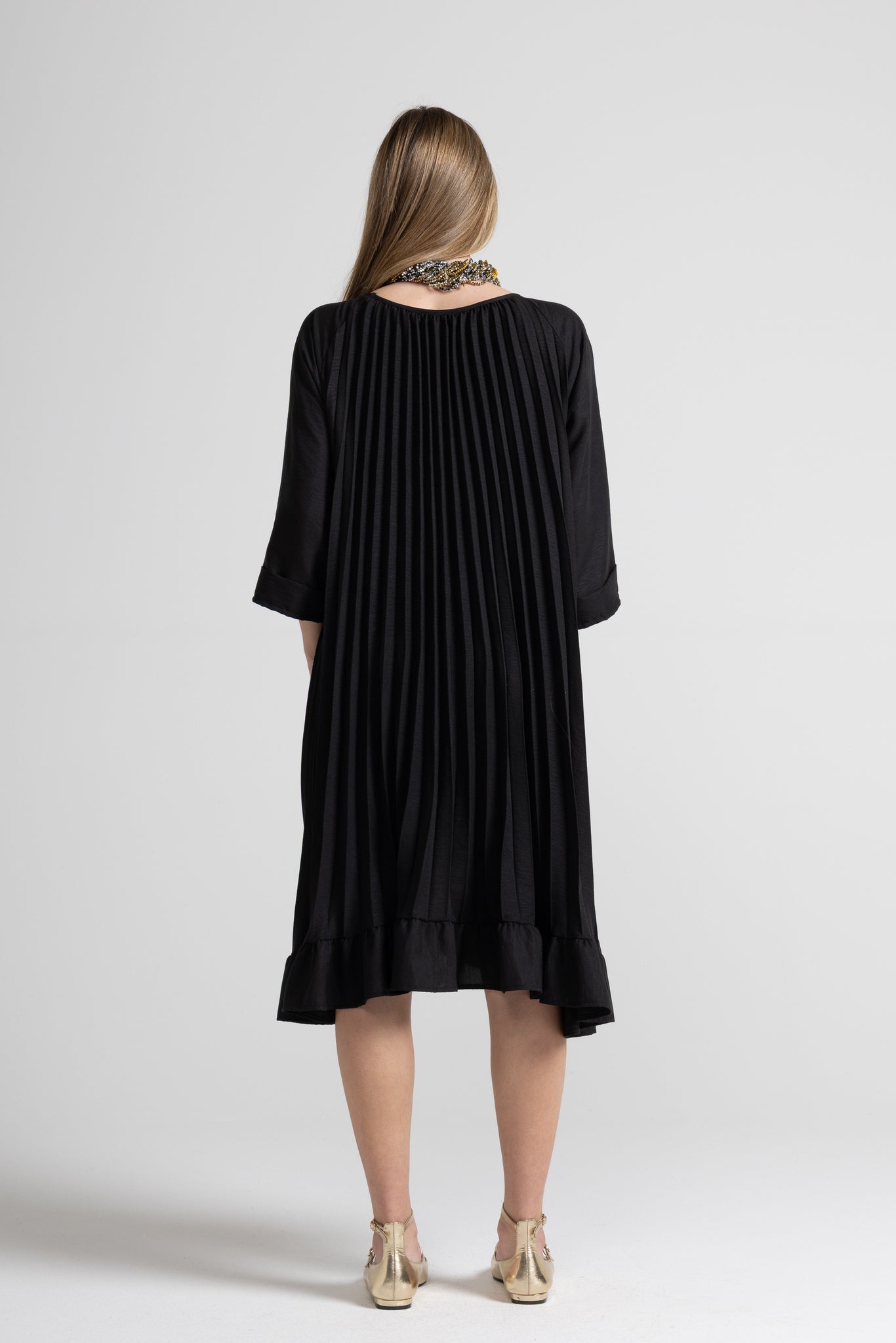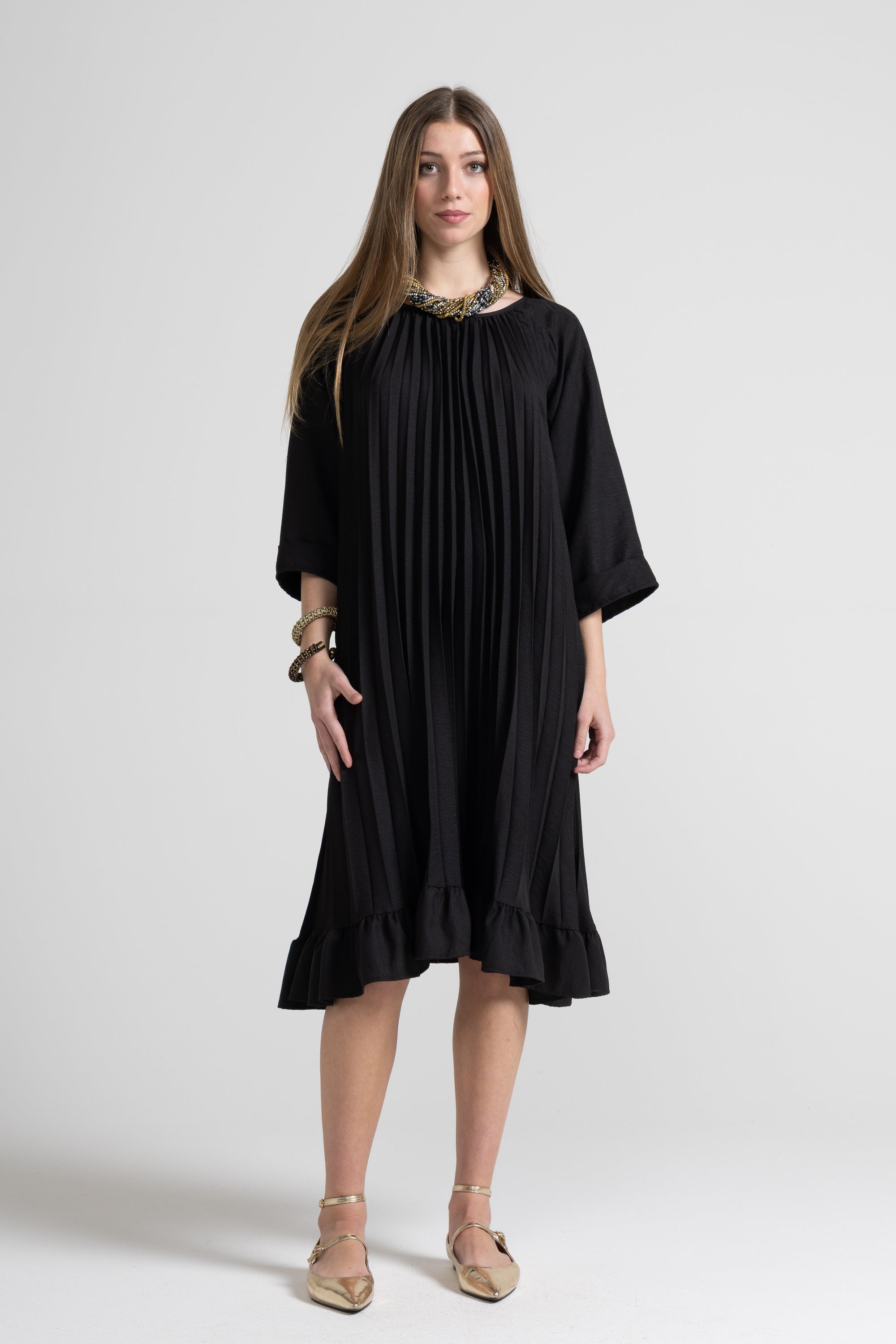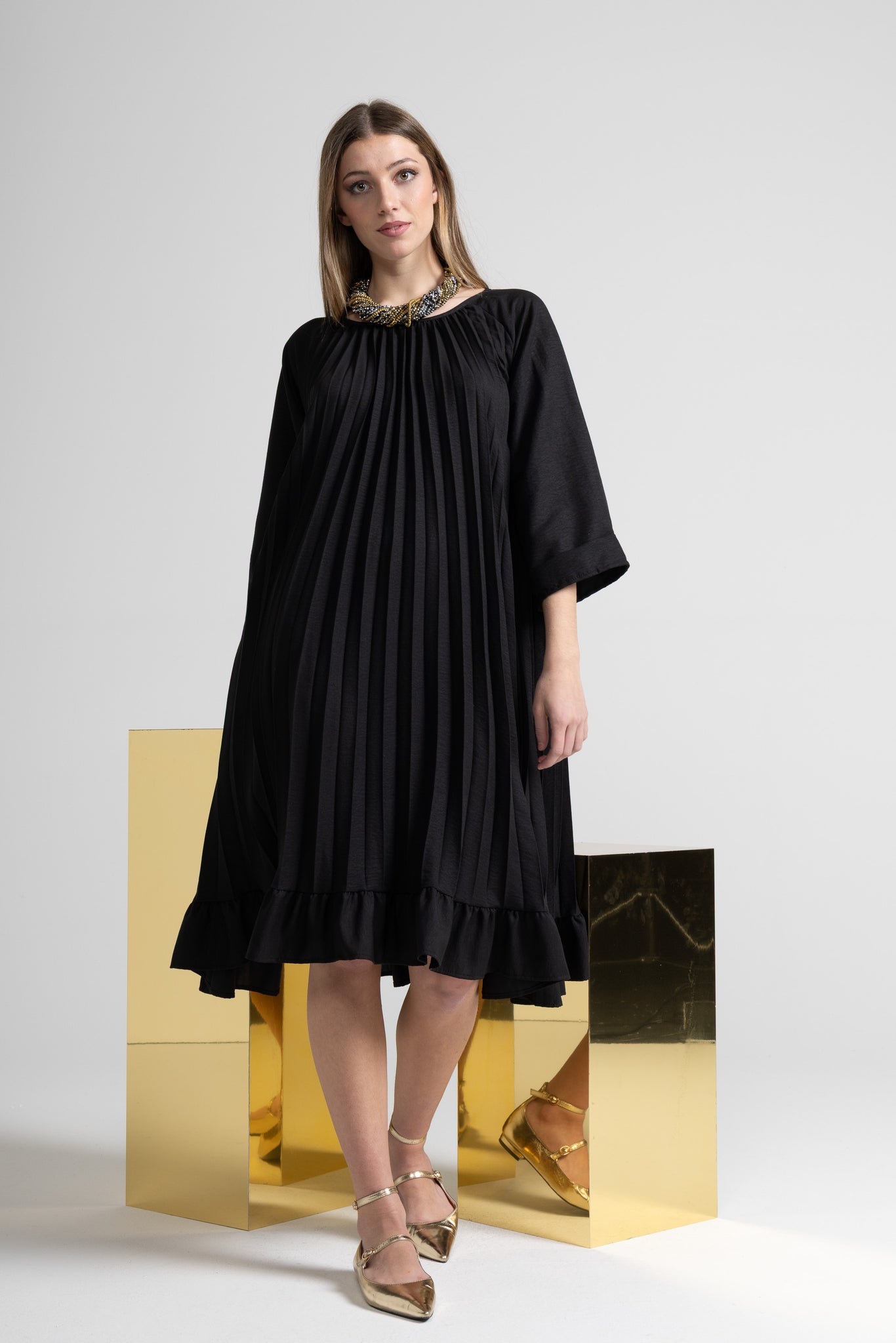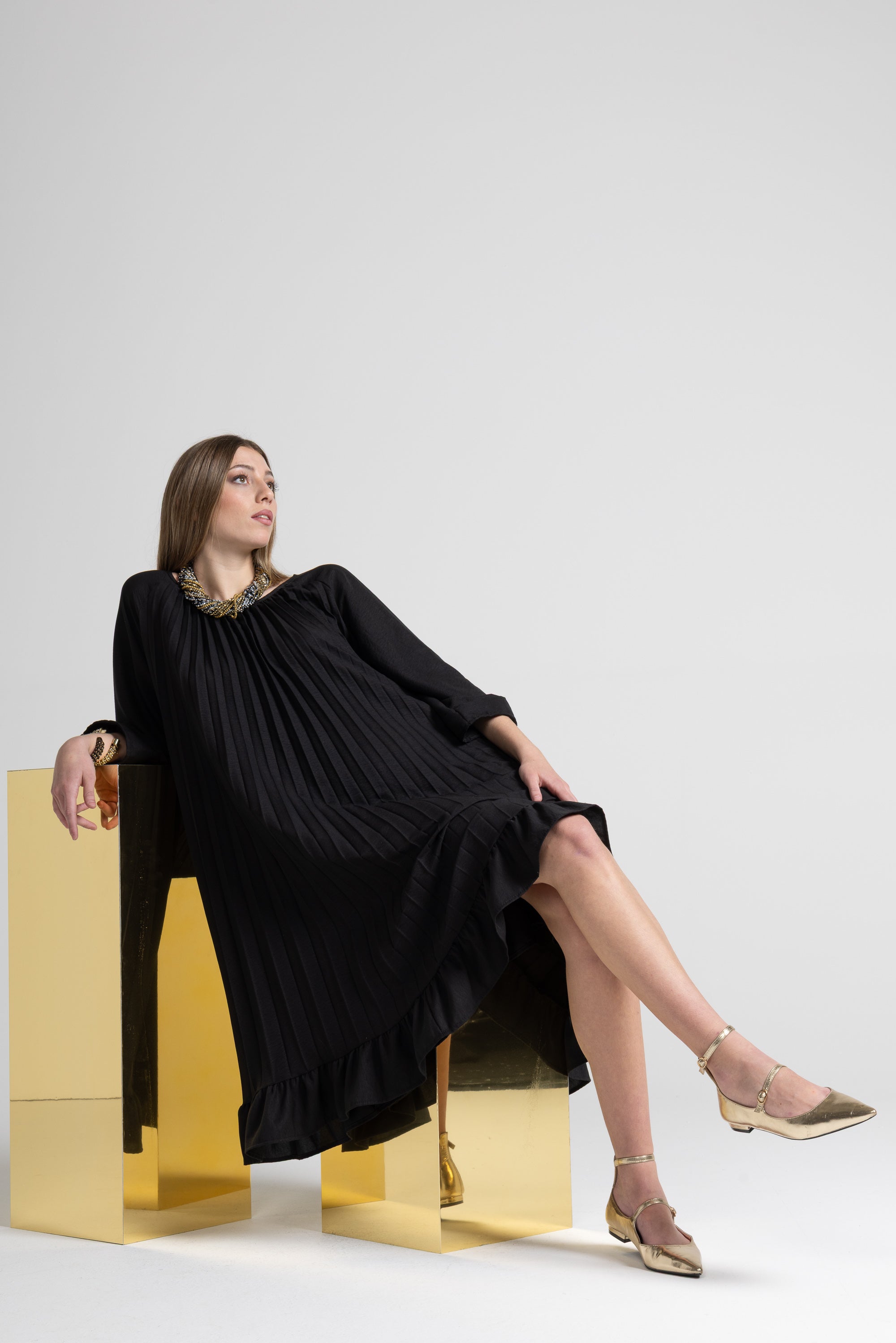 This pleated dress exudes movement and lightness, ideal for the contemporary woman seeking style, quality, and comfort all in one. The vertical pleats lend a sculptural elegance, while the ruffle at the hem adds a romantic and casual touch.