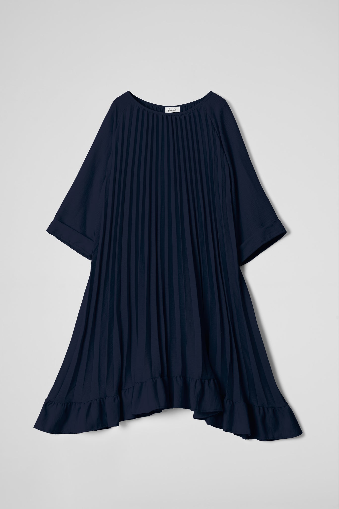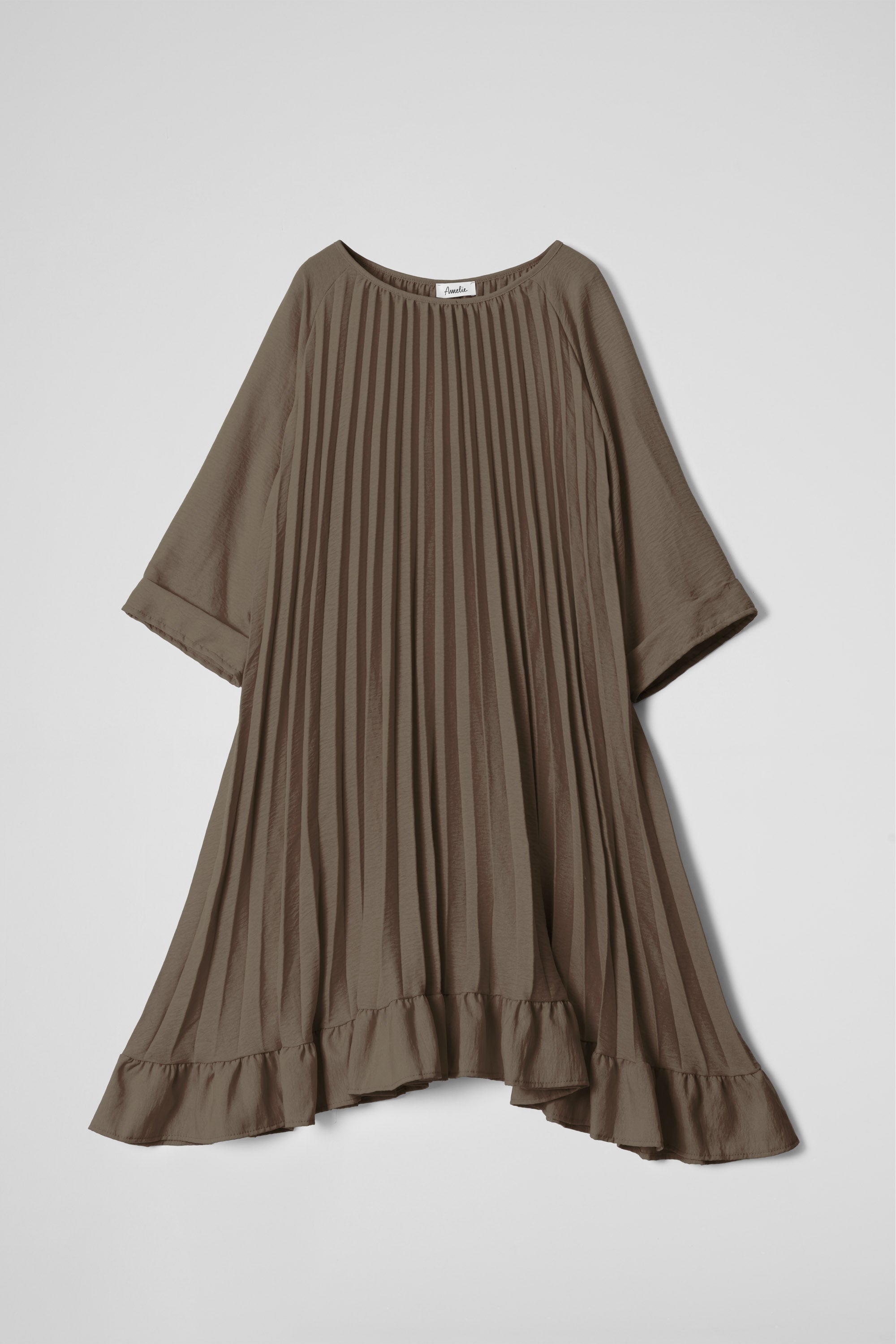 Midi dress, wide, round neckline finished with a thin edge, three-quarter sleeves with tone-on-tone turn-ups, vertical pleating throughout, asymmetrical hem that's shorter at the front and longer at the back, gathered flounce detail at the bottom. Oversized fit.