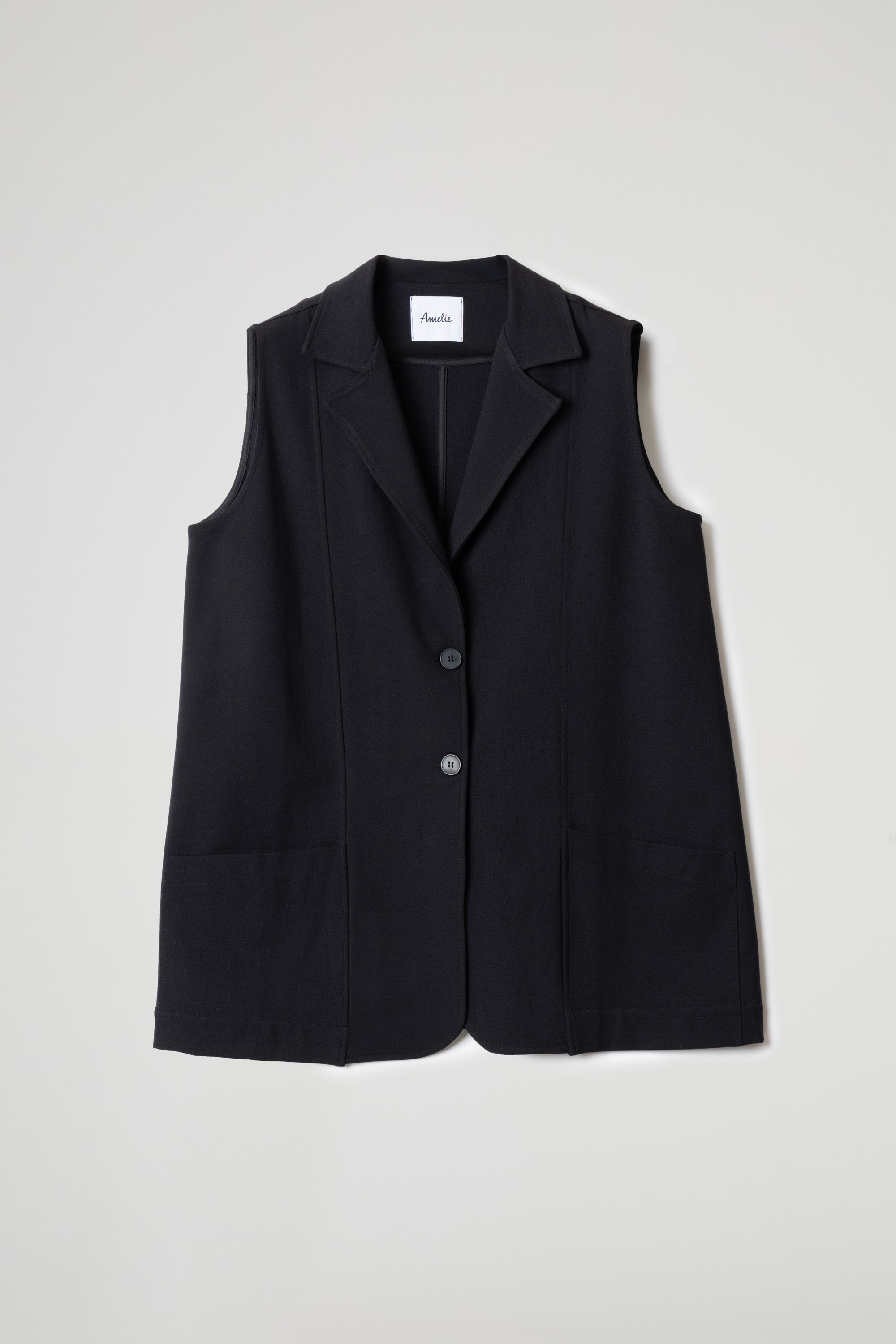 OVERSIZED VEST IN STRETCH VISCOSE MILANO STITCH FABRIC, LONG SLEEVES, FRONT STICHING, LAPEL COLLAR, LARGE PATCH POCKETS, BACK SLIT, BUTTON CLOSURE. A-LINE SHAPE.