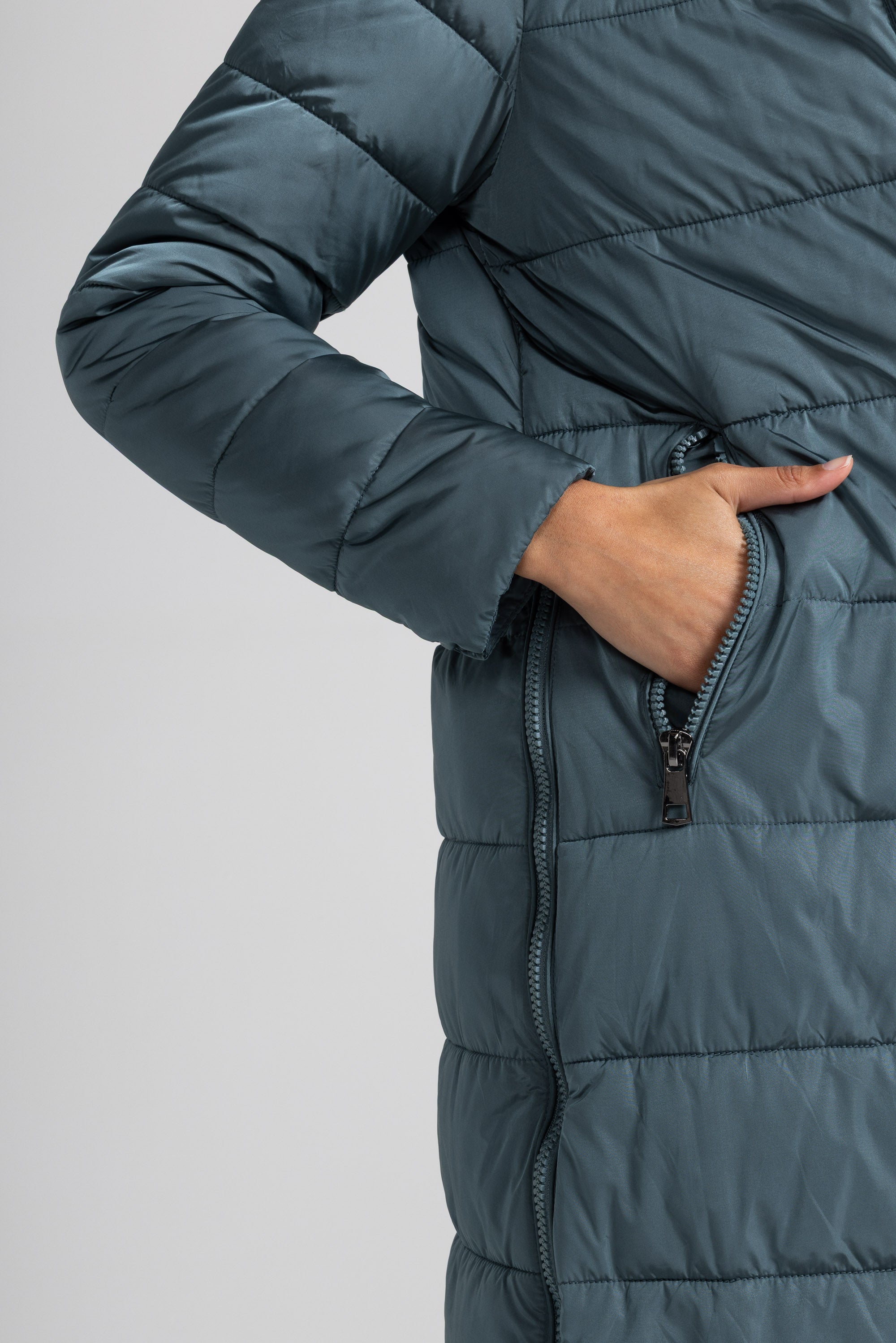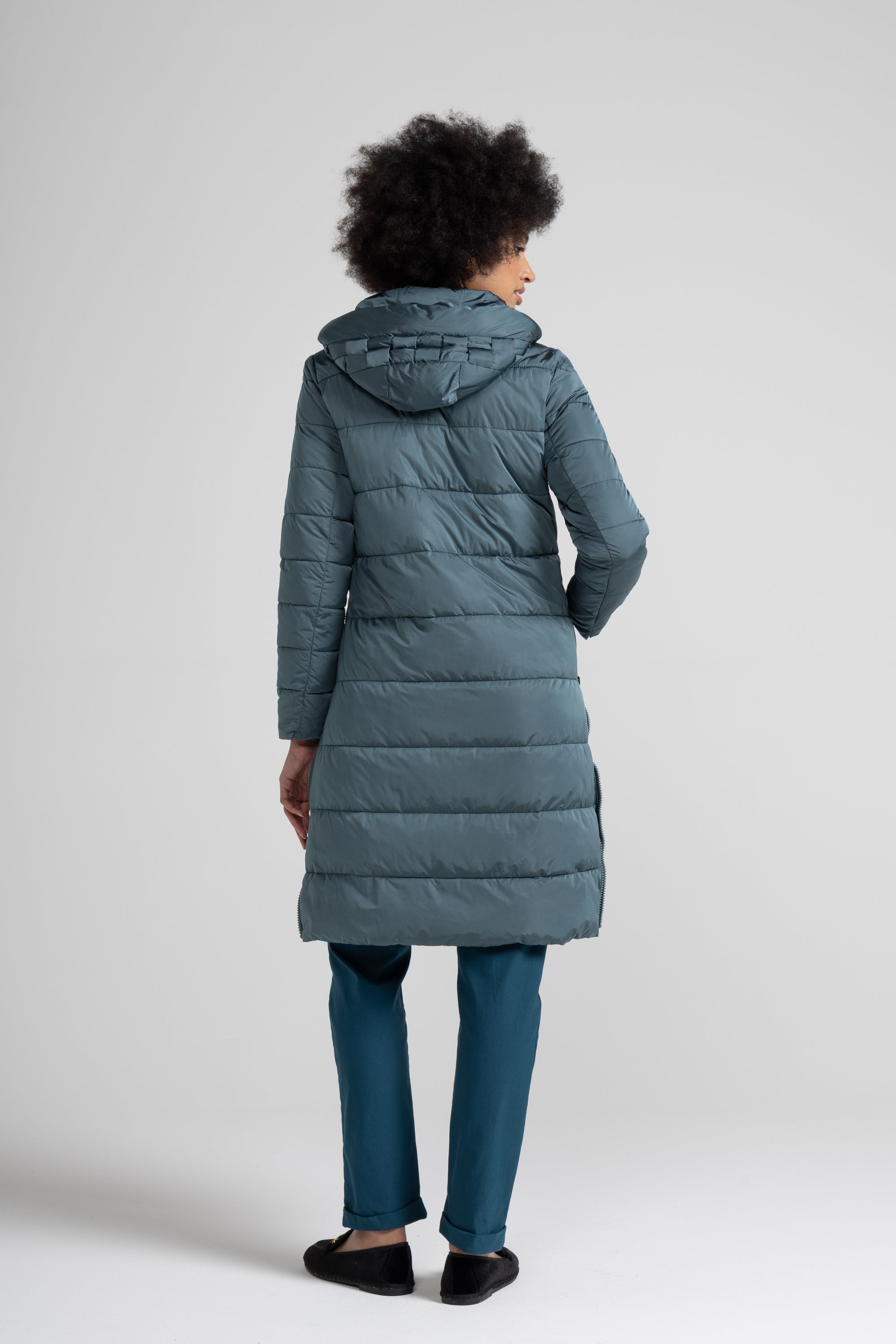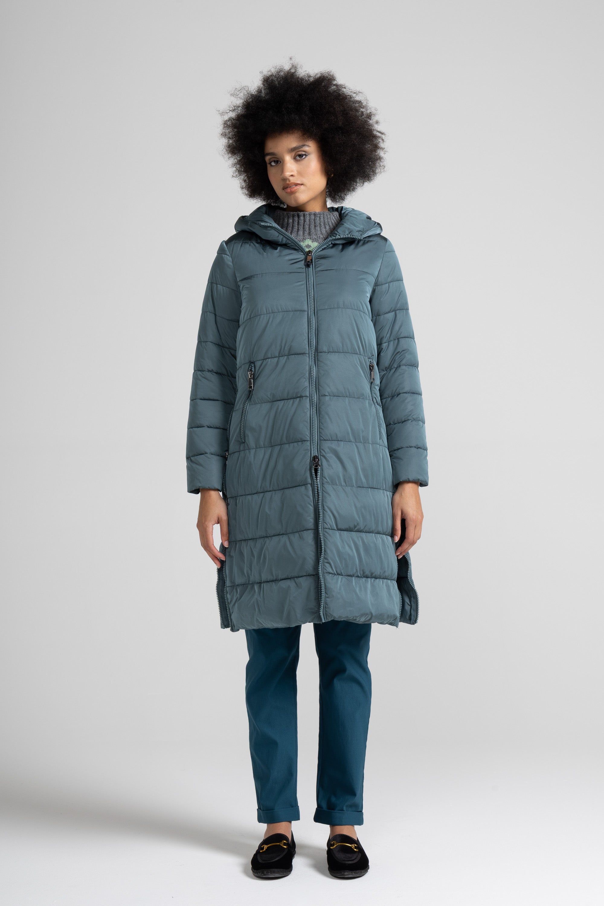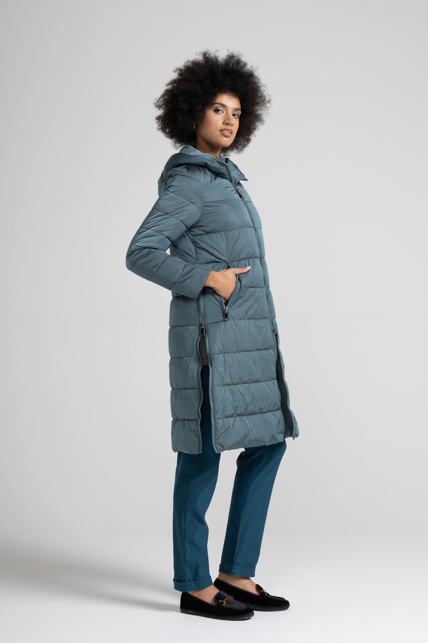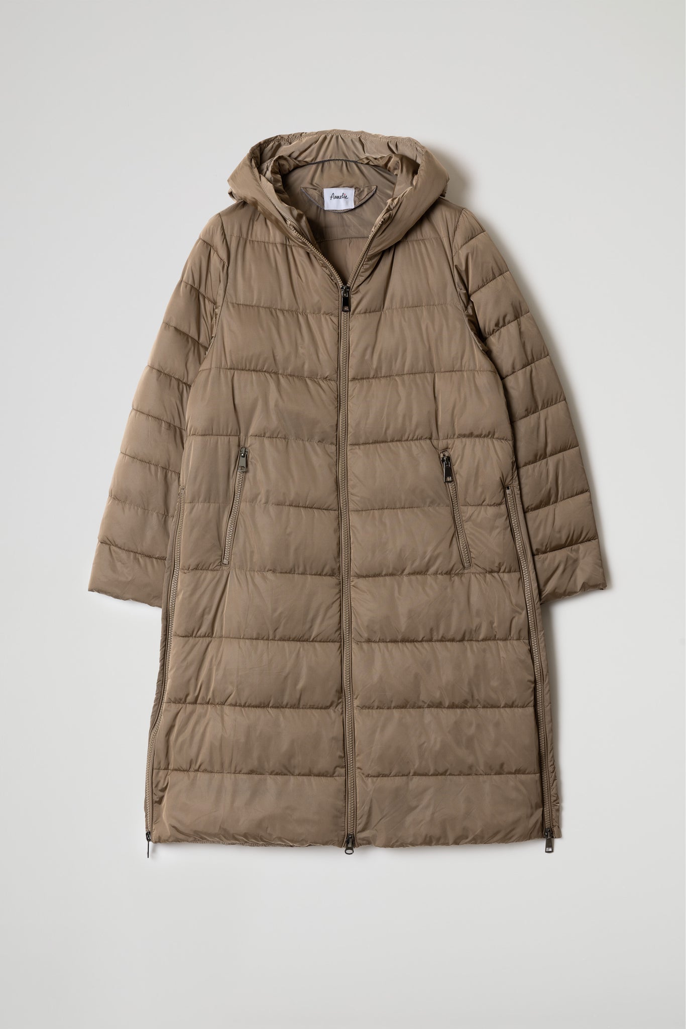 Piumino sagomato lungo, cappuccio fisso con particolare intreccio sul retro, manica lunga, chiusura zip frontale a doppio cursore, tasche laterali con chiusura zip invisibile, zip laterali apribili per maggior libertà di movimento, trapuntatura orizzontale, leggero effetto lucido del tessuto che dona luminosità l capo. Linea confortevole