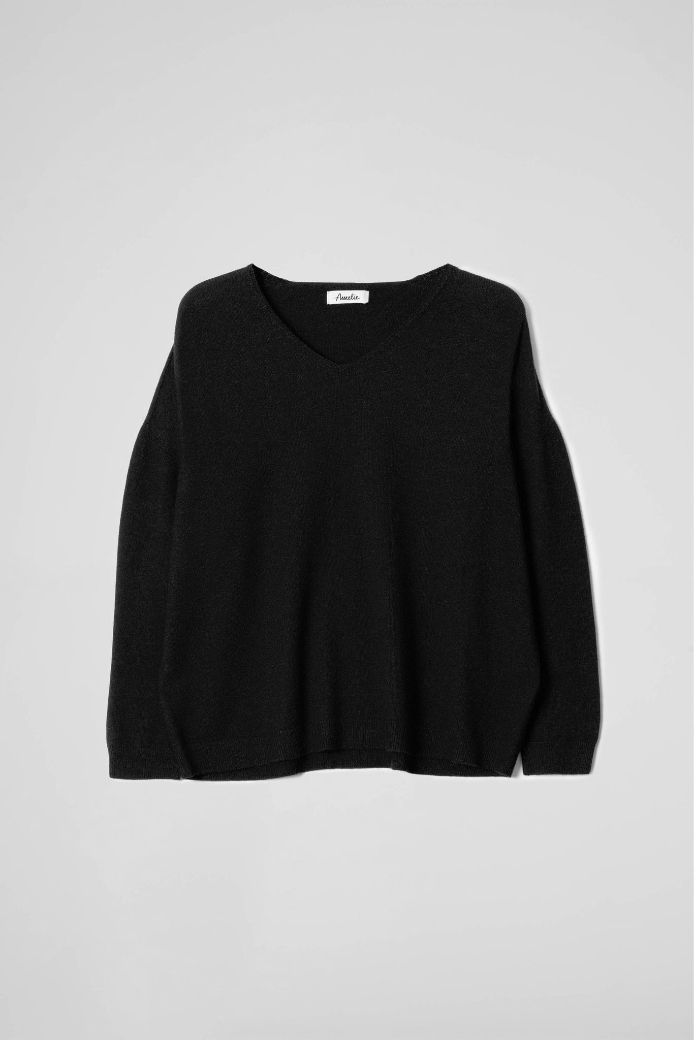 V-neck with a clean, fine-ribbed edge, dropped shoulders, long sleeves, and ribbed elasticated cuffs and hem. Loose fit.