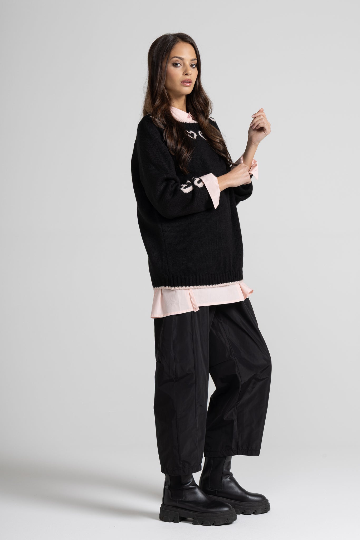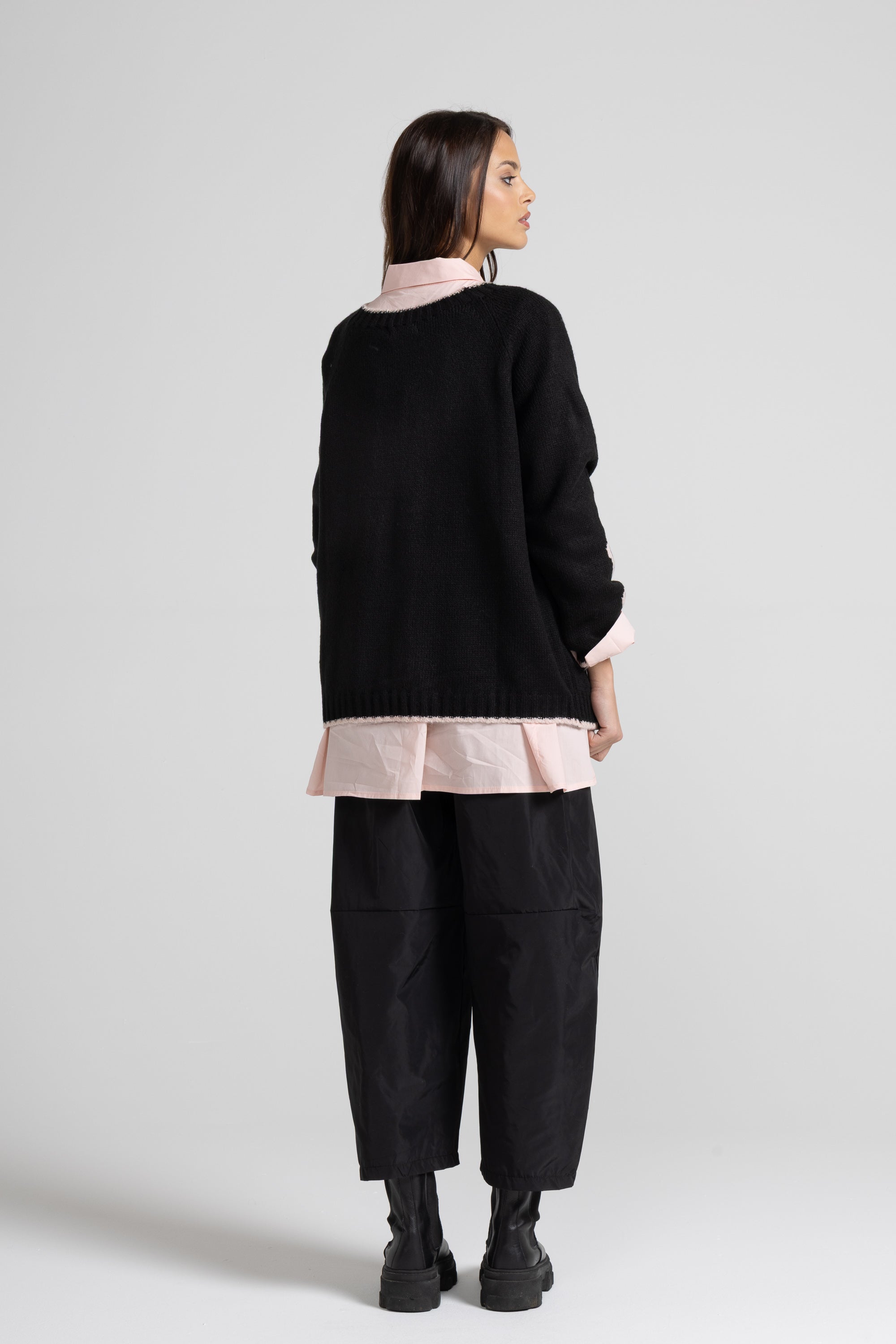 BARREL TROUSERS IN NACRE-EFFECT TAFFETA FABRIC, ELASTIC WAIST, CUT ON THE LEG, SQUARE POCKETS, BAGGY LINE