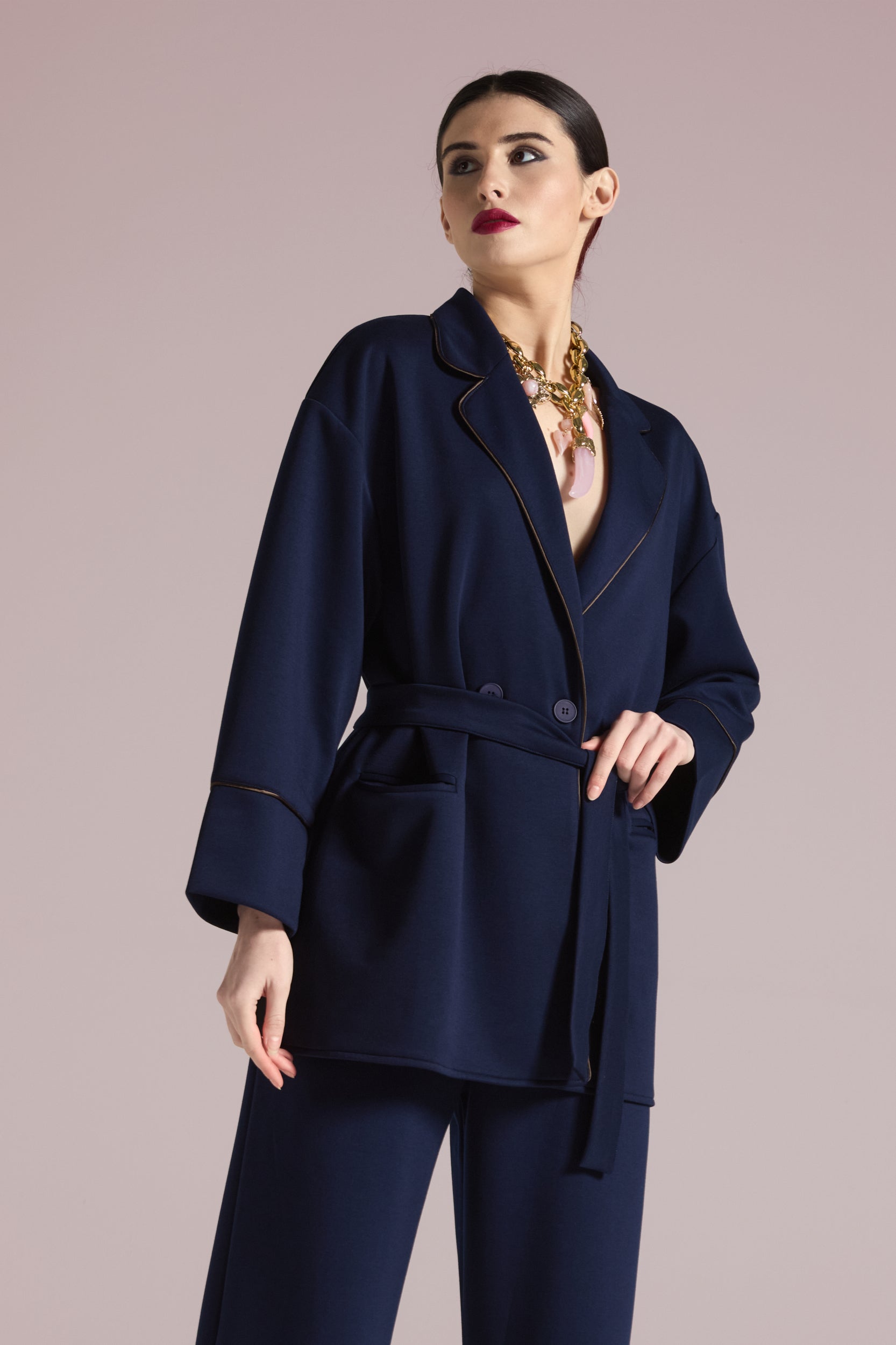 A contemporary jacket, perfect for instantly adding character to even the simplest looks. The fit is soft and slightly oversized , with wide lapels and a refined finish thanks to the contrasting trims that define the edges and sleeves. Wear open or cinched at the waist with the matching sash to accentuate the silhouette.