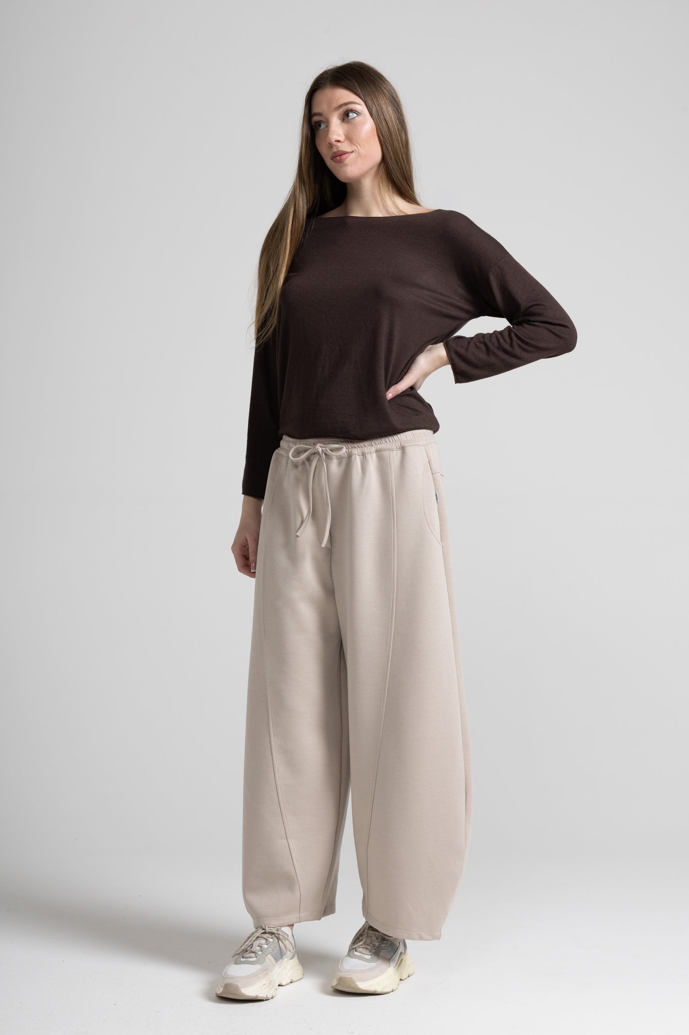 Baggy trousers, the perfect blend of urban comfort and contemporary style. Their loose, flowing cut moves naturally with you, lending a relaxed yet refined allure. A garment that exudes freedom, personality, and comfort, ideal for those who love to dress stylishly without sacrificing practicality.