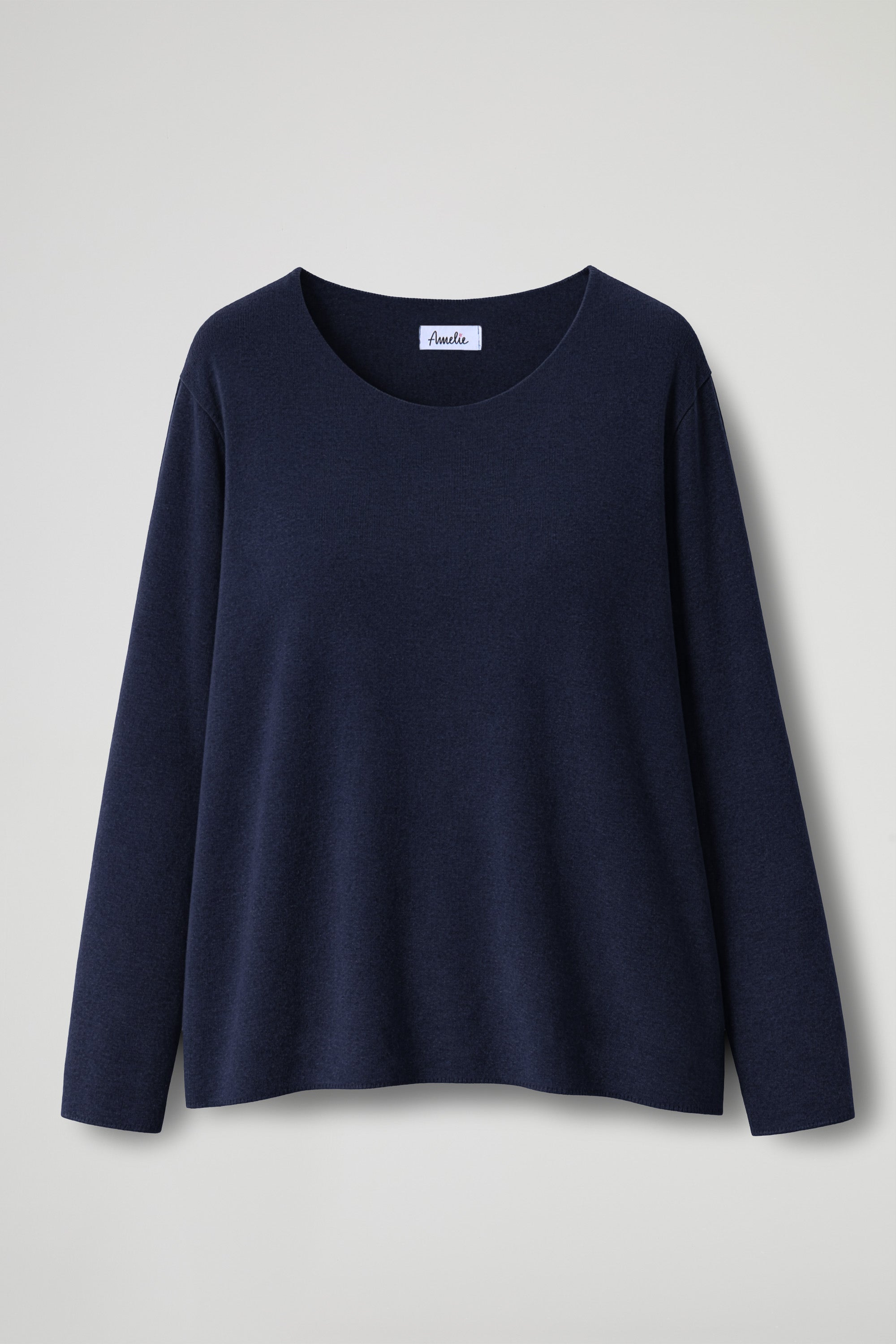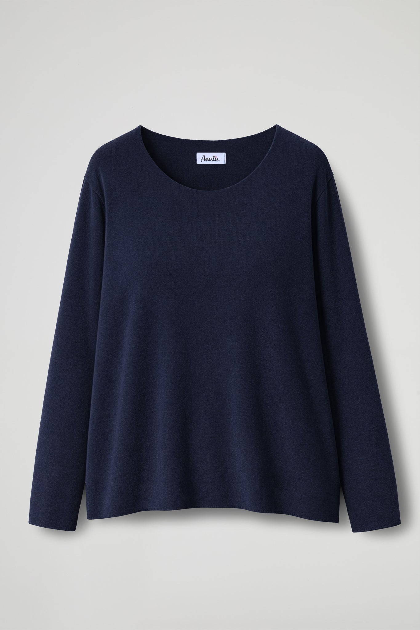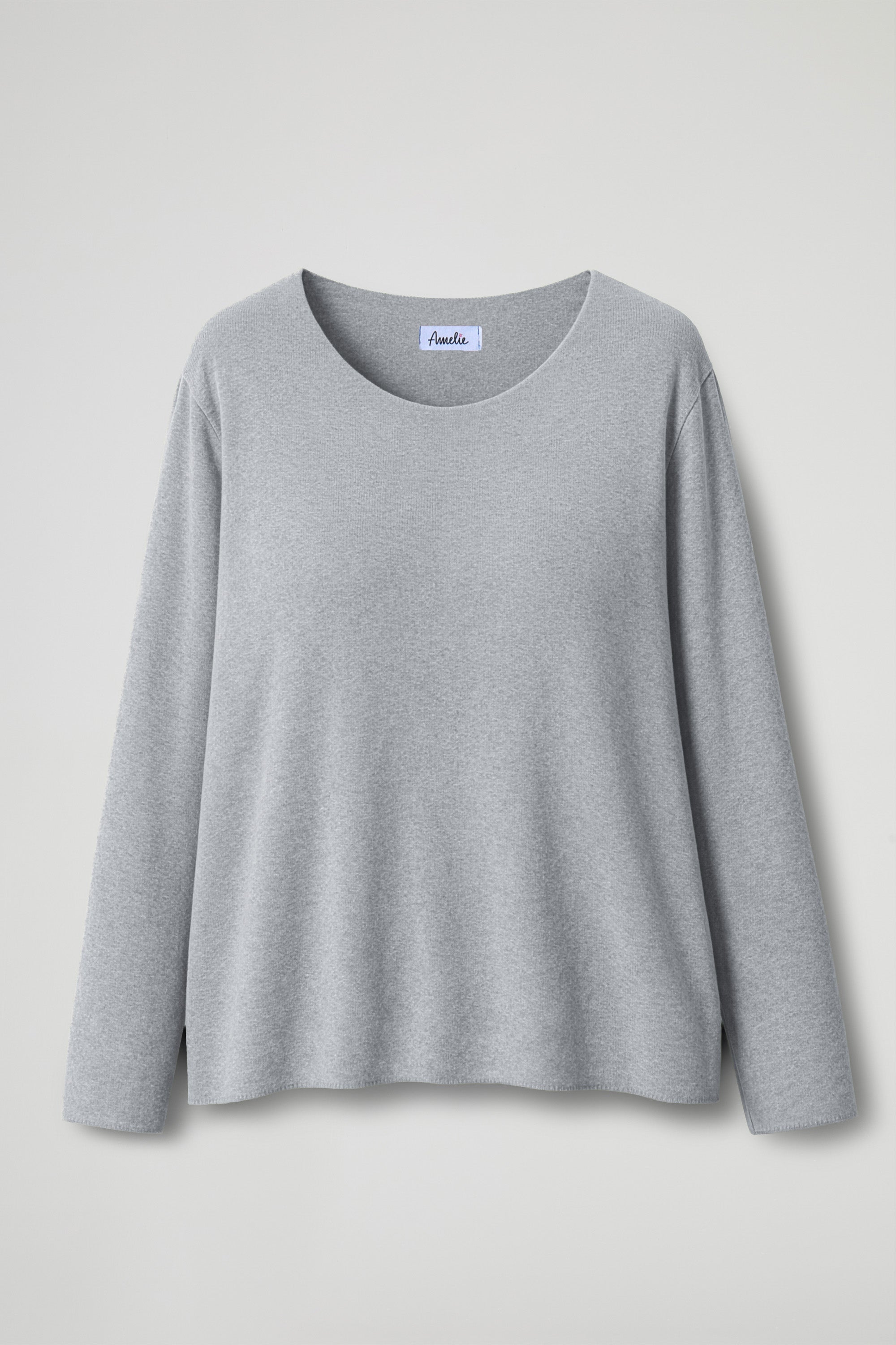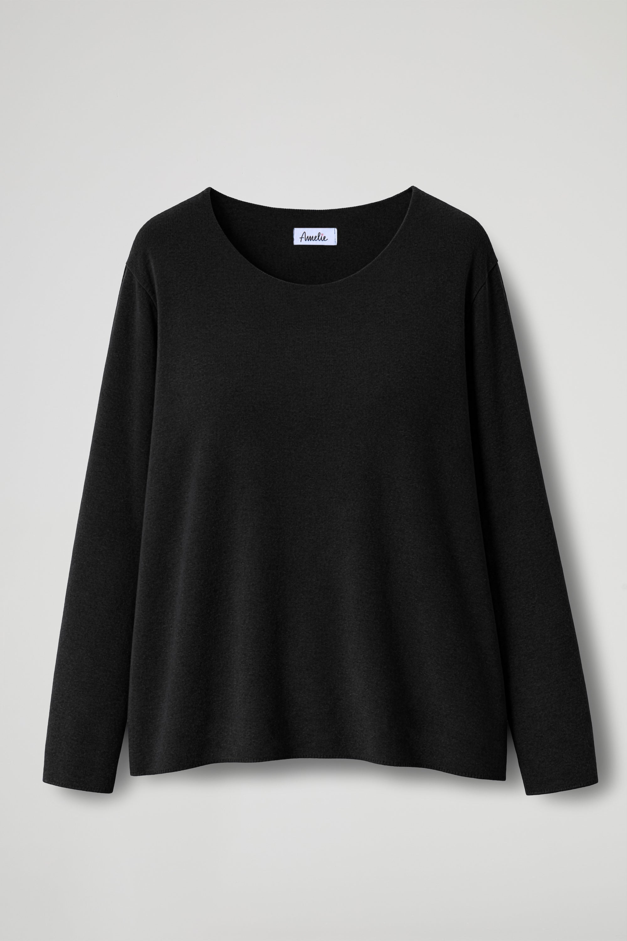 Maglia in tessuto di viscosa, collo ampio , spalle leggermente scese manica lunga, taglio leggermente stondato sul fondo. Linea morbida