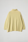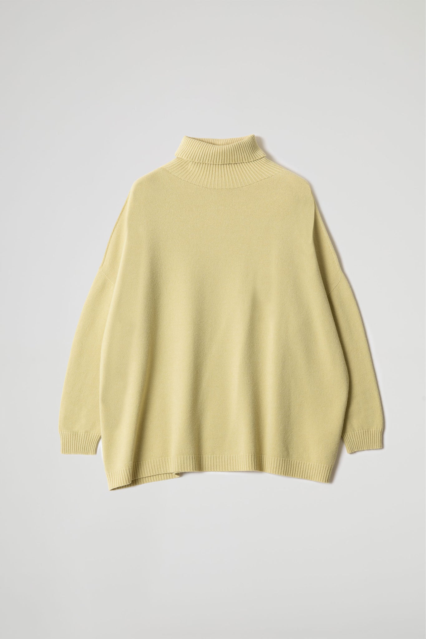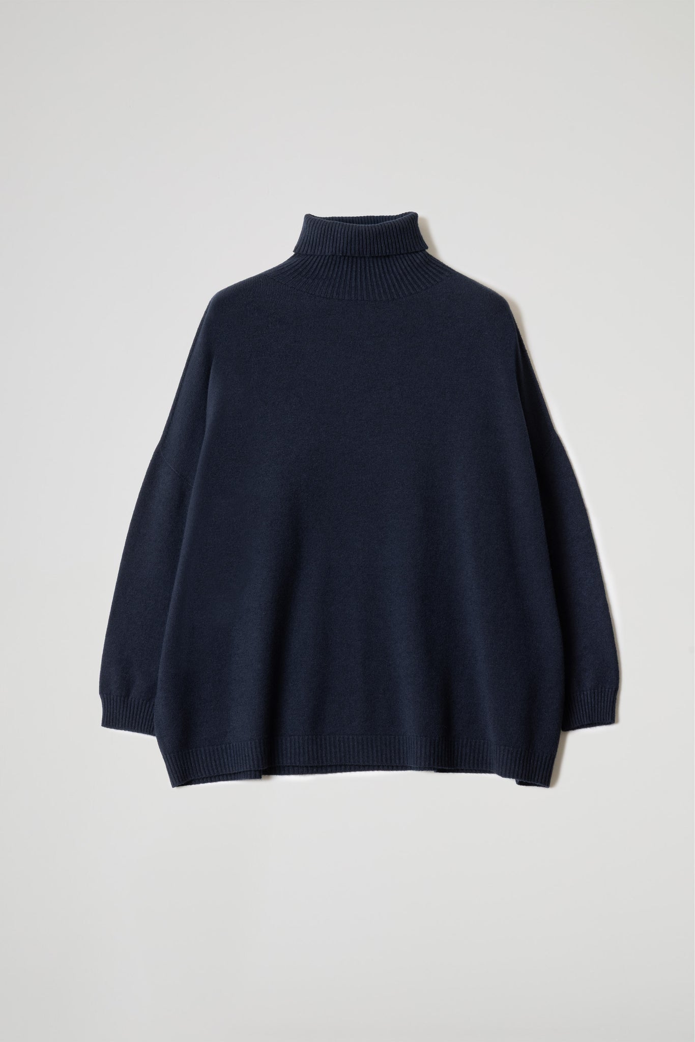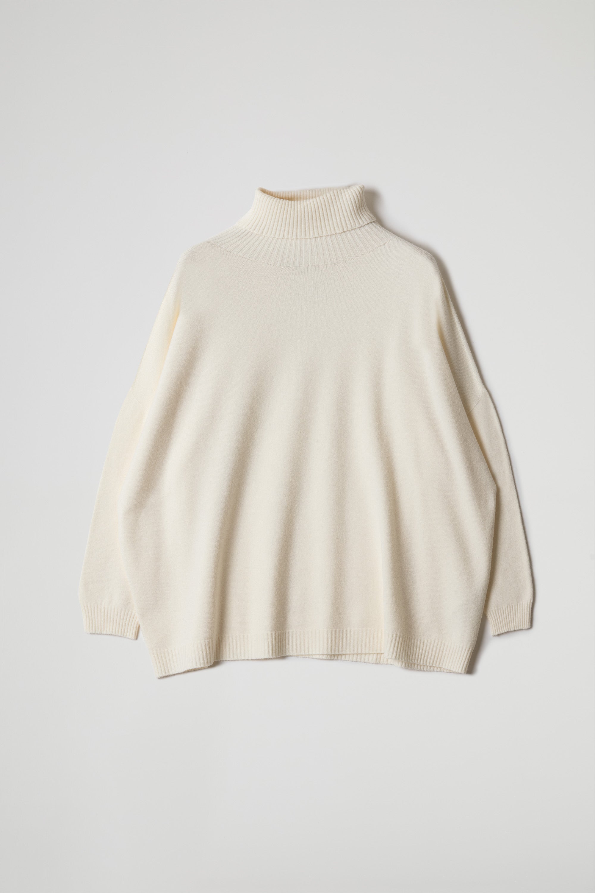 Collo alto e avvolgente a coste elasticizzate, spalle scese, maniche lunghe con polsini a costine fini elasticizzate, leggermente asimmetrico, lavorazione a bordo alto a costine compatte sul fondo. Linea ampia
