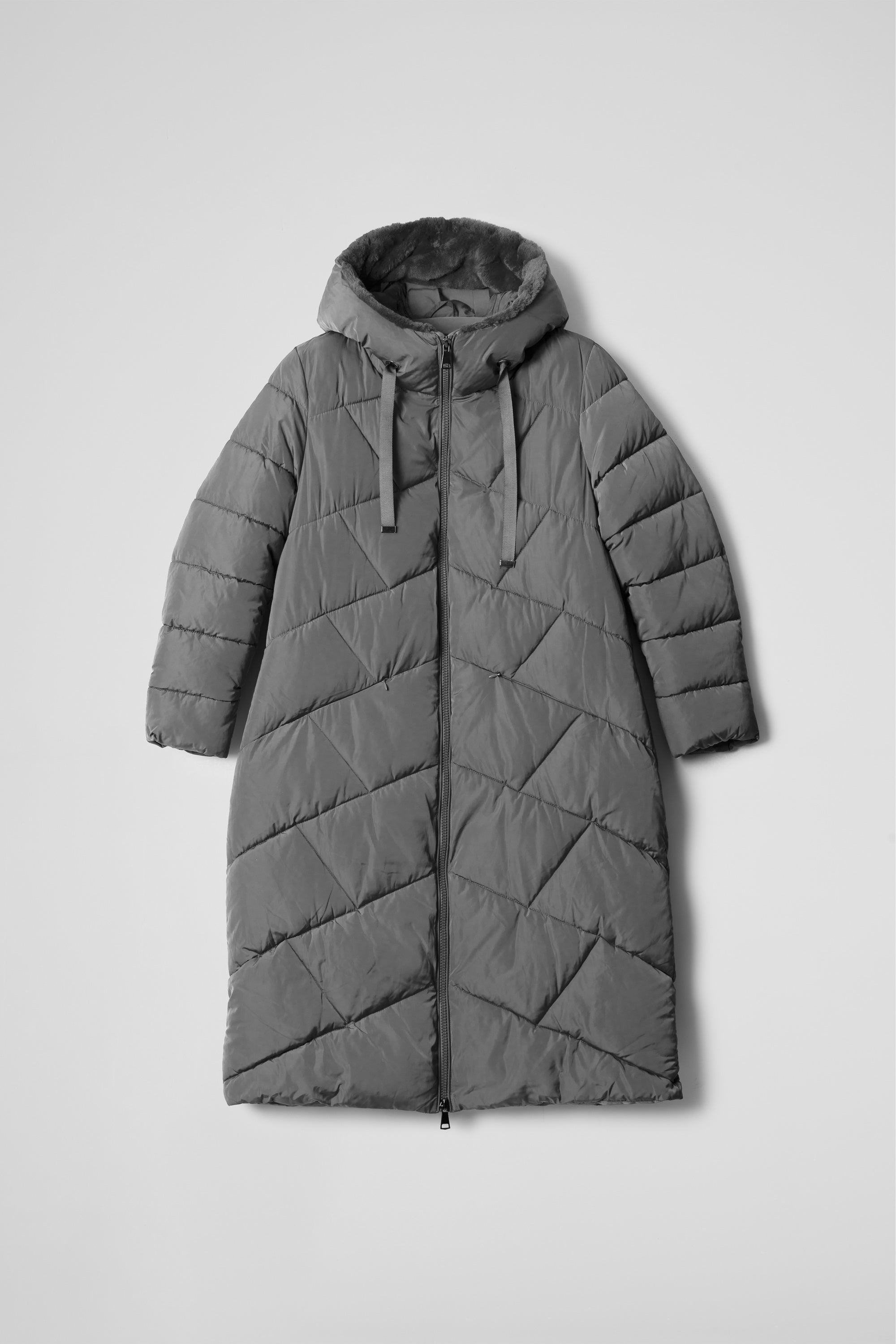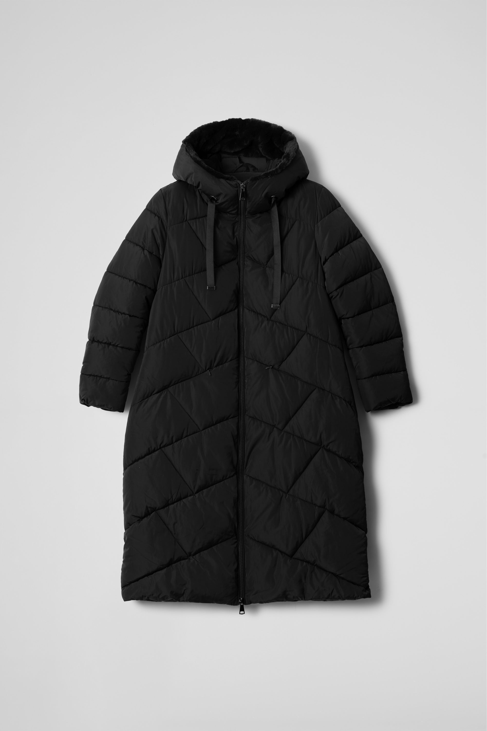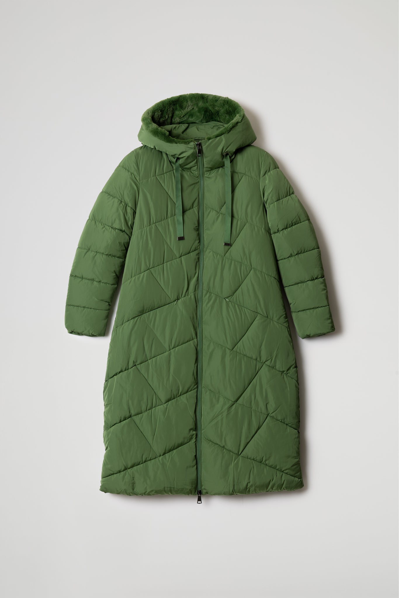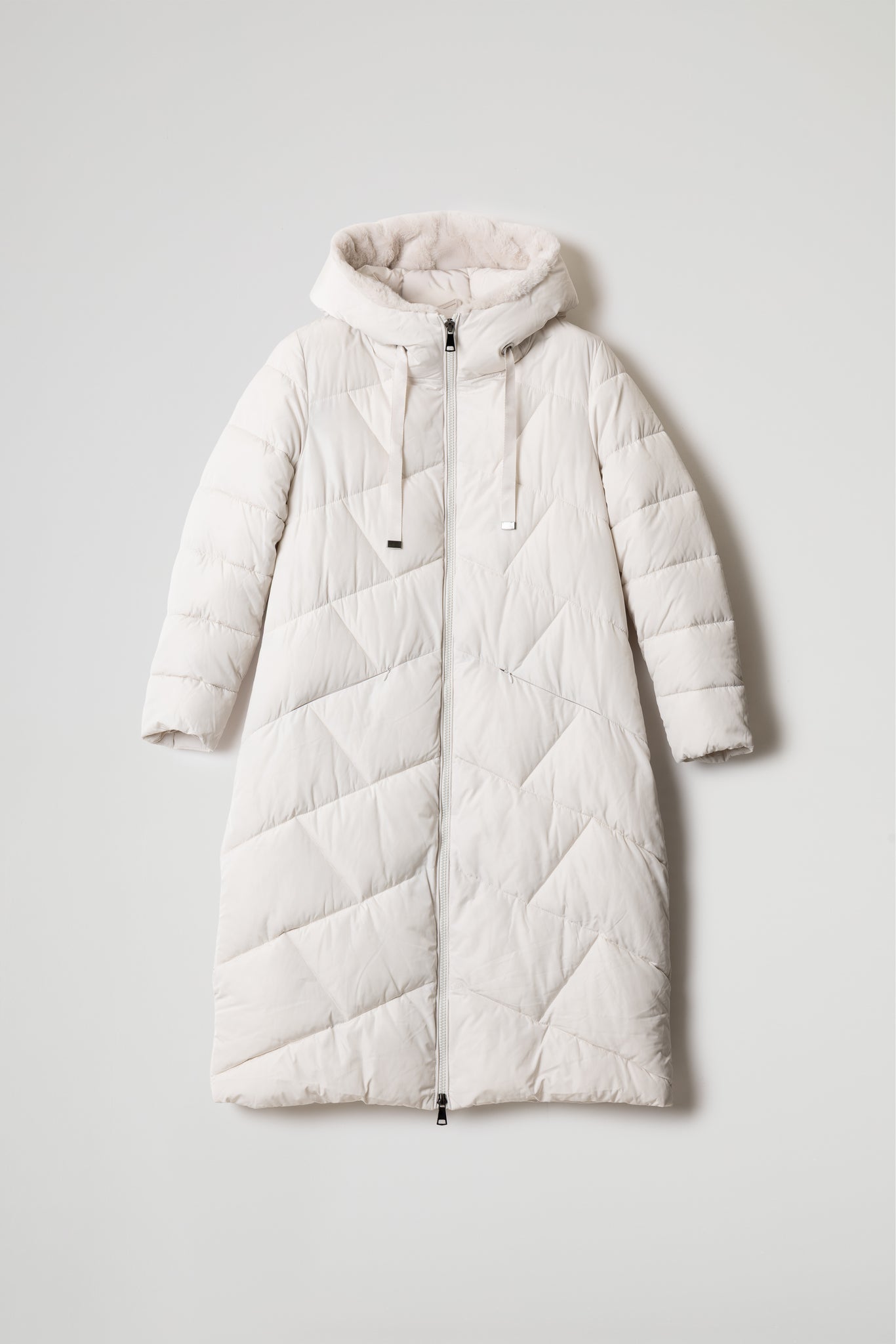 Long down jacket, large and enveloping faux fur hood adjustable with matching ribbons and metal tips, long central zip with double slider, side pockets with invisible zips, quilted detail throughout. Loose fit.