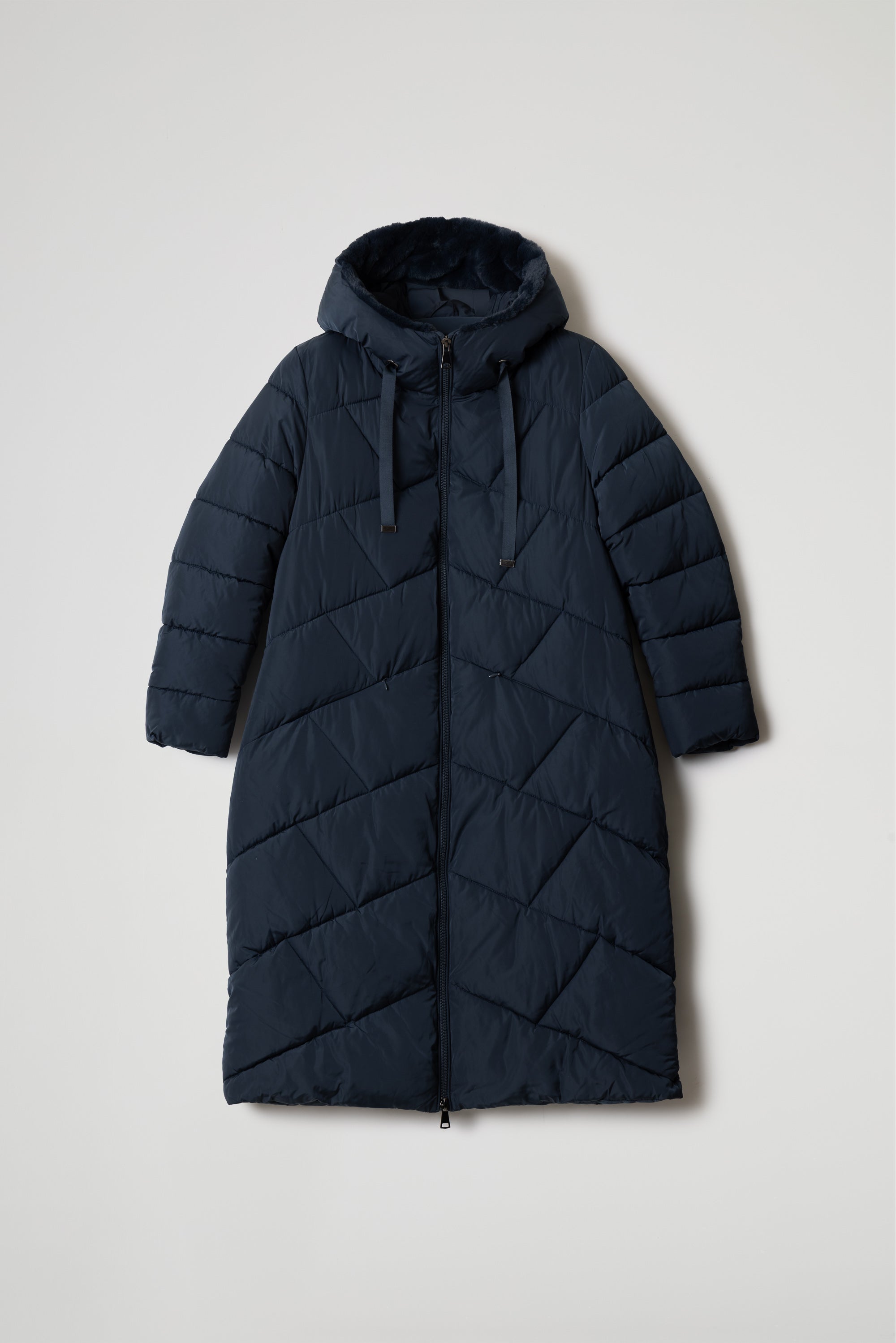 A long down jacket with a simple yet refined design, featuring a slightly flared line that accentuates the figure and allows for a comfortable fit even over sweaters or heavier garments. The diamond quilting adds movement to the garment and helps distribute heat evenly.