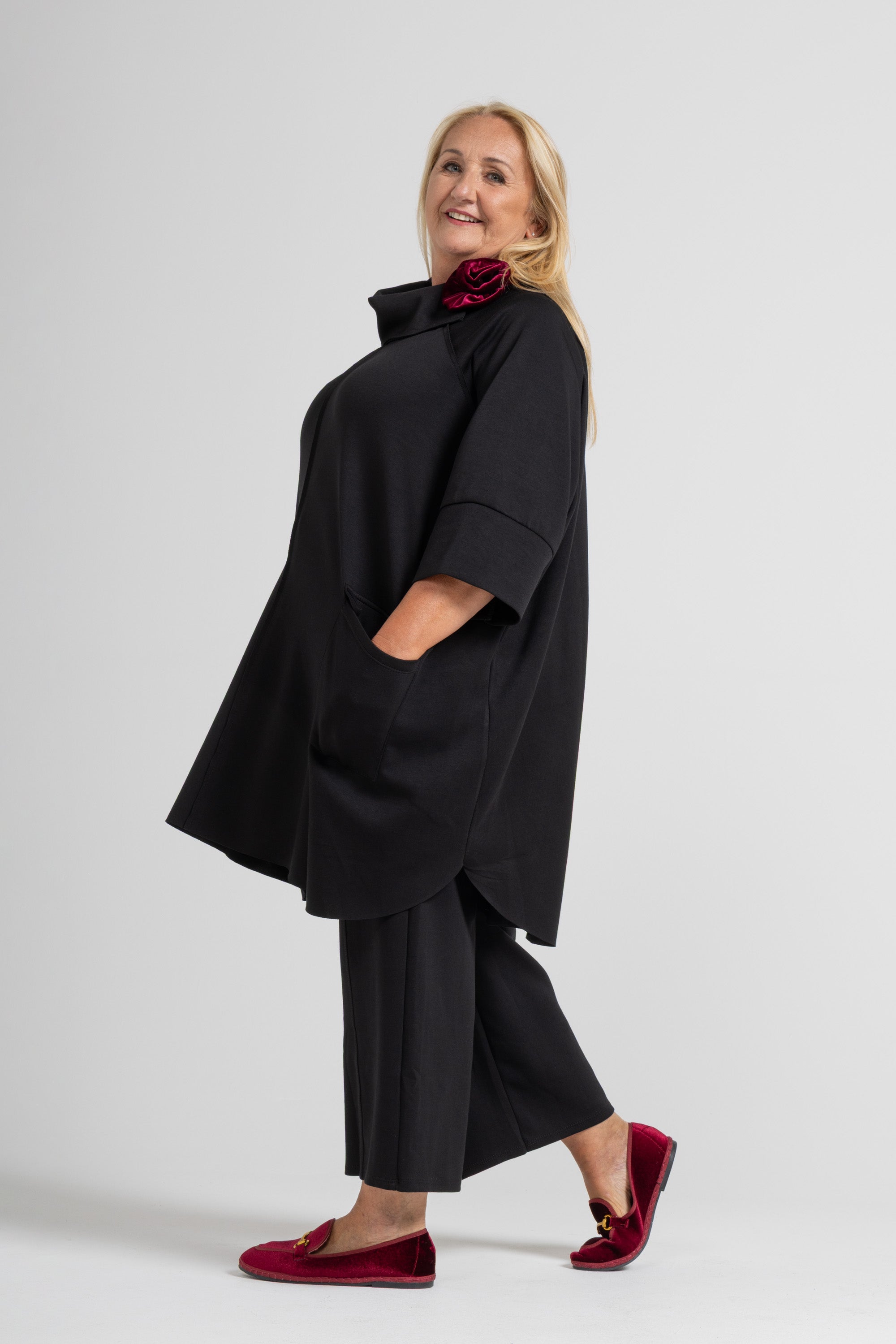 TOP OVER IN TESSUTO FLUIDO DI VISCOSA, MANICA LUNGA TAGLIO RAGLAN, COLLO ASIMMETRICO AD ANELLO RIGIRATO, DETTAGLIO TAGLIO A VIVO, TASCHE A TOPPA SUL FRONTE, ORLO A PETALO. LINEA OVER