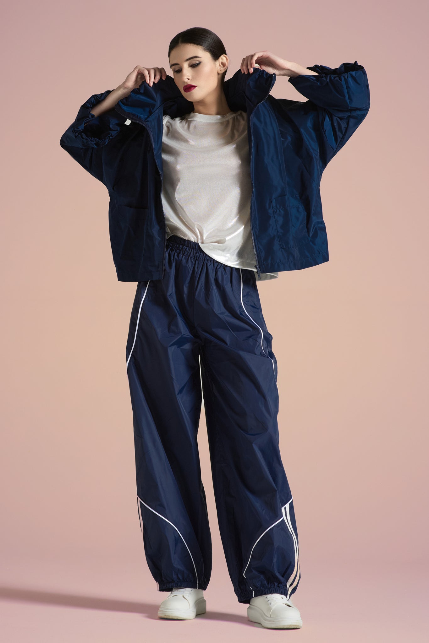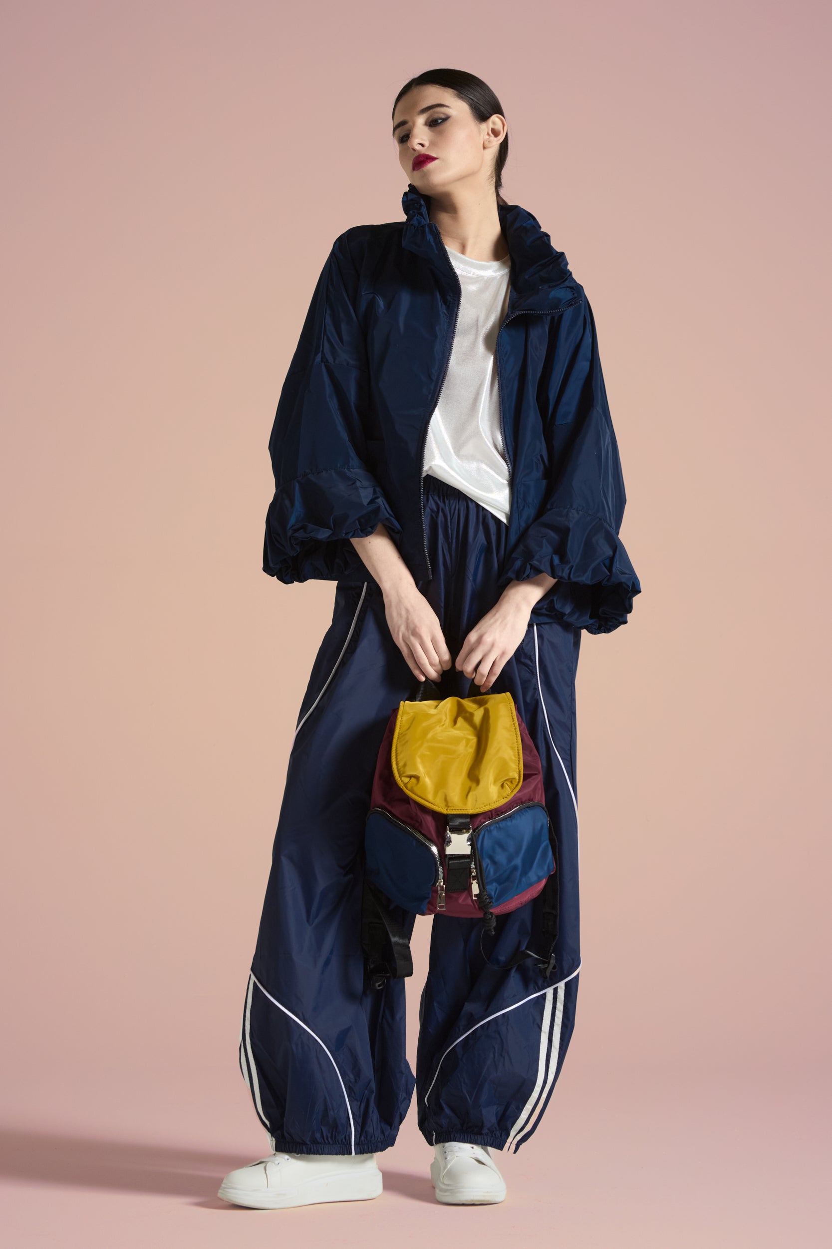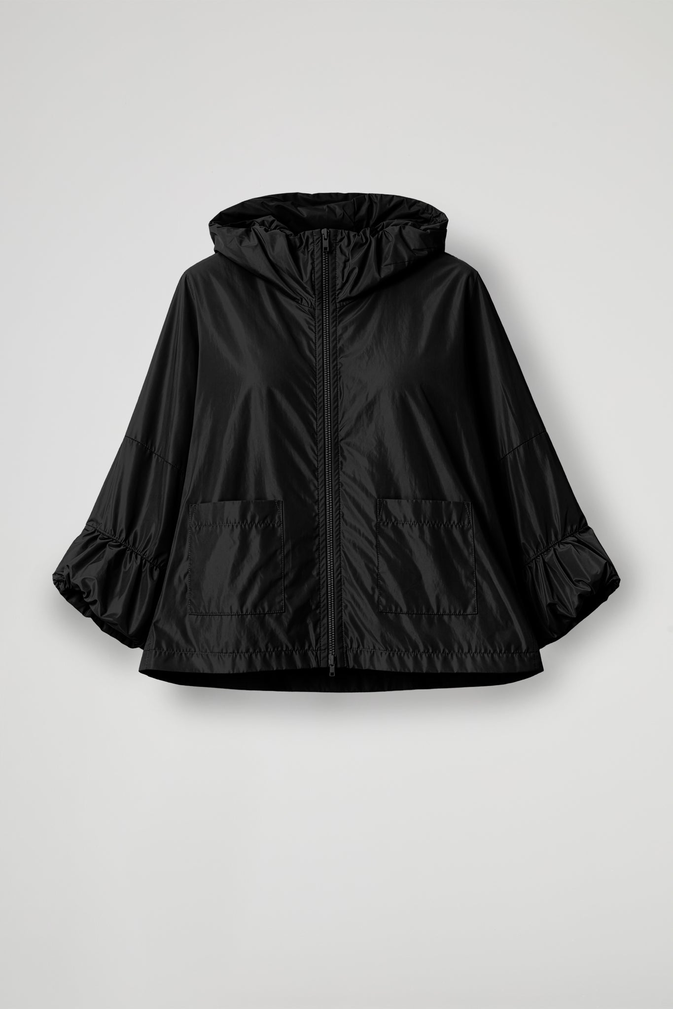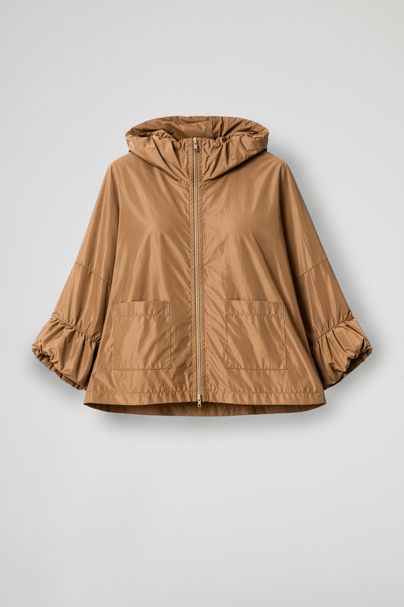 Giacca in tessuto tecnico , leggera e protettiva, dalla mano liscia e dall’aspetto lucido. Modello a volume ampio con spalle scese, pensato per una vestibilità comoda e contemporanea.