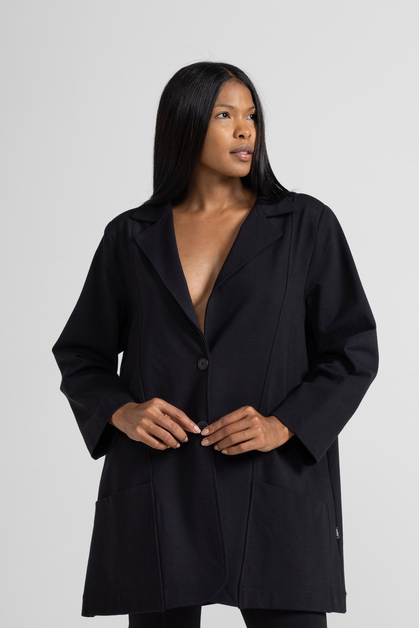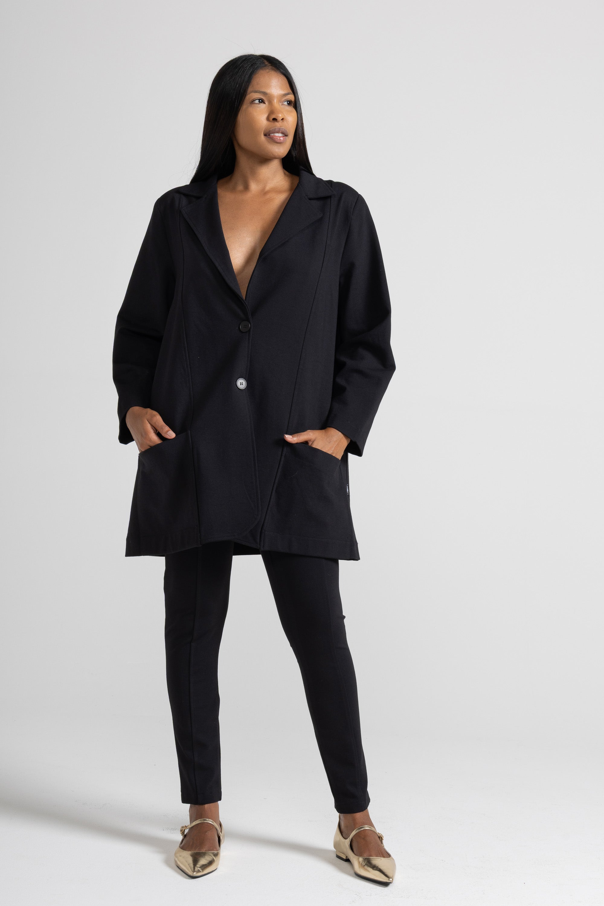 OVERSIZED BLAZER IN STRETCH VISCOSE MILANO STITCH FABRIC, LONG SLEEVES, FRONT STITCHING, REVERSE COLLAR, MAXI PATCH POCKETS, BACK SPLIT, BUTTON CLOSURE. OVERSIZED LINE