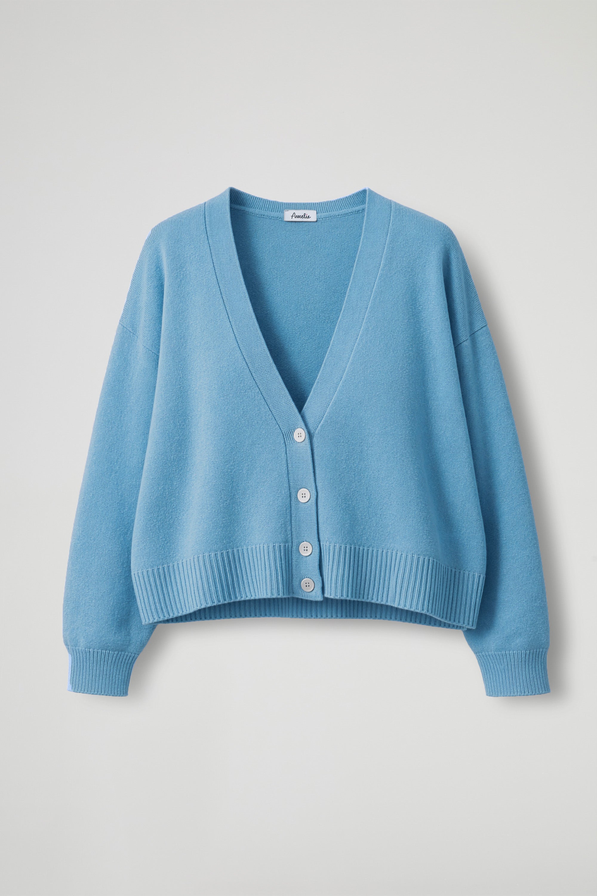 Deep V-neck cardigan with dropped shoulders and slightly balloon sleeves, ribbed hem, front closure with pearly buttons, and asymmetrical hem that's shorter at the front with ribbed detail. Soft fit.