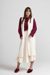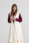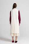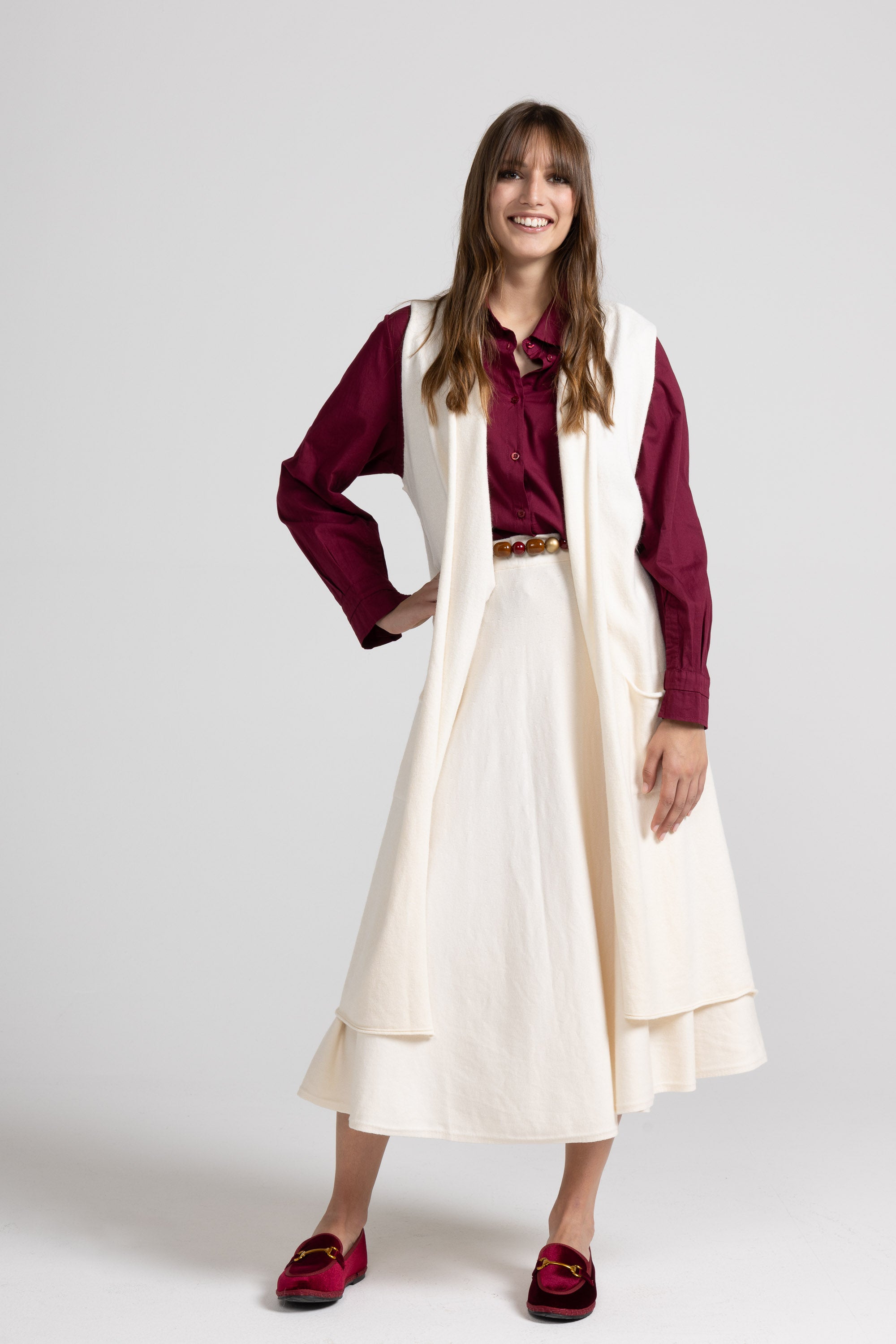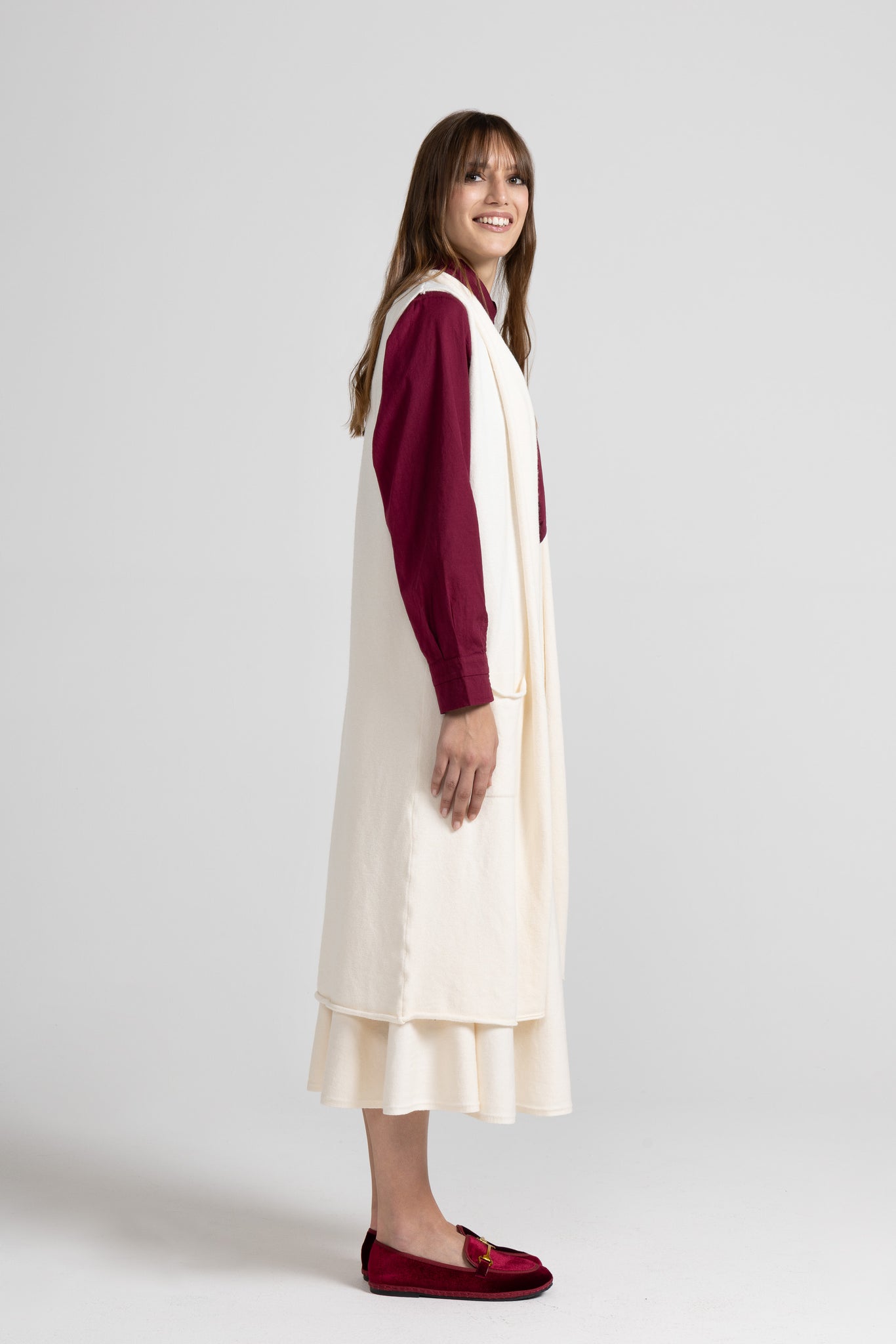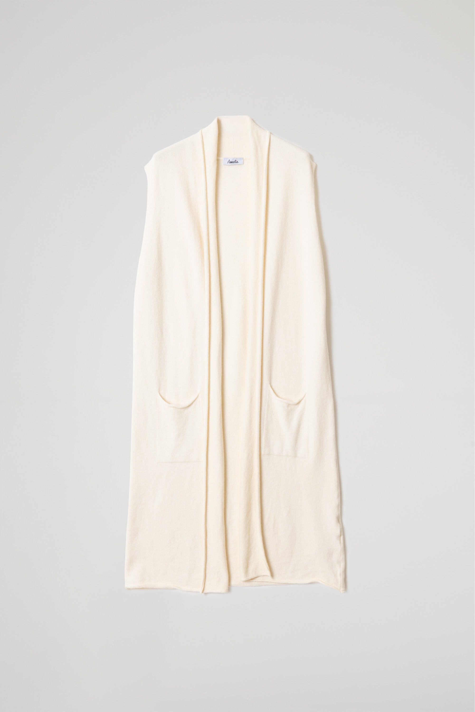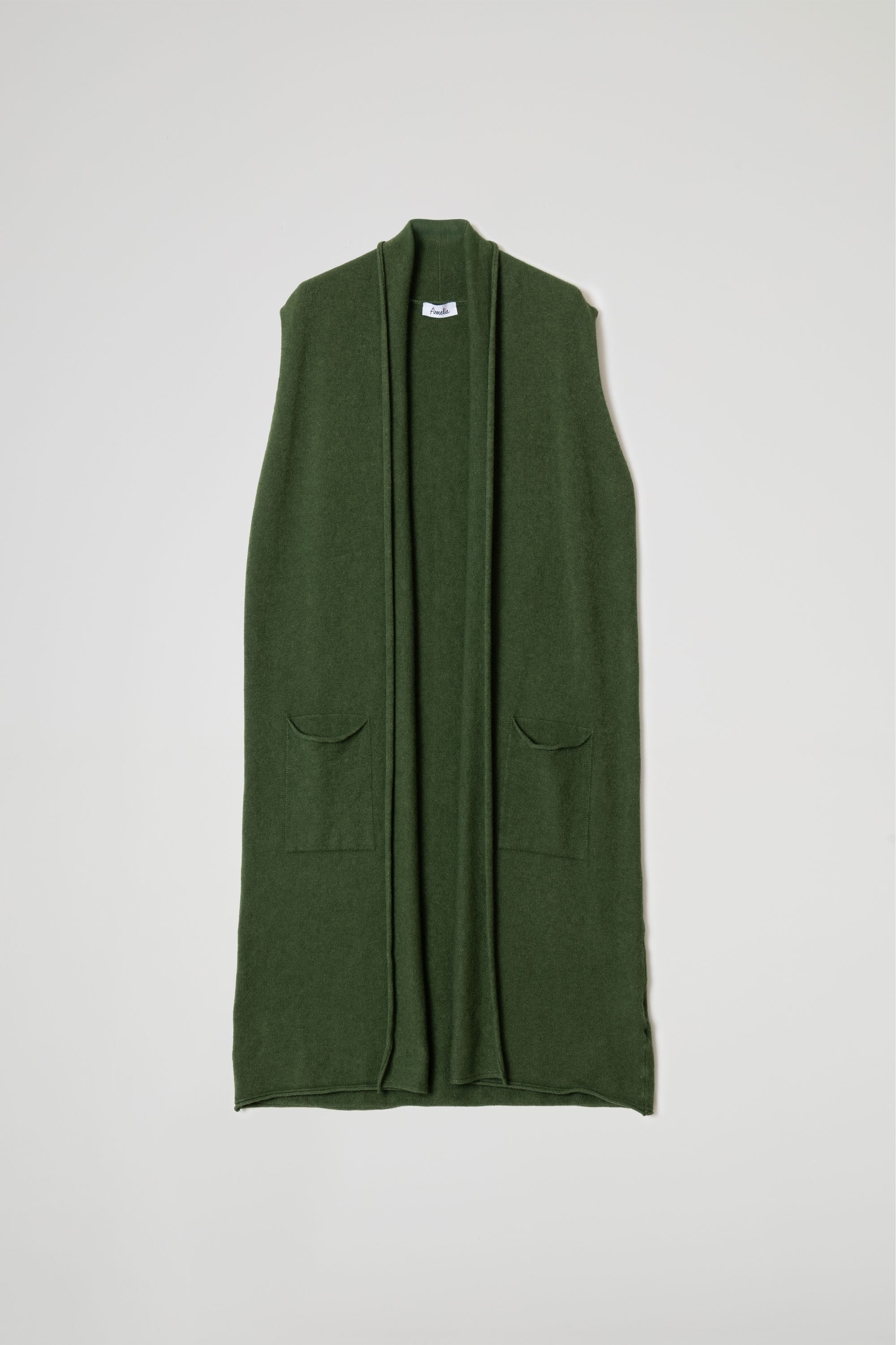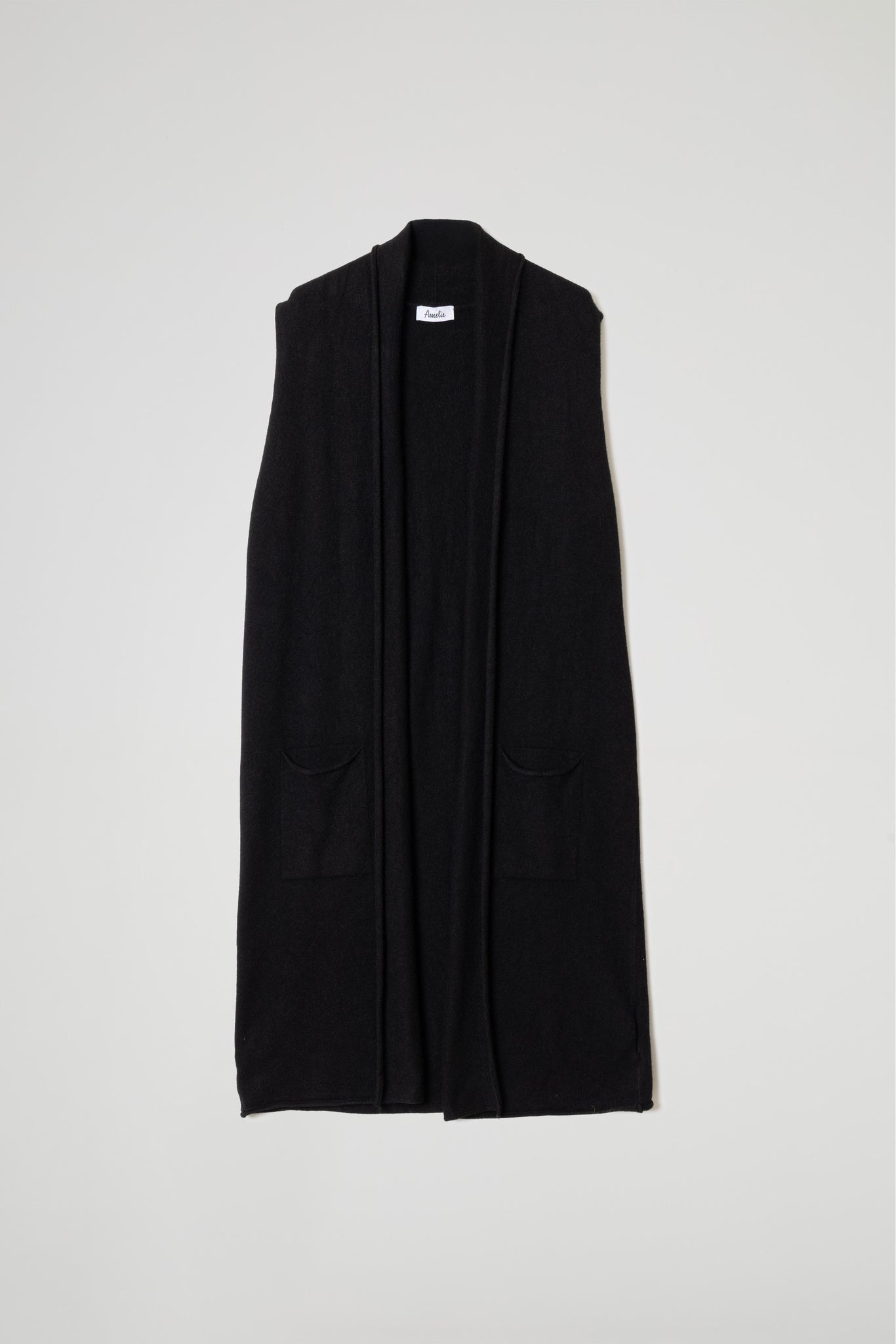 Sleeveless in soft viscose jersey, shawl collar, front opening without buttons, front patch pockets with decorative flap, clean-cut finished edges. Wide fit.