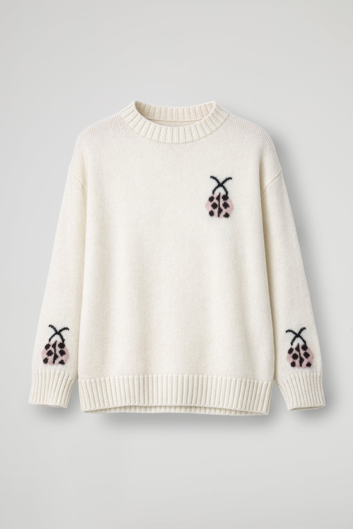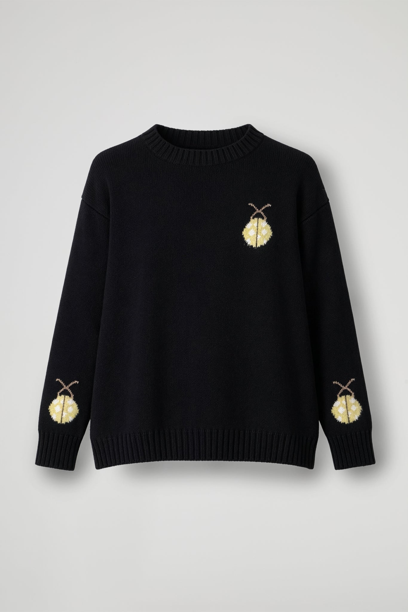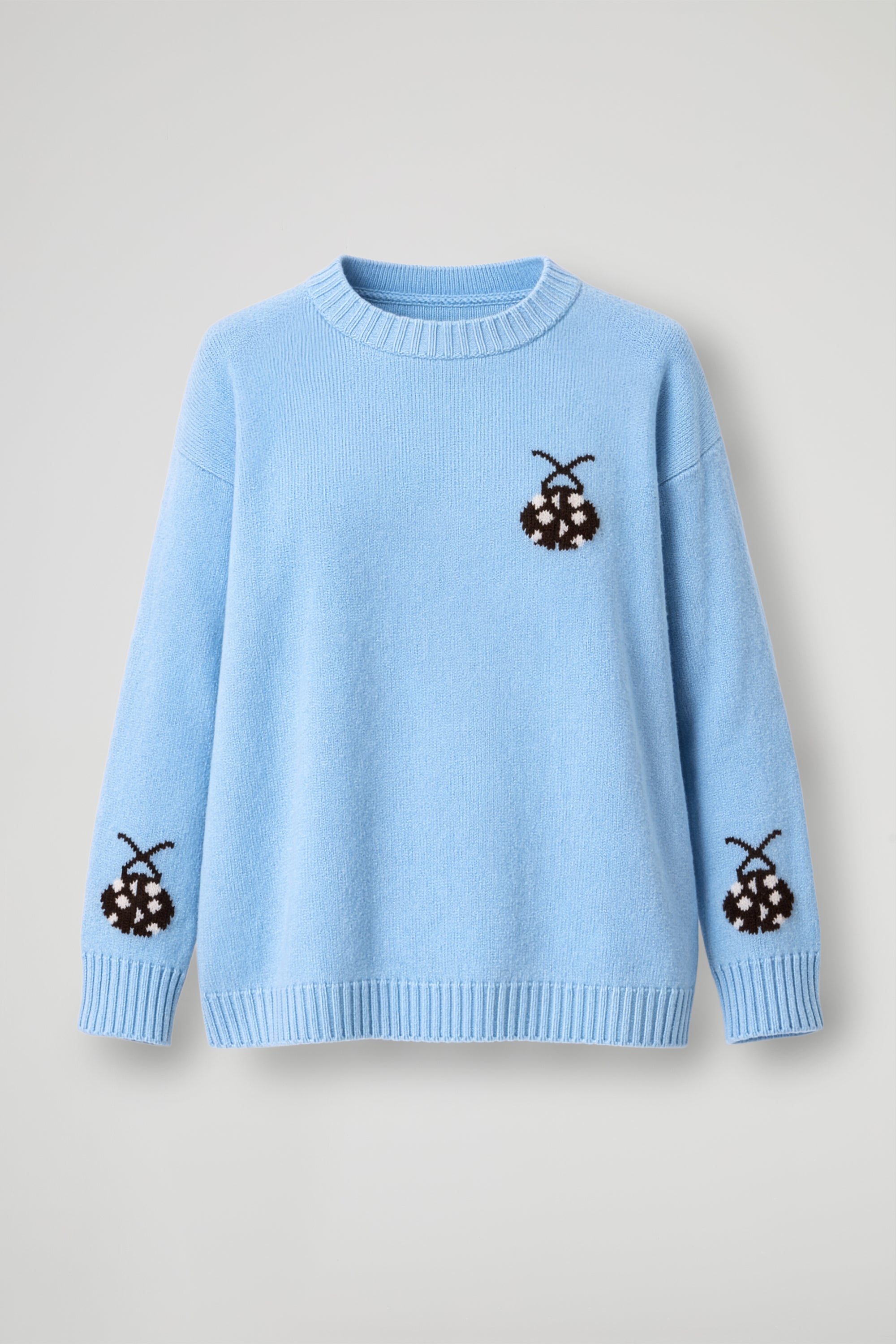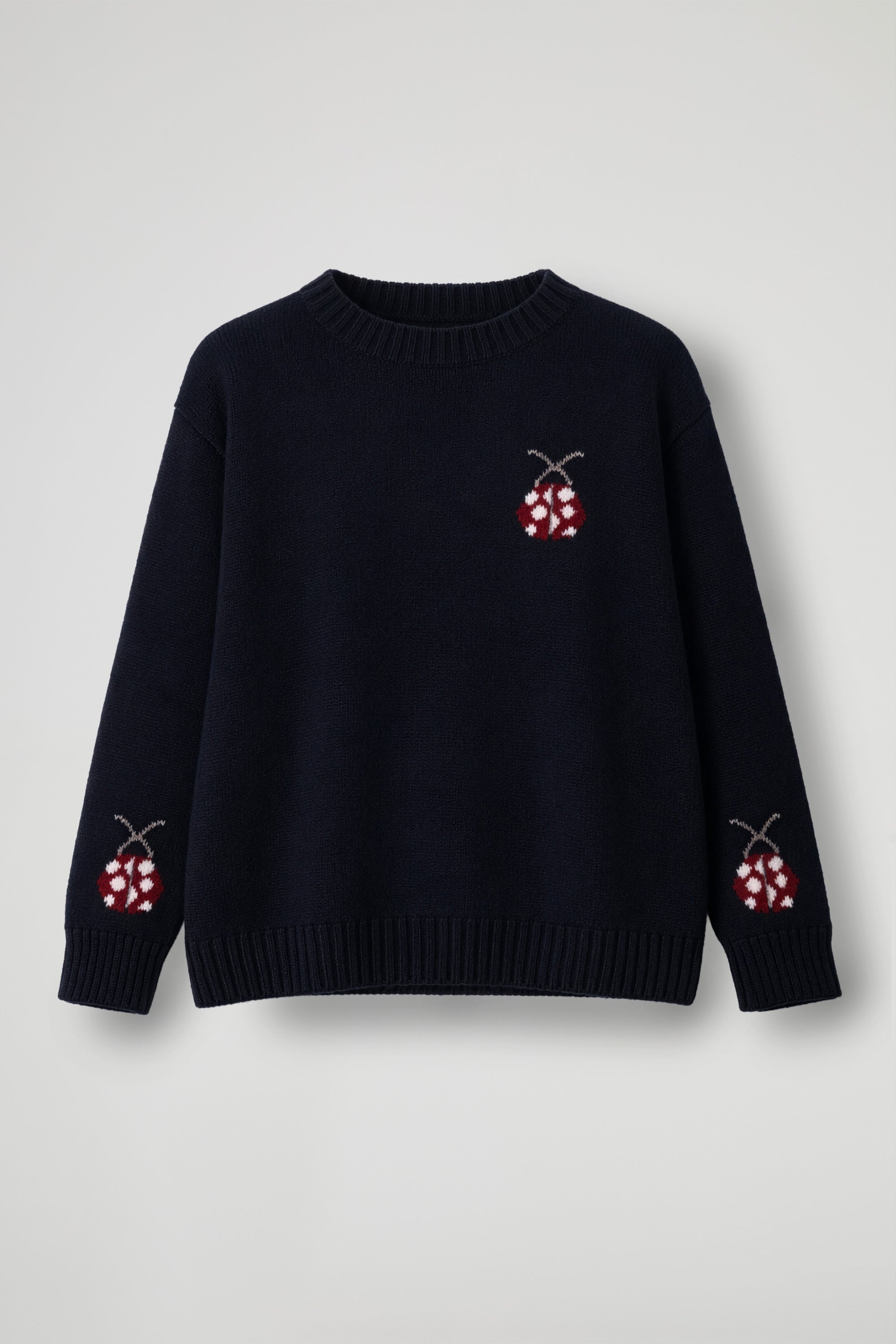 A playful sweater in soft knit with a cute ladybug embroidery: one on the front and matching details on the sleeves, for a playful yet refined touch. The straight, comfortable fit features a crew neck and ribbed trims at the hem and cuffs that maintain shape and enhance the fit. Perfect with jeans and sneakers for daytime, but also with a skirt or tailored trousers for a bold twist.