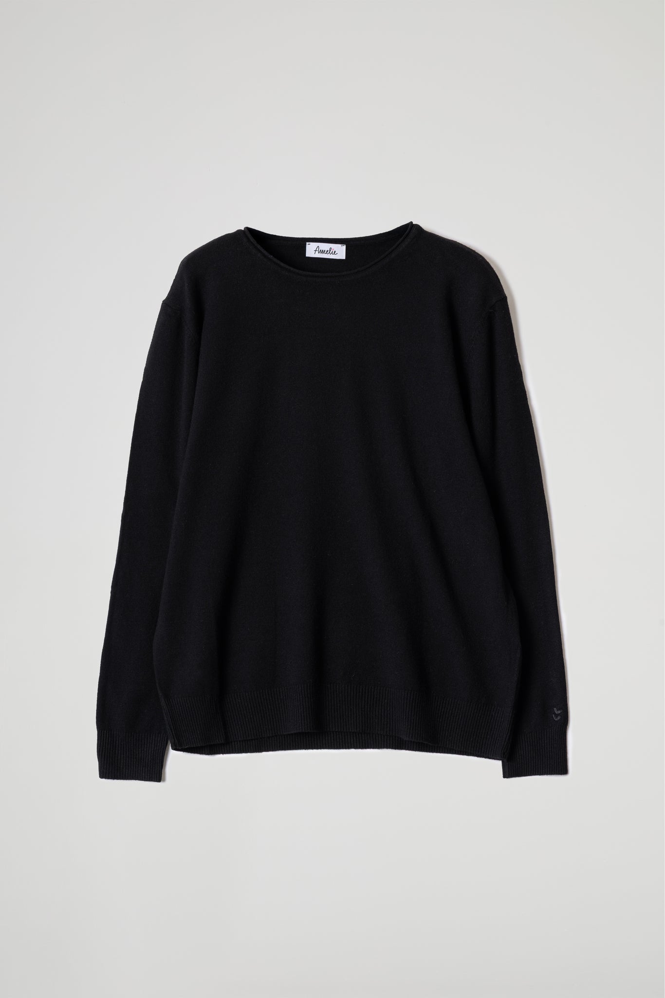 Slightly asymmetrical viscose sweater, round neckline with raw-cut detail, dropped shoulders, long sleeves with high elastic ribbed cuffs, rounded hem with high ribbed hem. Soft fit.