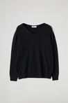 Maglia in viscosa leggermente asimmetrica, scollo a V dettaglio taglio vivo, spalla scesa, manica lunga con polsino alto a costine elasticizzate, fondo stondato con orlo alto a costine. Linea morbida