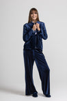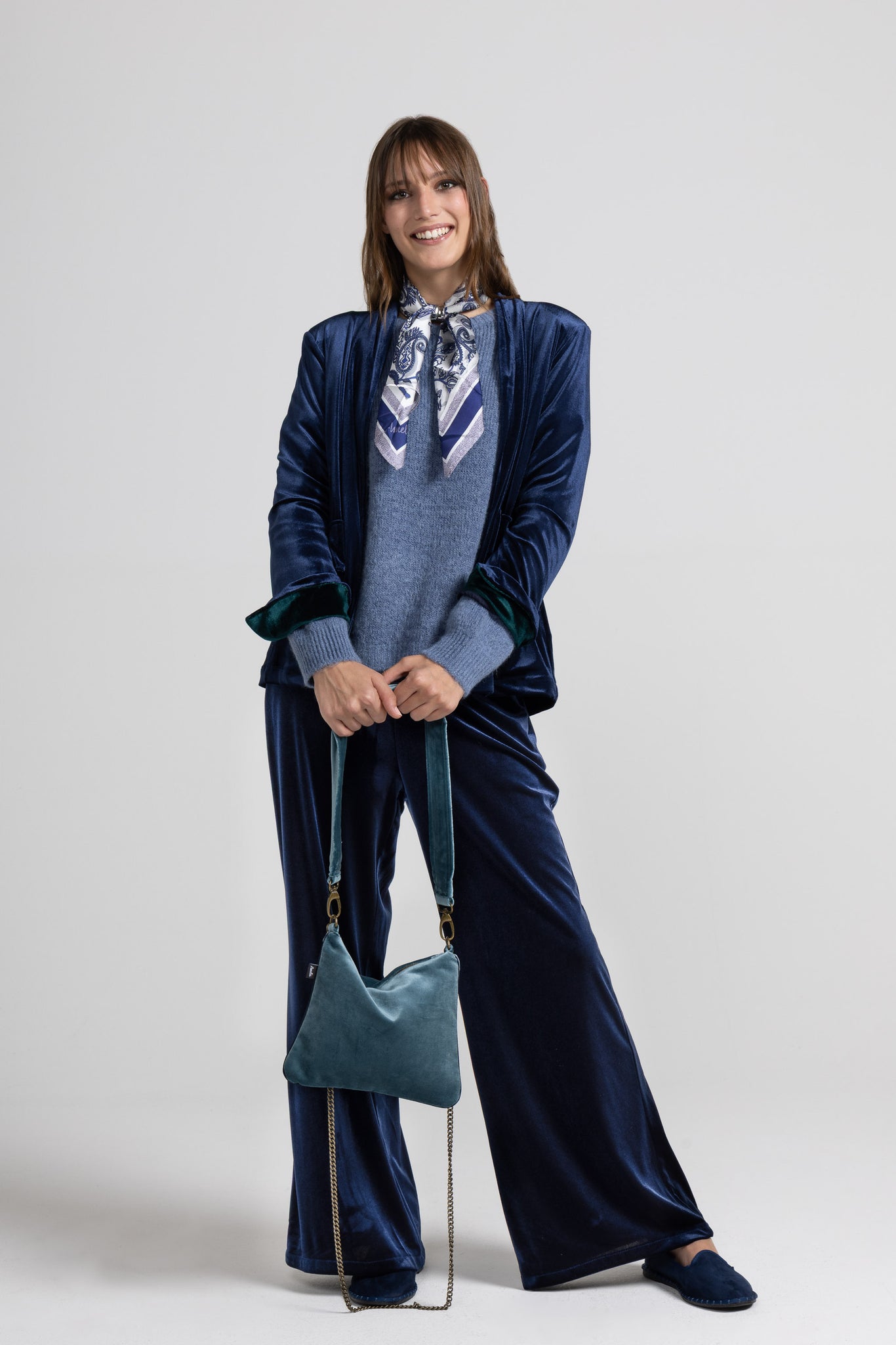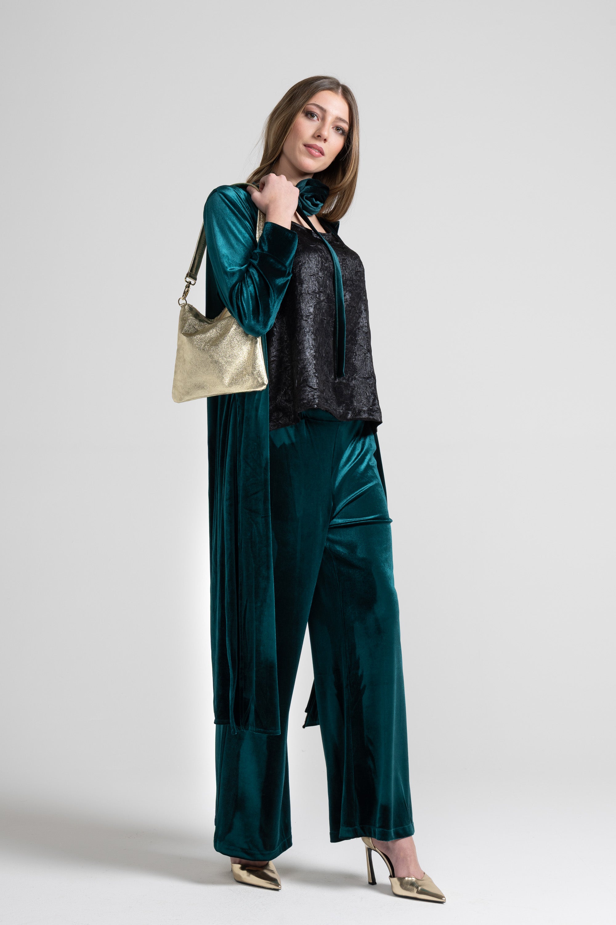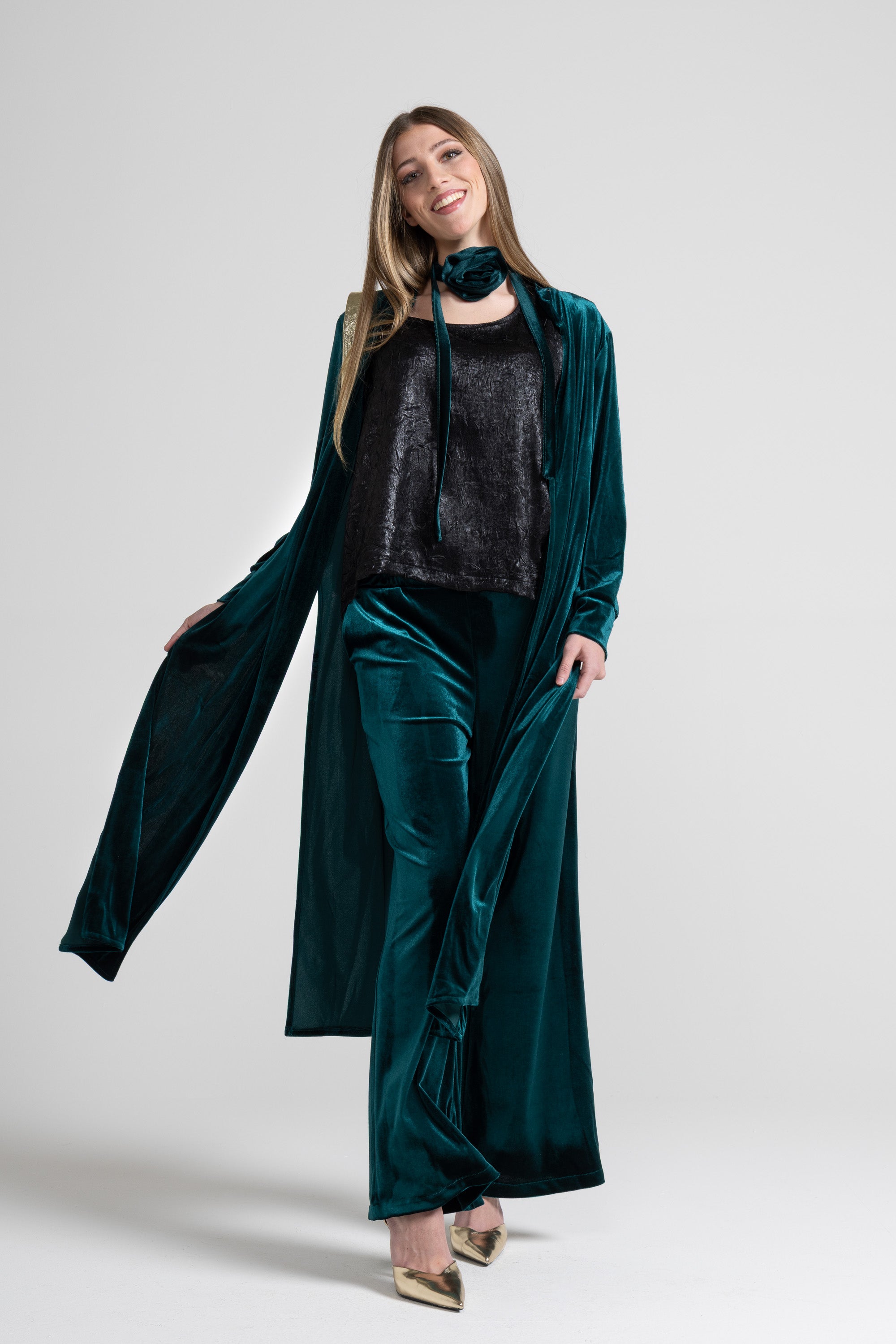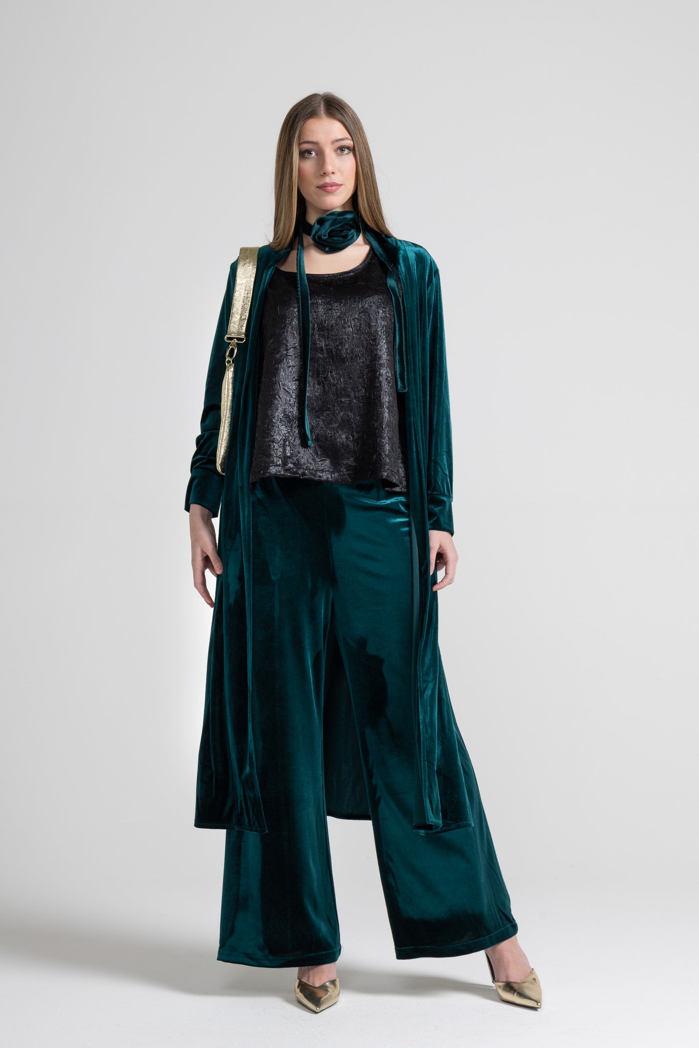 Palazzo trousers in soft and pleasant-to-the-touch stretch velvet, elastic waist for optimal comfort, slant pockets. Soft lining.