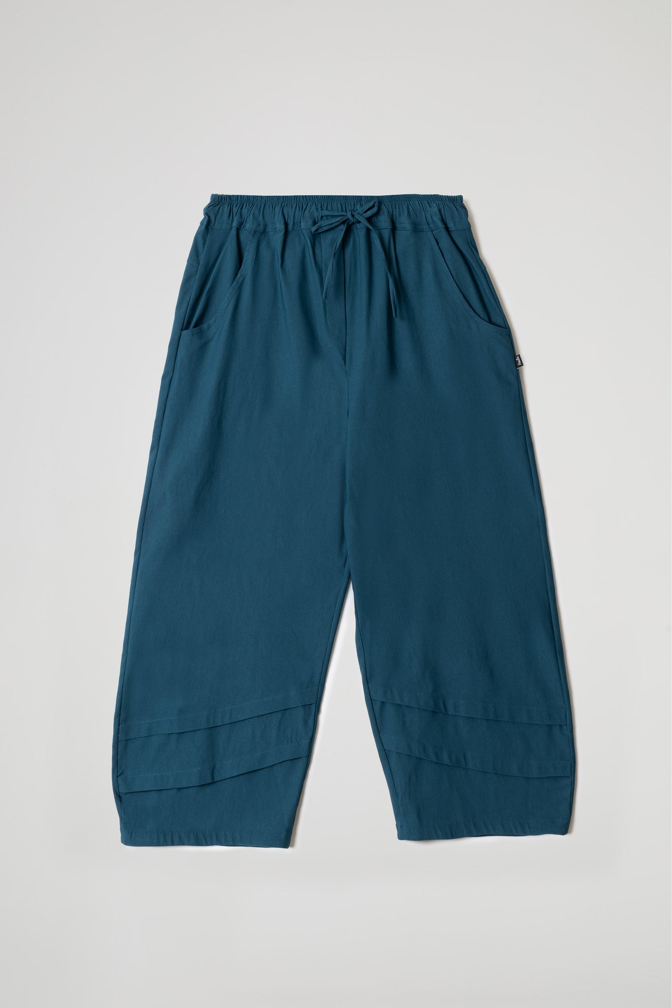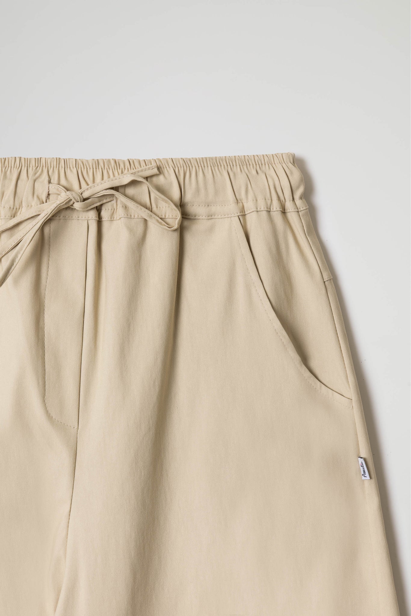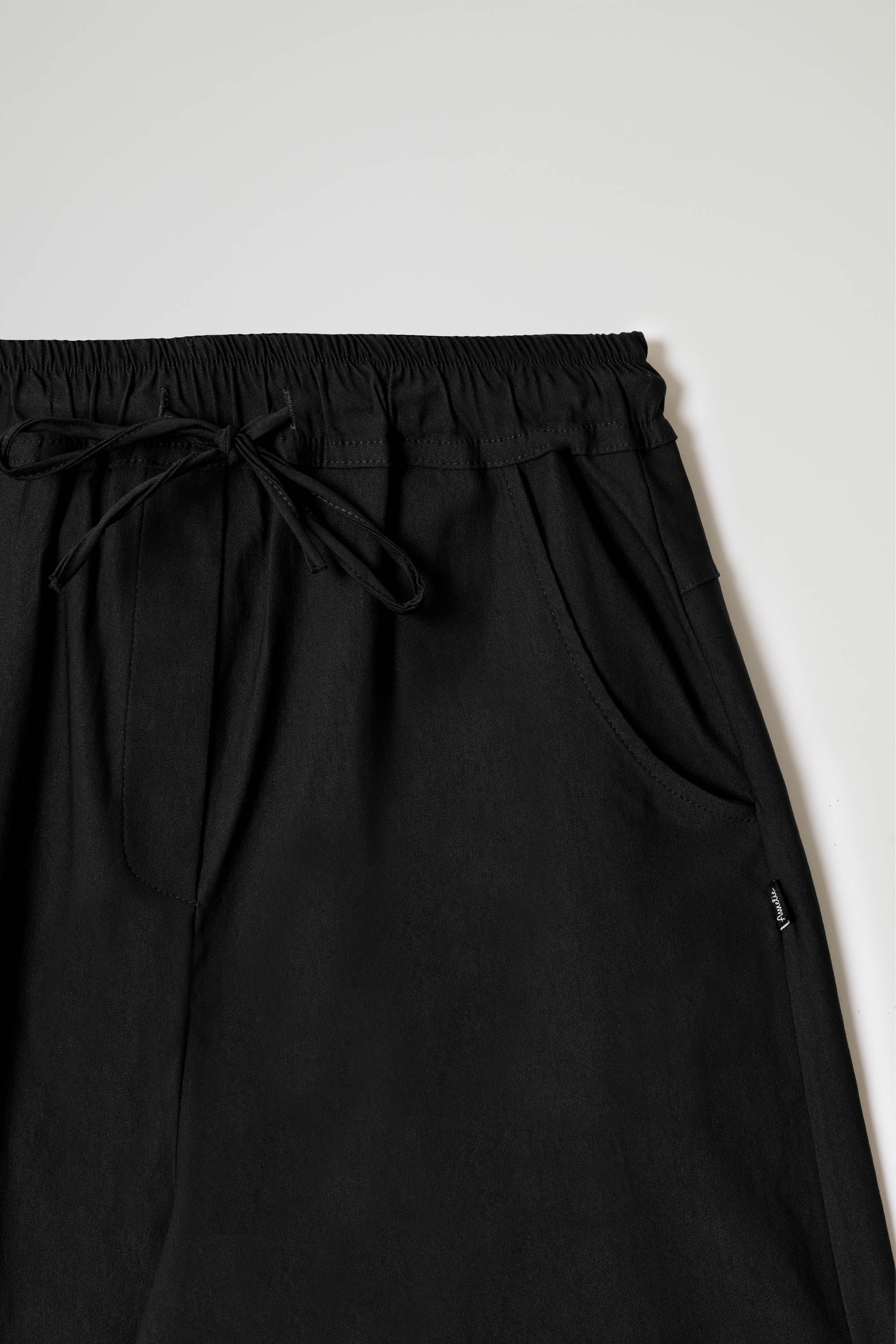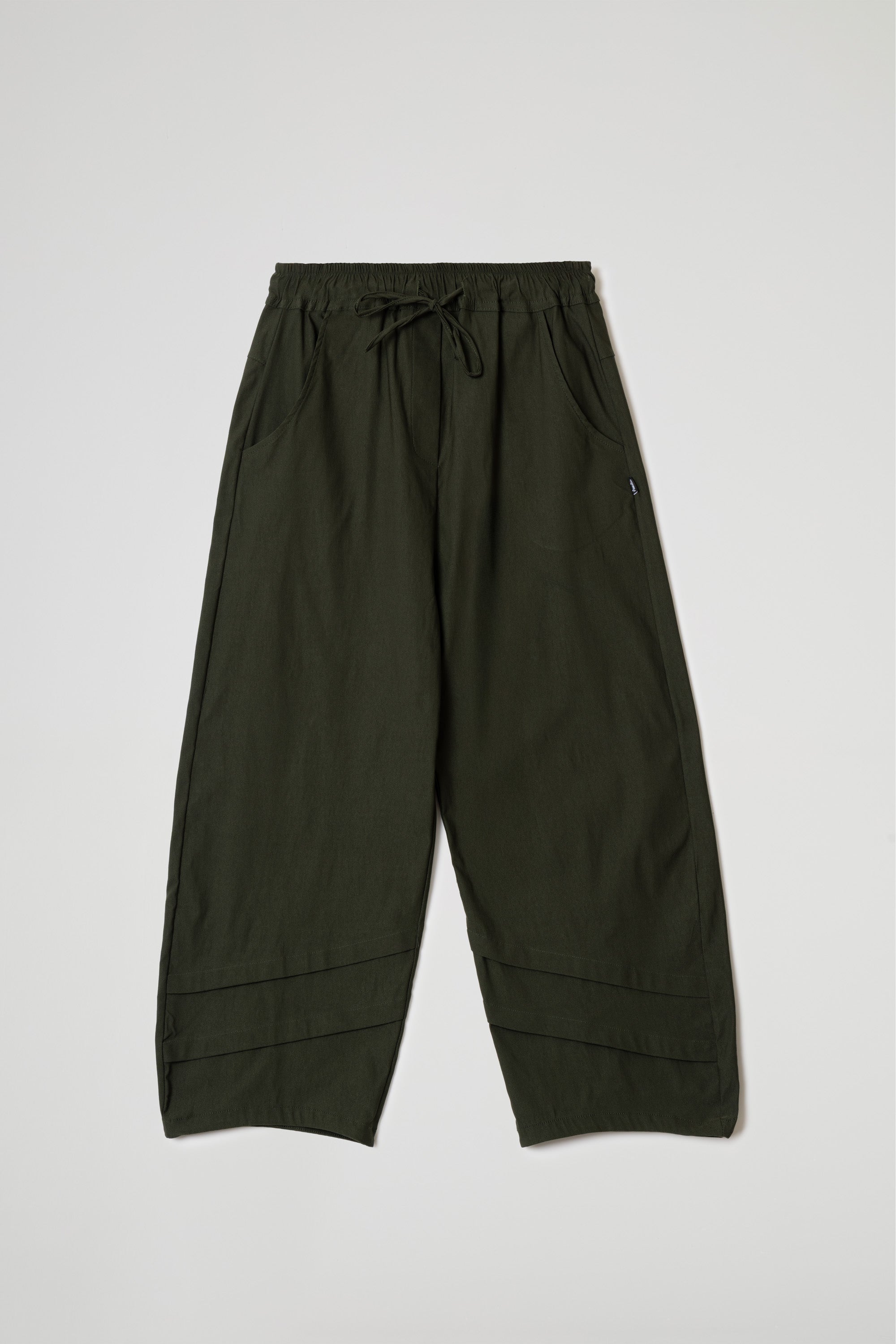 PANTALONE BAGGY IN TESSUTO BENGALINA DI VISCOSA ELASTICIZZATA, TASCHE SAGOMATE, TAGLIO CARRE RIBATTUTO SU RETRO, DETTAGLIO PIEGHI SU FONDO GAMBA.