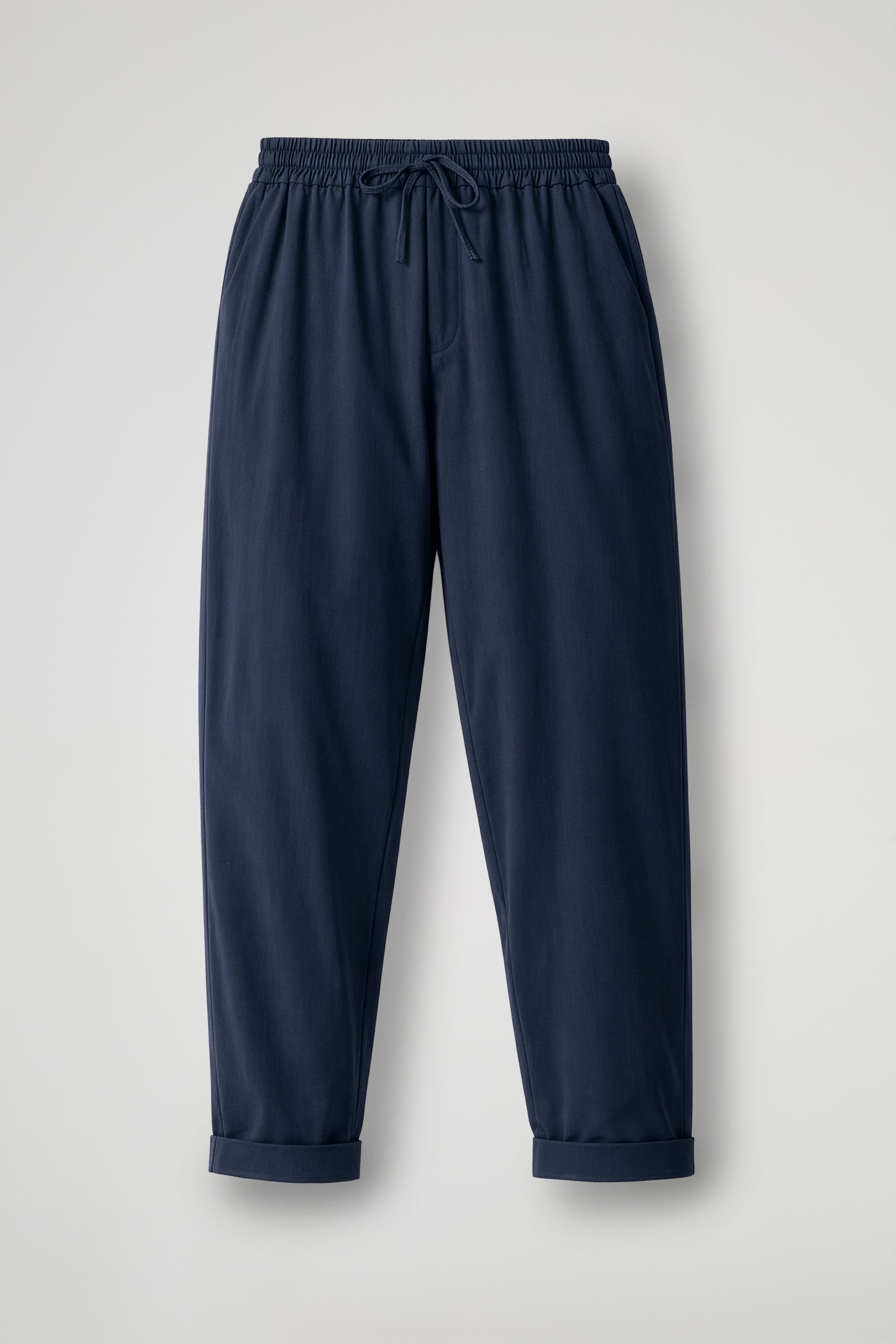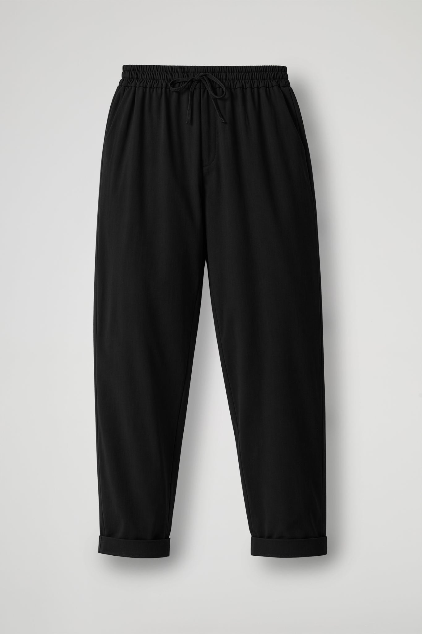 Pantalone regular in tessuto di viscosa, elastico con coulisse regolabile in vita, tasche alla francese, taglio a carrè sul retro, gamba dritta, risvolto sul fondo. Linea confortevole.