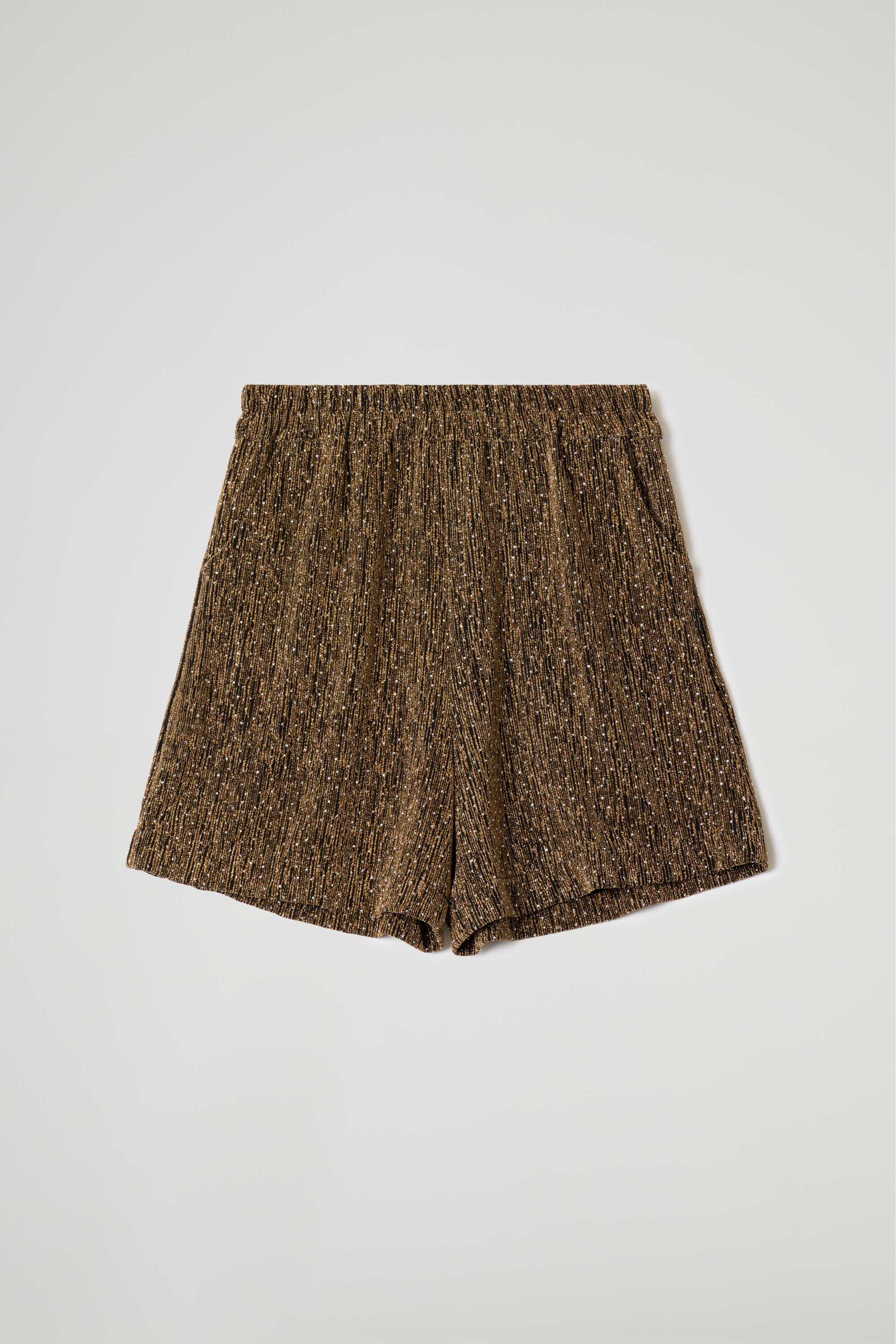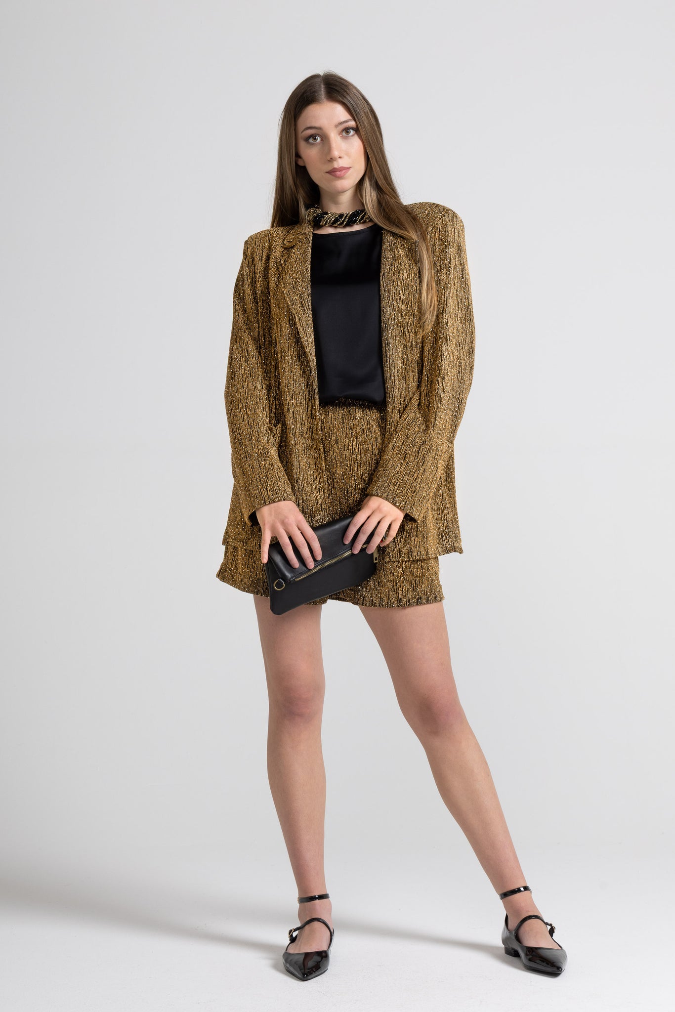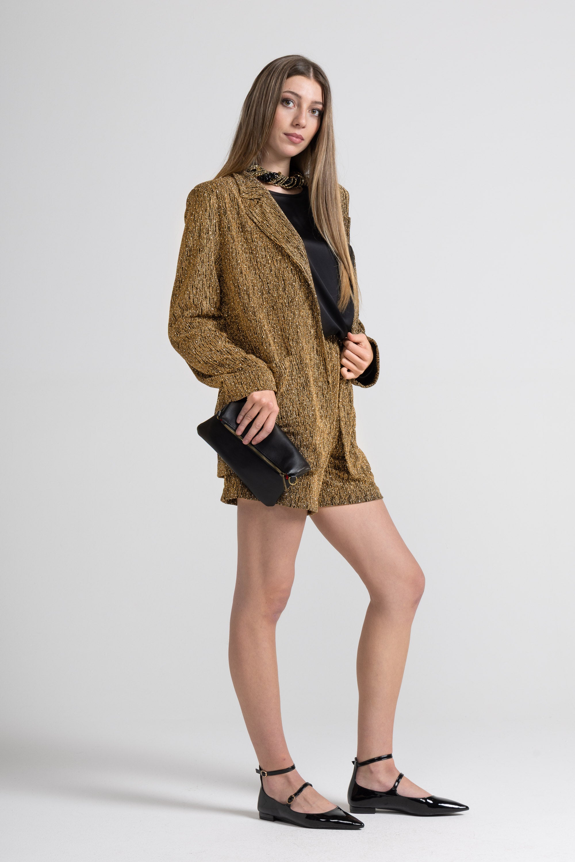 Pantaloncino elegante e luminoso, ideale per creare look raffinati e contemporanei con un tocco di brillantezza. Realizzato in un tessuto lurex fluido e leggero, unisce comfort e stile in un solo capo, perfetto per le serate speciali o per outfit coordinati dal mood glam.