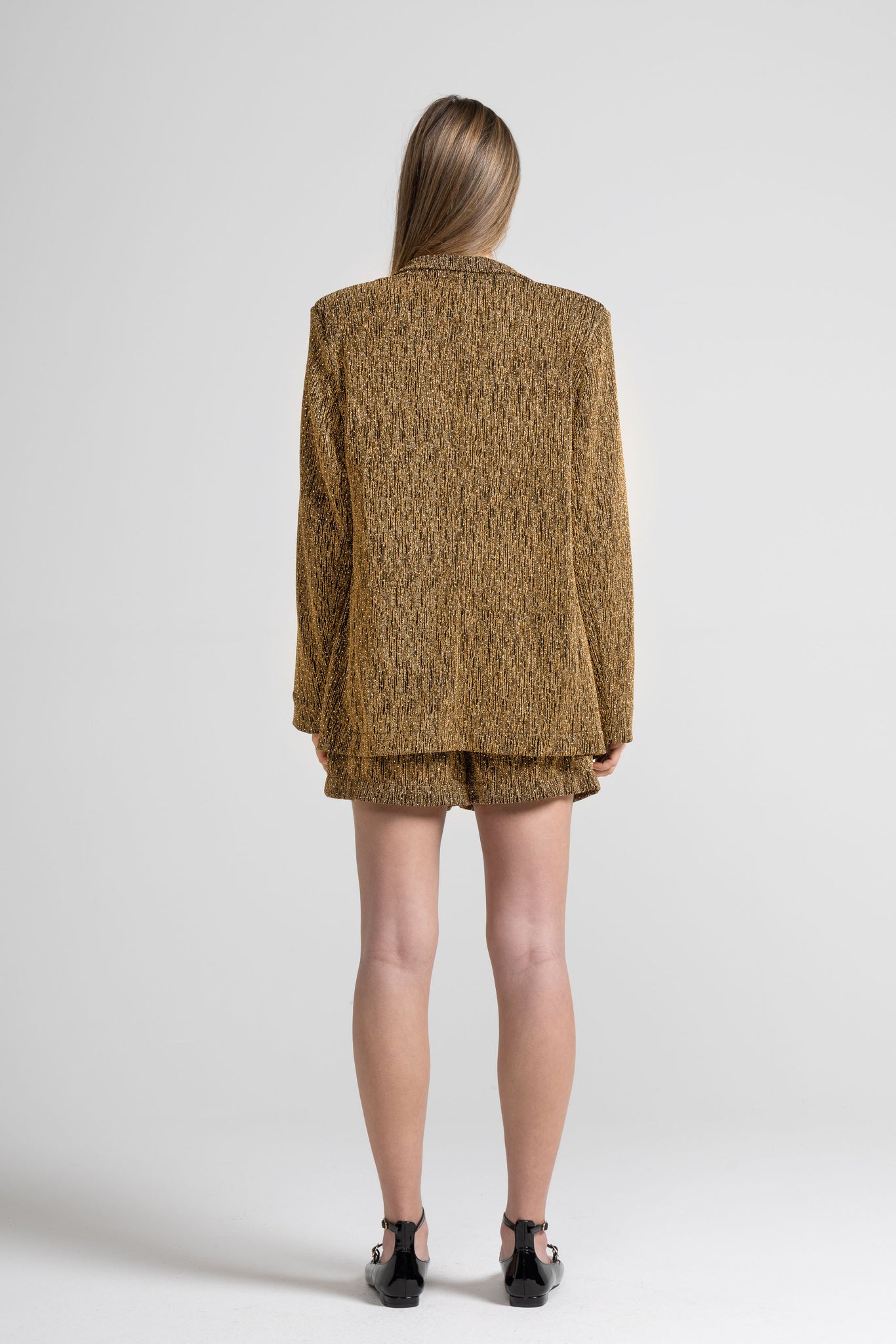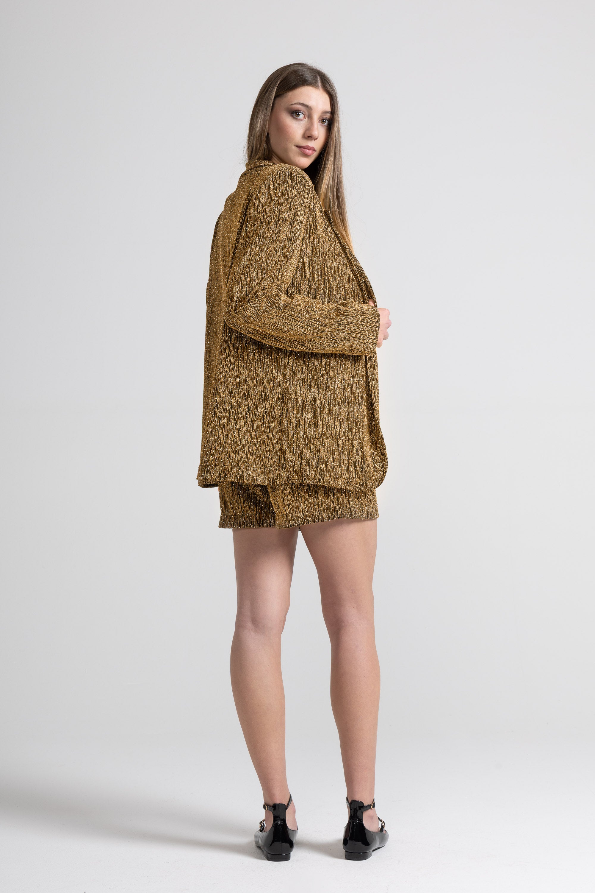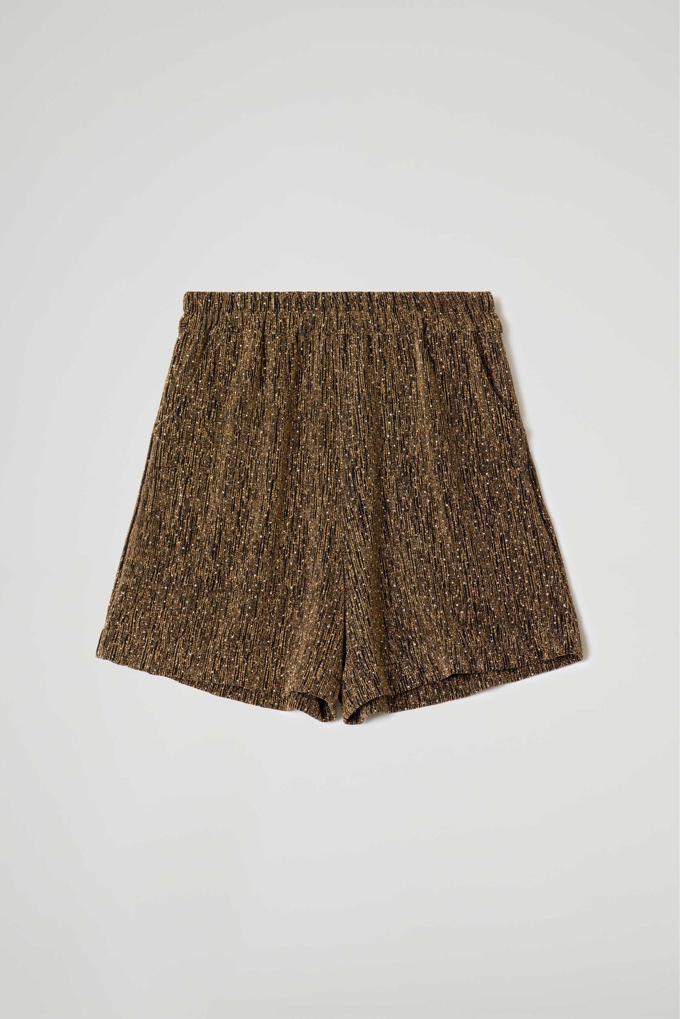 Pantaloncino elegante e luminoso, ideale per creare look raffinati e contemporanei con un tocco di brillantezza. Realizzato in un tessuto lurex fluido e leggero, unisce comfort e stile in un solo capo, perfetto per le serate speciali o per outfit coordinati dal mood glam.