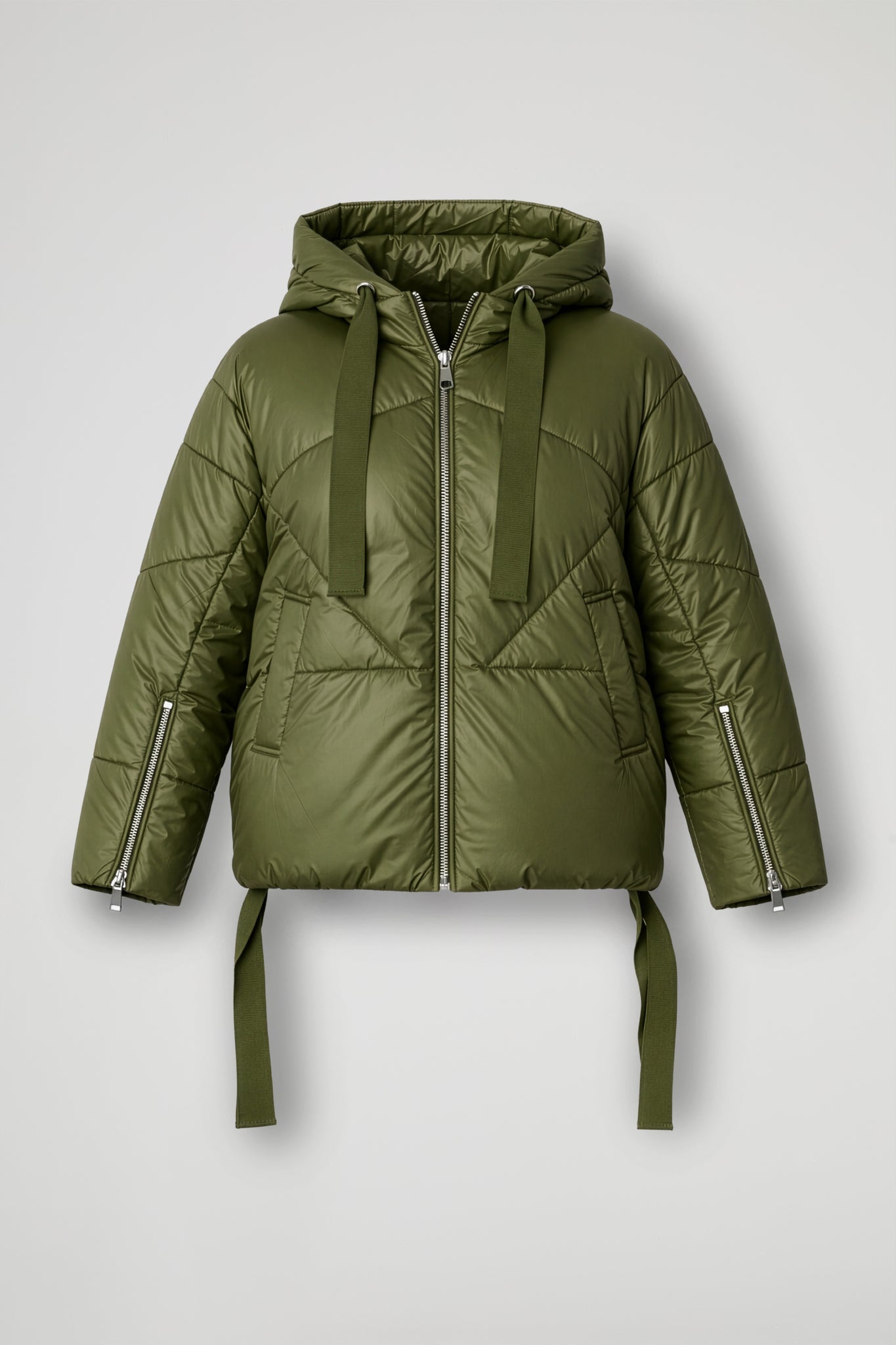 Piumino corto trapuntato, cappuccio regolabile con nastro tono su tono , manica lunga con apertura zip sul fondo, chiusura frontale con zip, tasche laterali con patta inclinata, coulisse a nastri regolabile sul fondo. Linea ampia