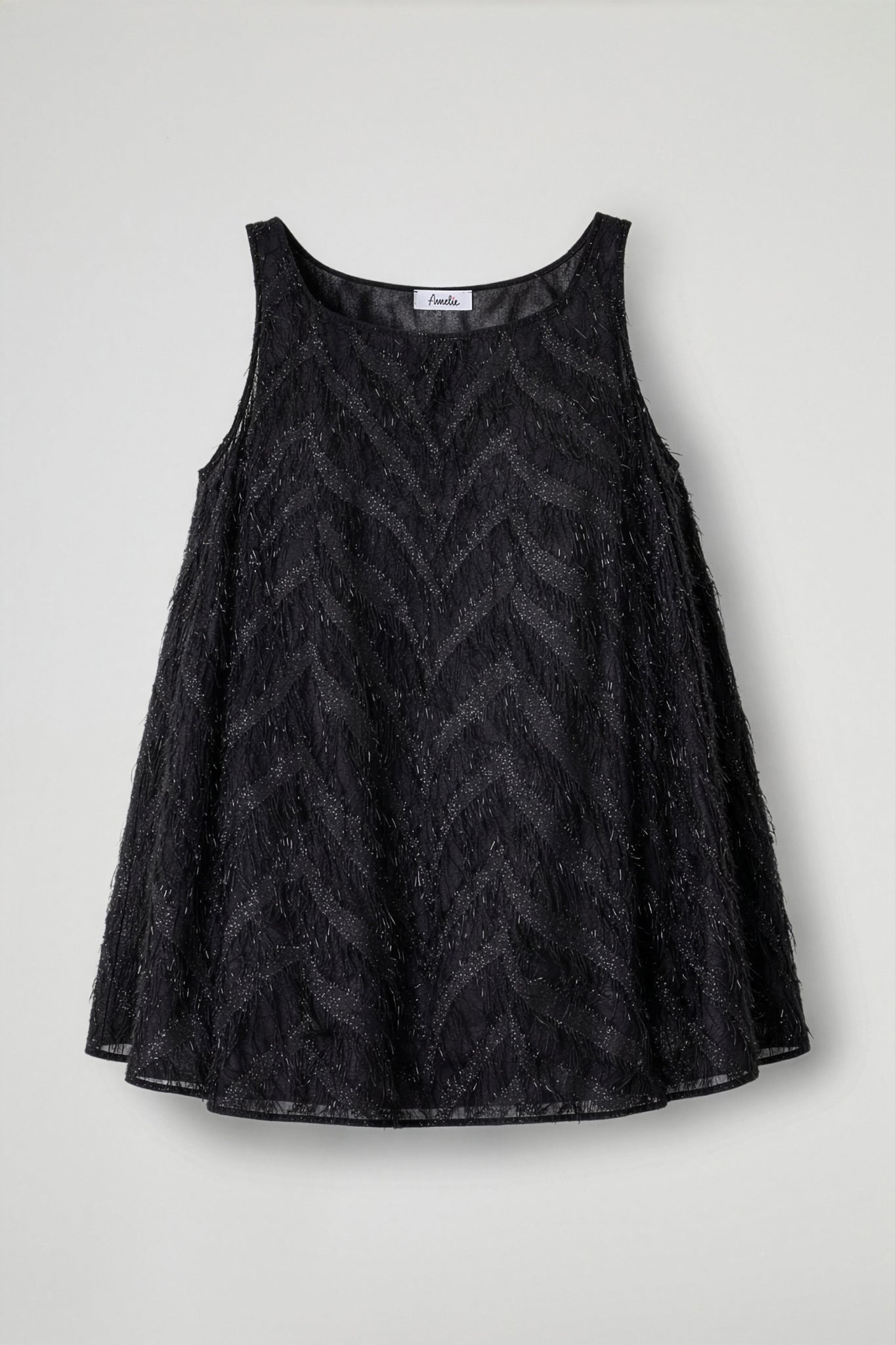 Sleeveless tank top in lightweight, semi-sheer fabric, enriched with a micro-lurex design that discreetly reflects the light while the plumage texture creates depth and movement with every step; The design is conceived to be comfortable yet dramatic: clean round neckline, wide shoulder straps and a soft, flared line that glides on the body without marking, with a slightly rounded hem that follows the silhouette.