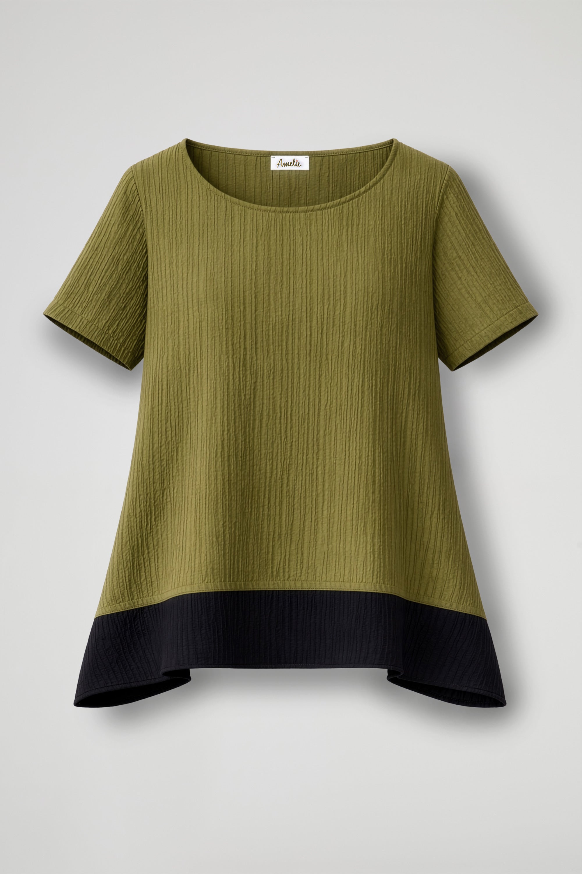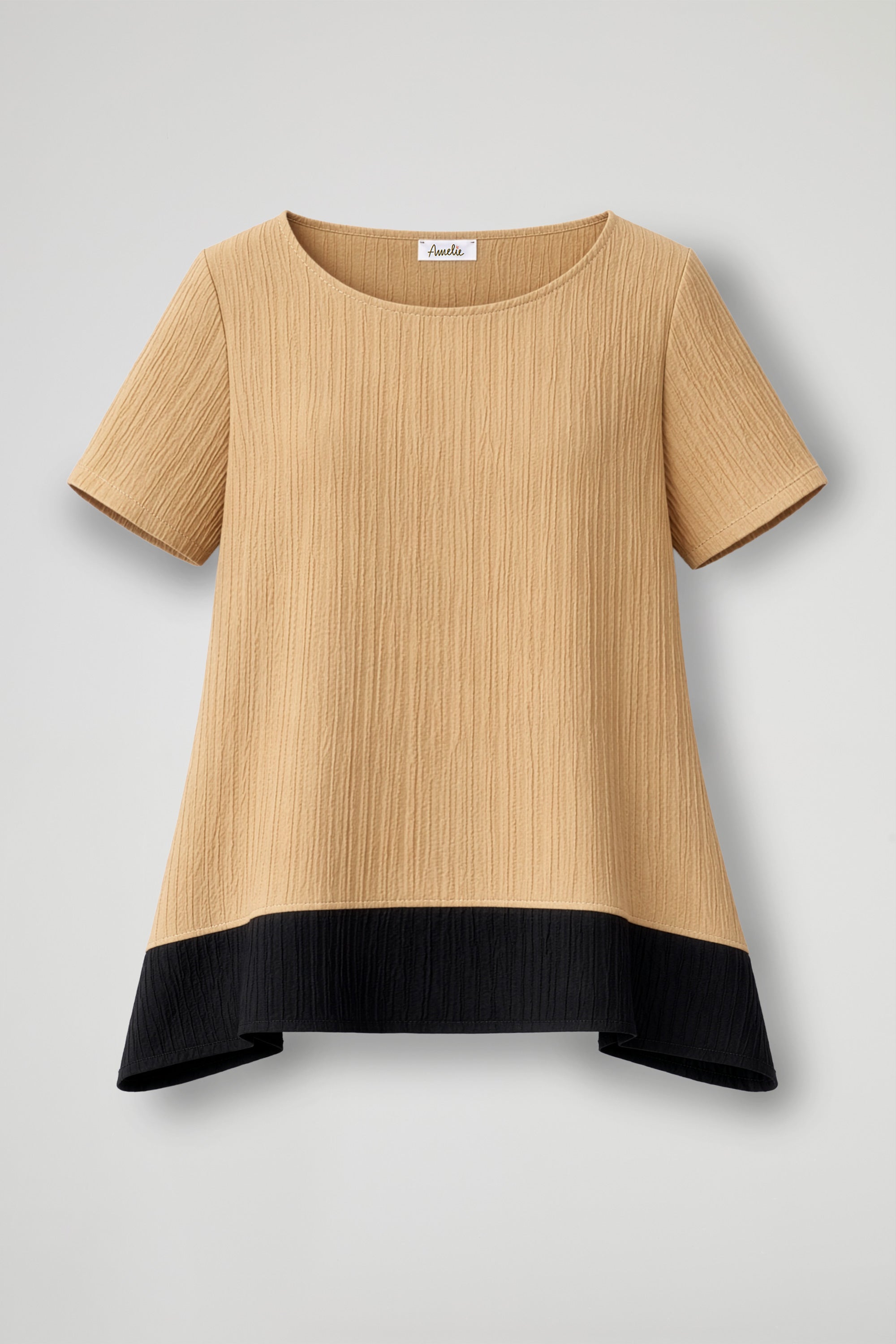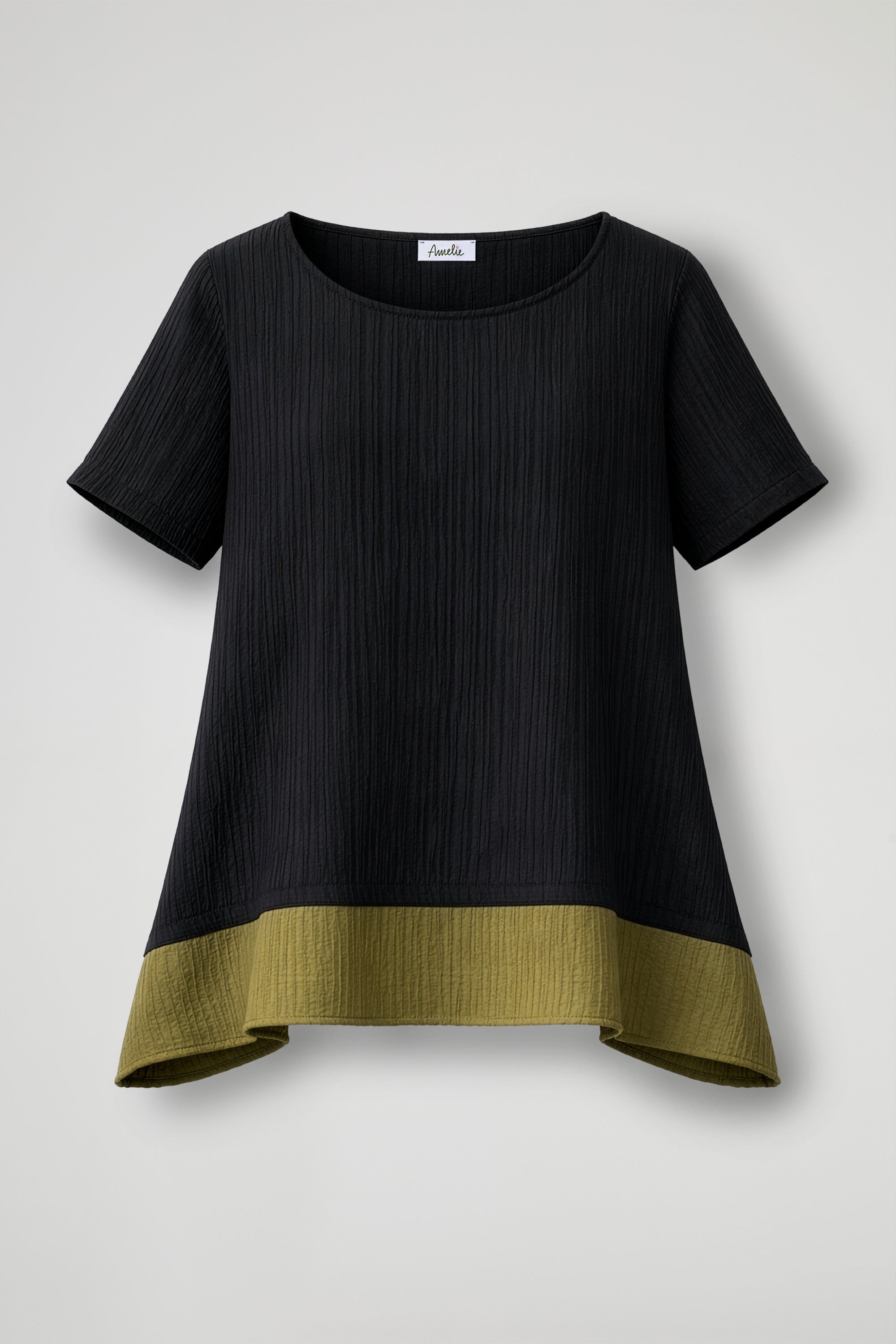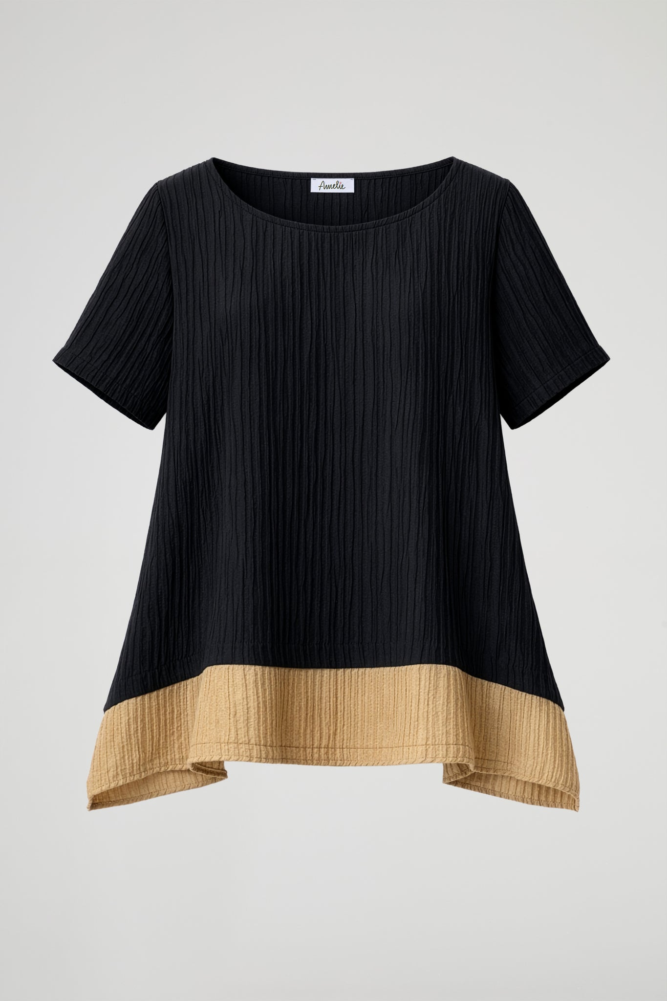 A modern and refined design top, made of lightweight textured fabric that adds movement to the garment; it stands out for its elegant chromatic contrast that creates a very contemporary double-layer effect. The trapeze cut and asymmetrical hem enhance the silhouette, making it suitable for both casual and more sophisticated looks.