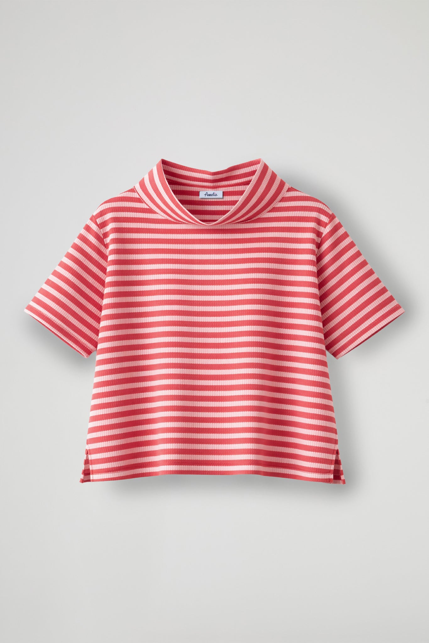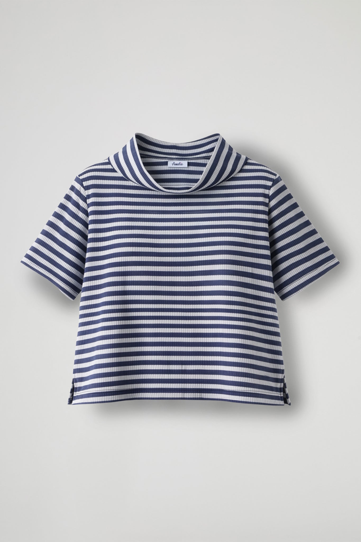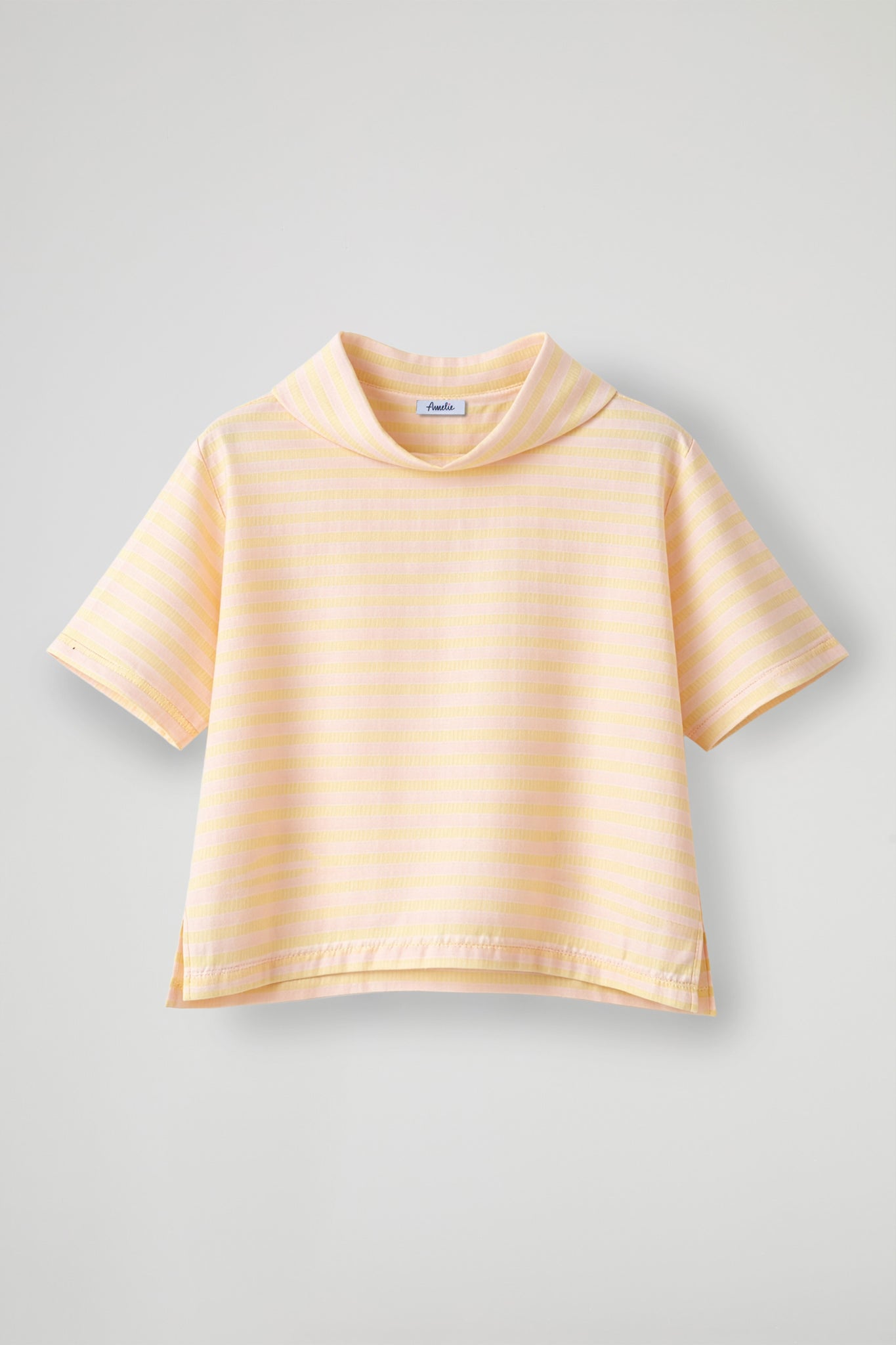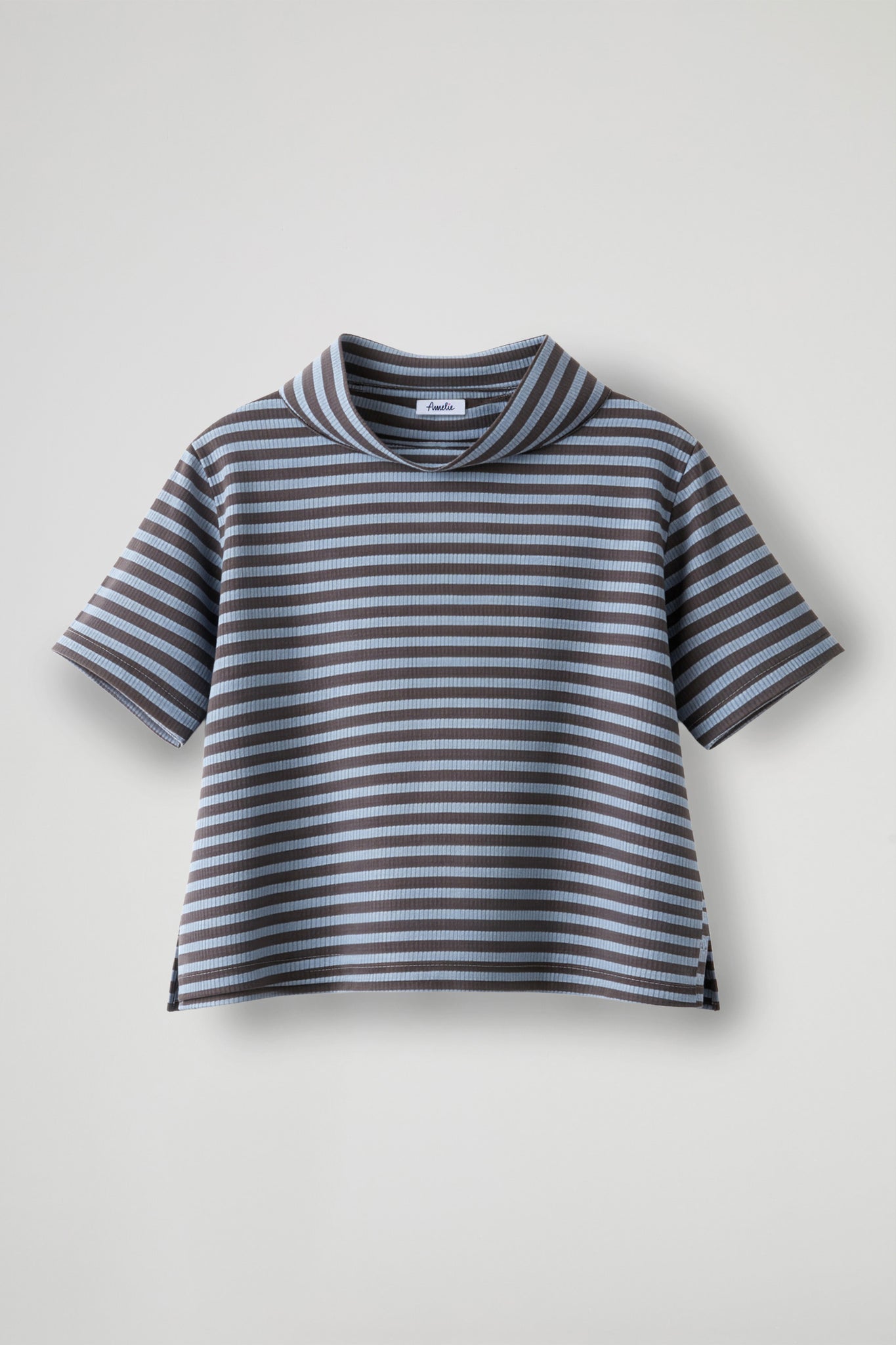 Striped top with a fresh and contemporary feel. Made from soft and comfortable fabric, it features short sleeves and a distinctive, slightly wide, soft collar that adds movement and character. The fit is comfortable and slightly boxy, with small side slits at the hem for greater freedom of movement. A casual and versatile piece, perfect for completing everyday looks with a touch of style.