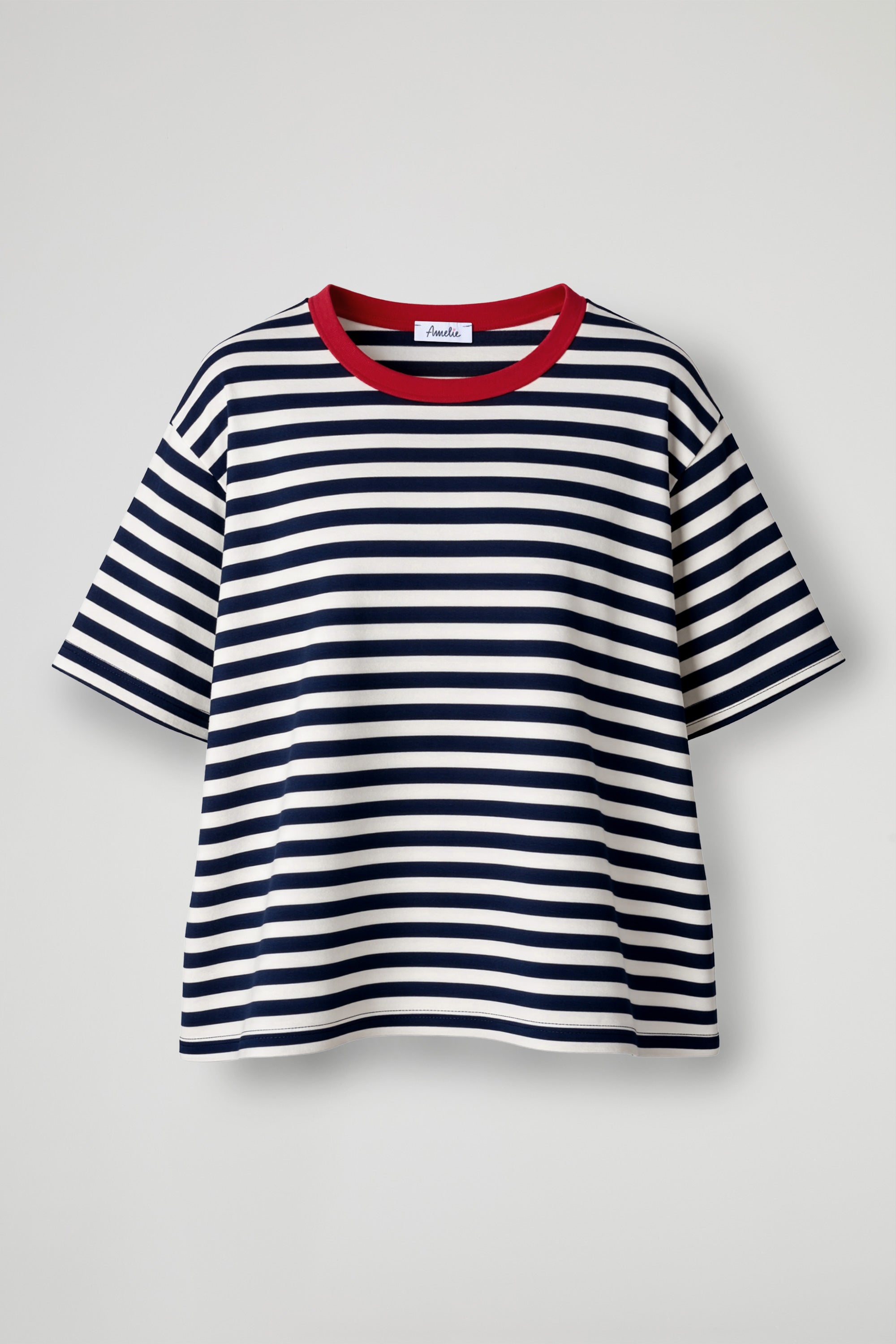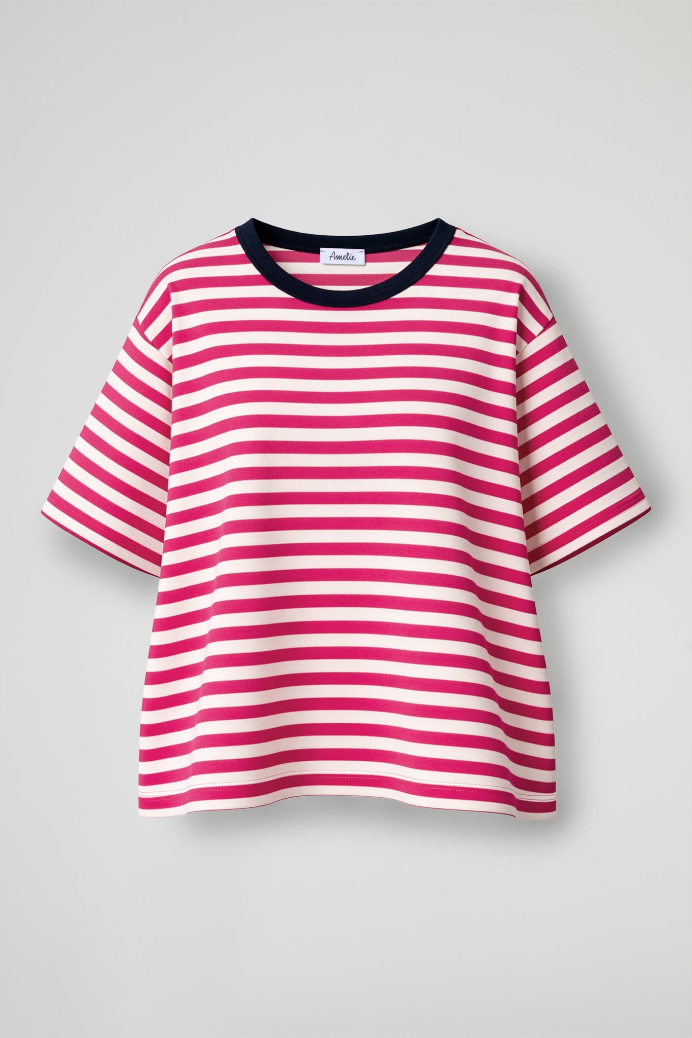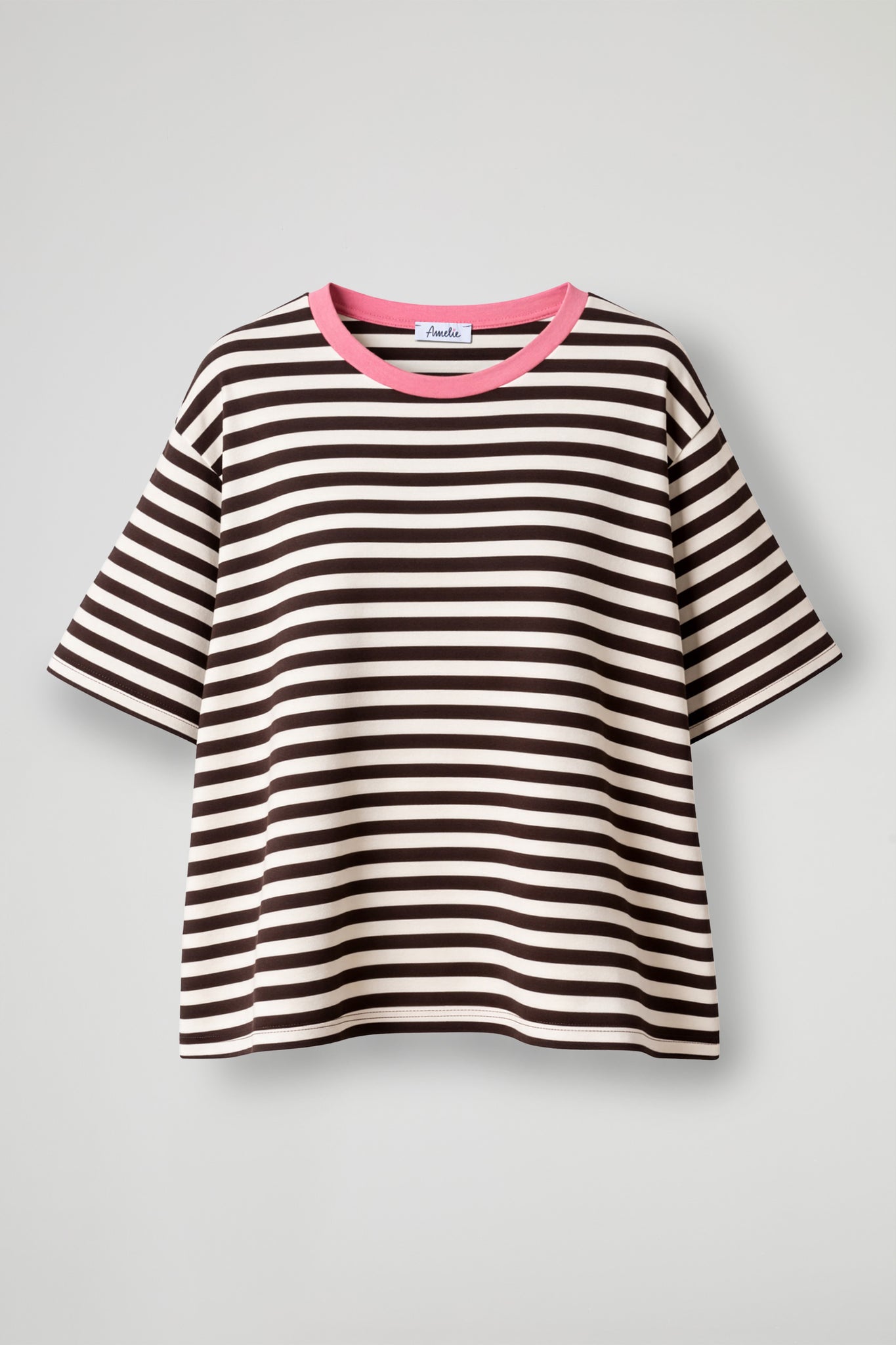 T-shirt over, girocollo a contrasto, spalla scesa, manica corta, righe su tutto il capo, orlo pulito sul fondo. Linea morbida