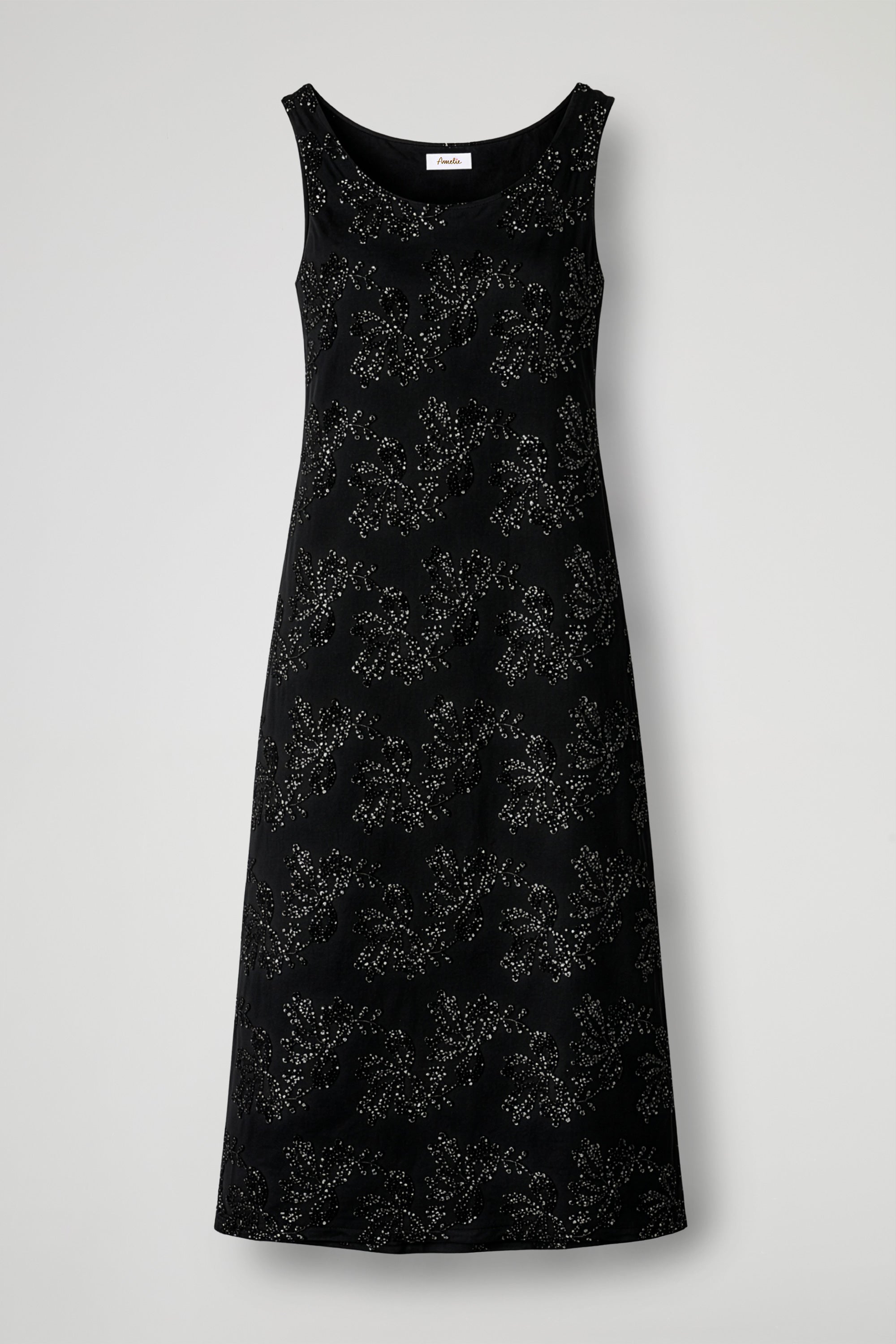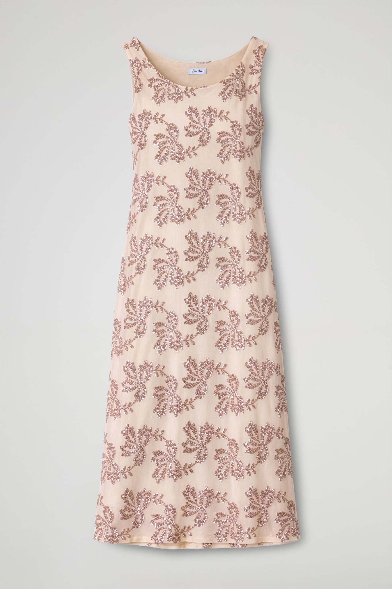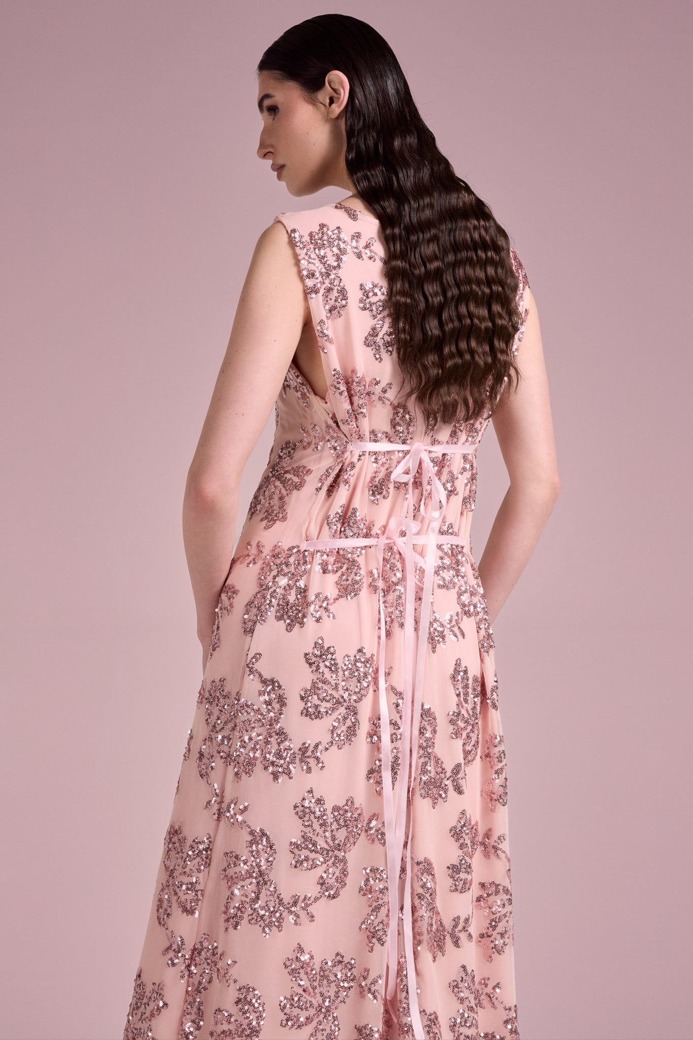 Abito lungo dalla linea leggermente svasata impreziosito da ricami in paillettes tono su tono che disegnano eleganti motivi floreali, per un effetto luminoso e sofisticato; Lo scollo tondo, pulito ed essenziale, è accompagnato da spalline larghe che garantiscono comfort; Elemento distintivo è la presenza sul retro di sottili nastri regolabili in vita, annodabili a fiocco, che permettono di definire il punto vita e personalizzare la vestibilità.