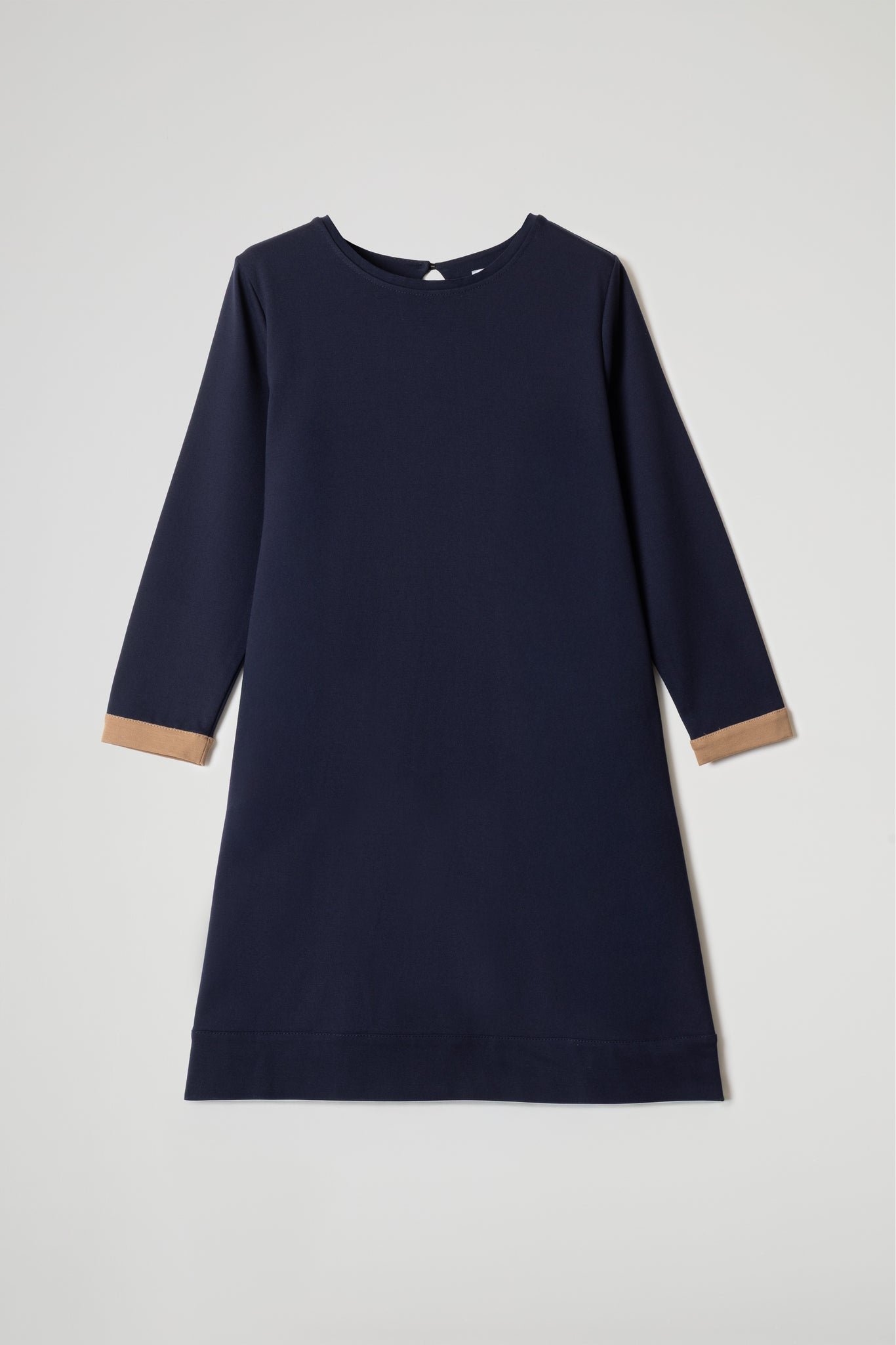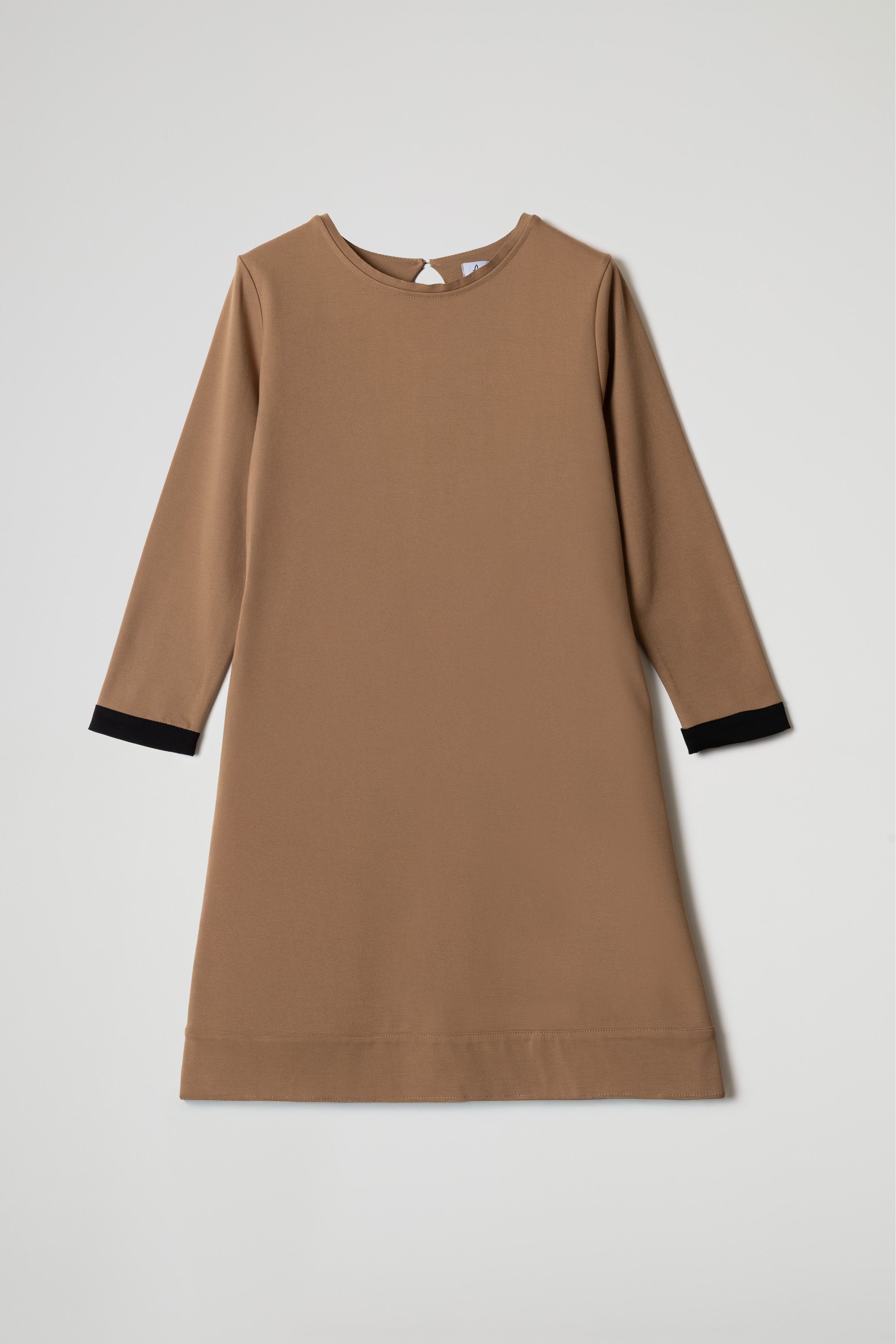 Abito midi, tessuto di viscosa elasticizzato, girocollo pulito, apertura a goccia sul retro con piccolo bottone centrale, manica lunga rifinita con polsino a contrasto colore, tasche a filo laterali, taglio a trapezio, orlo ribattuto alto sul fondo.